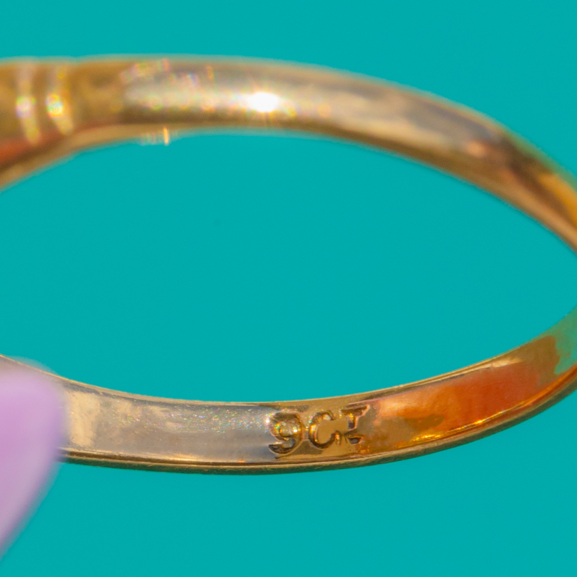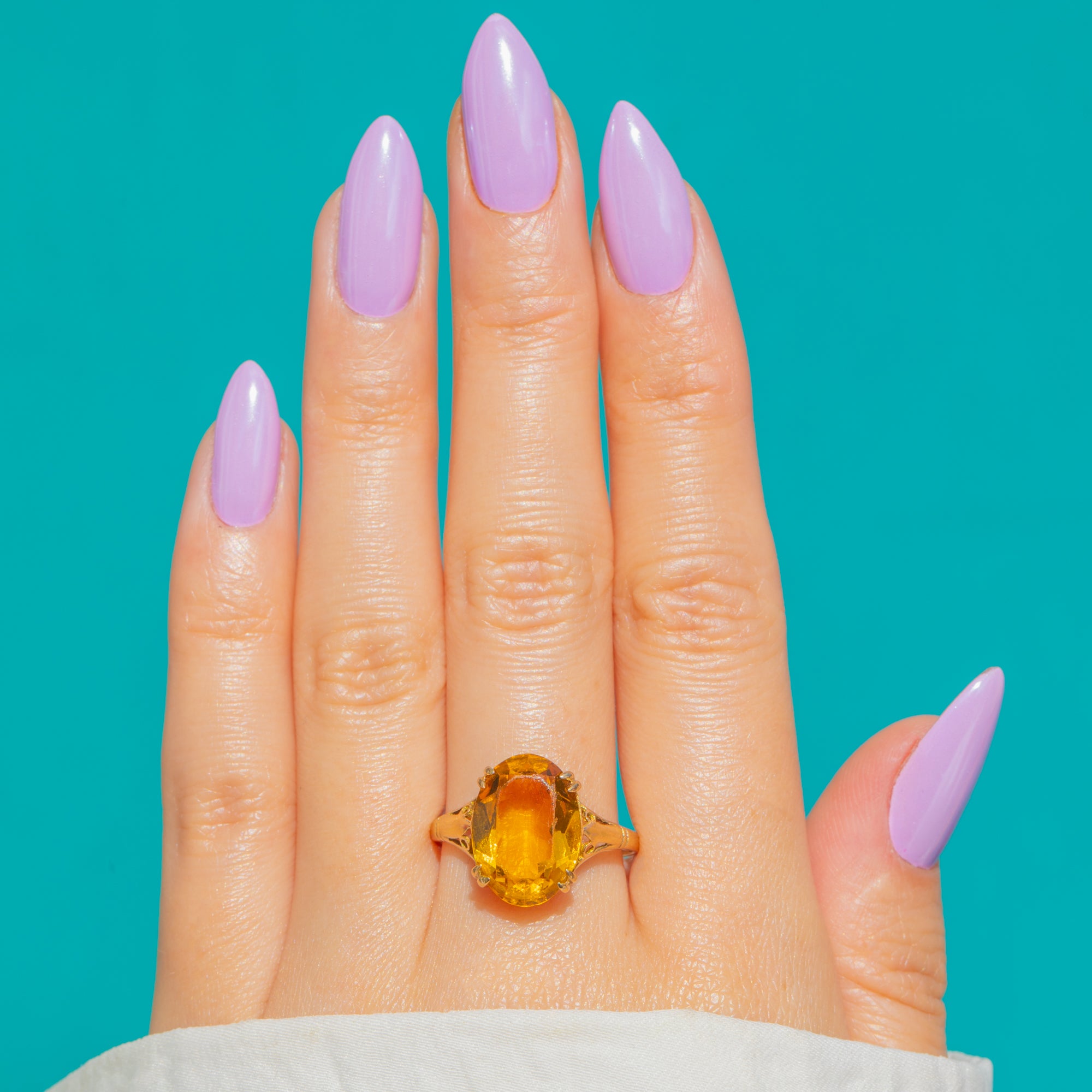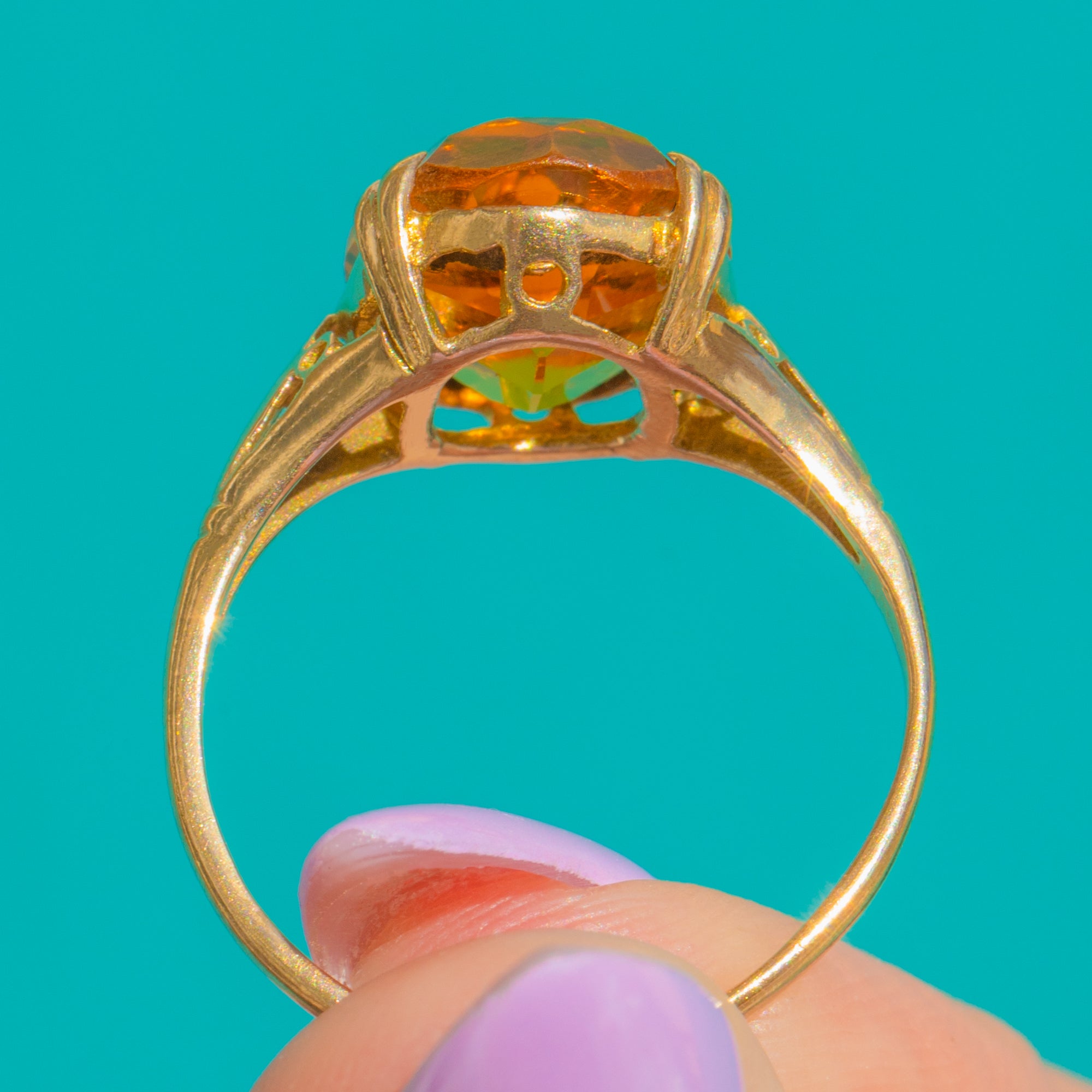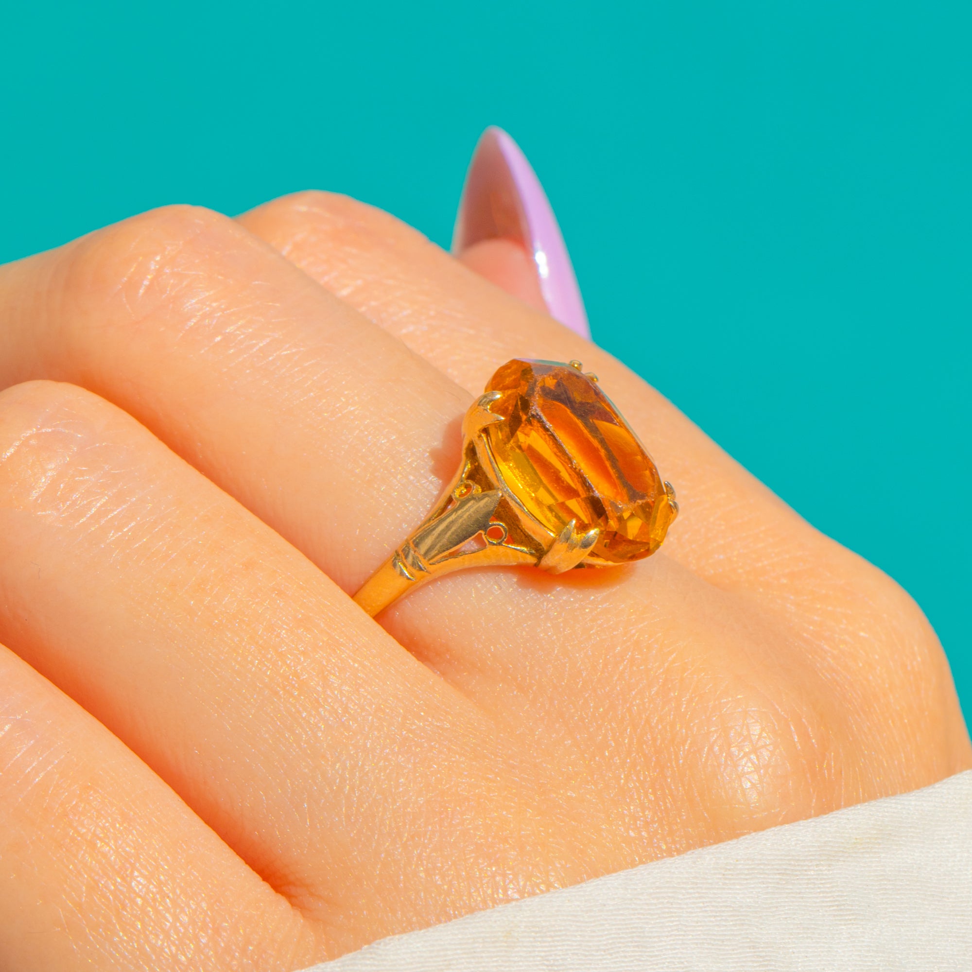 VERY GOOD: The Citrine Paste shows light facet wear with minor surface abrasions and a tiny nibble to one edge; colour remains bright and lively. The 9ct Gold setting has light surface scratches from age and wear; claws show gentle wear but hold the stone securely. The shank is sound with an extremely slight warp not noticeable during wear, and no obvious resizing or repairs observed.