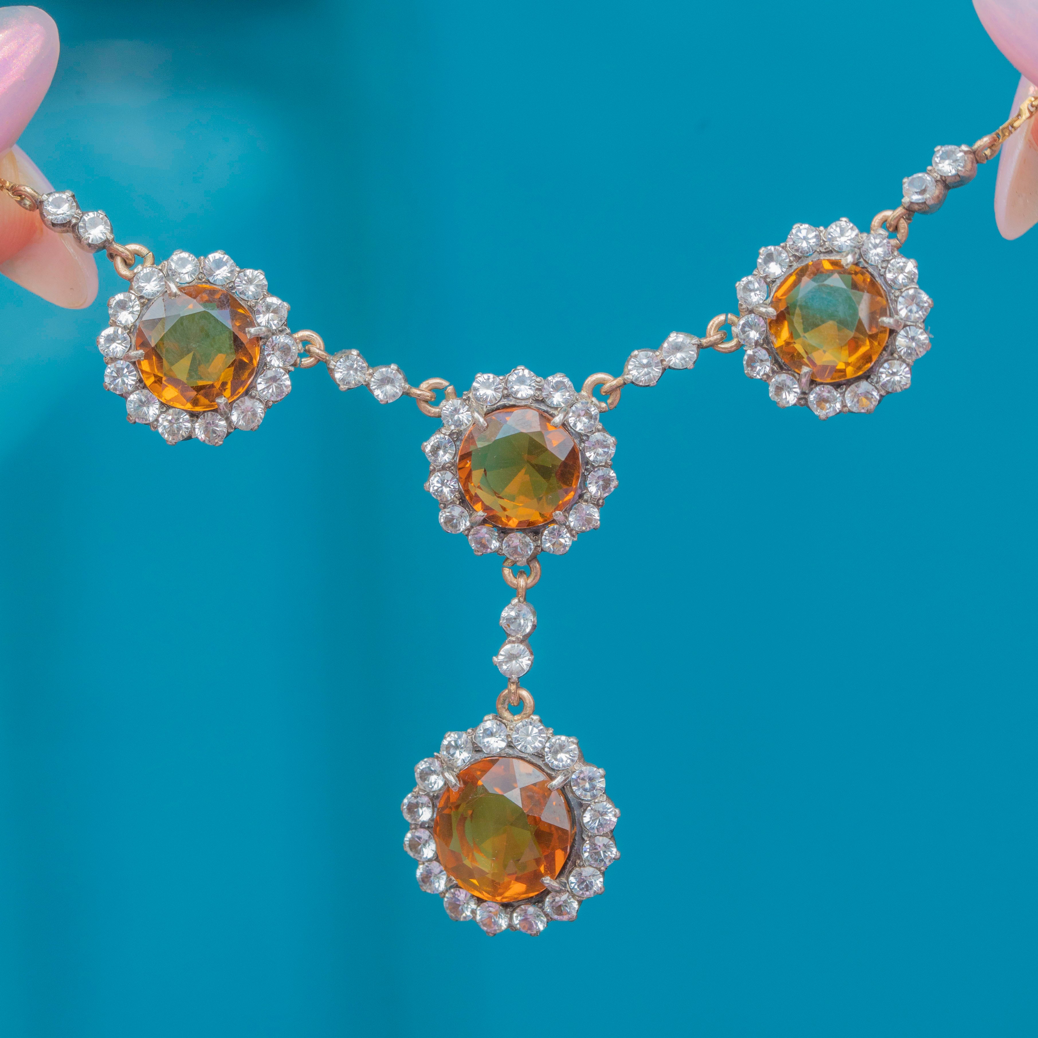 Art Deco 9ct Gold Citrine & White Sapphire Drop Necklace