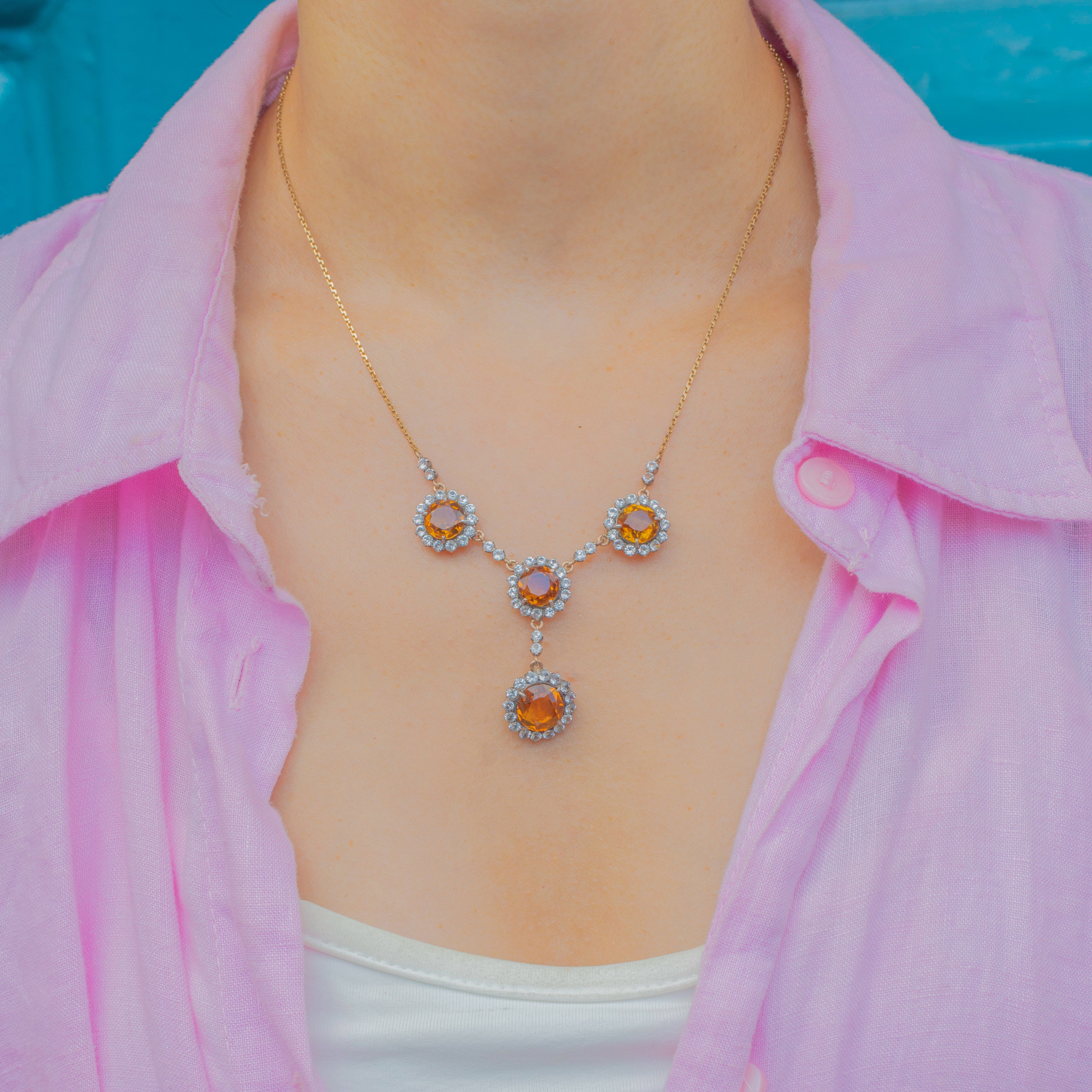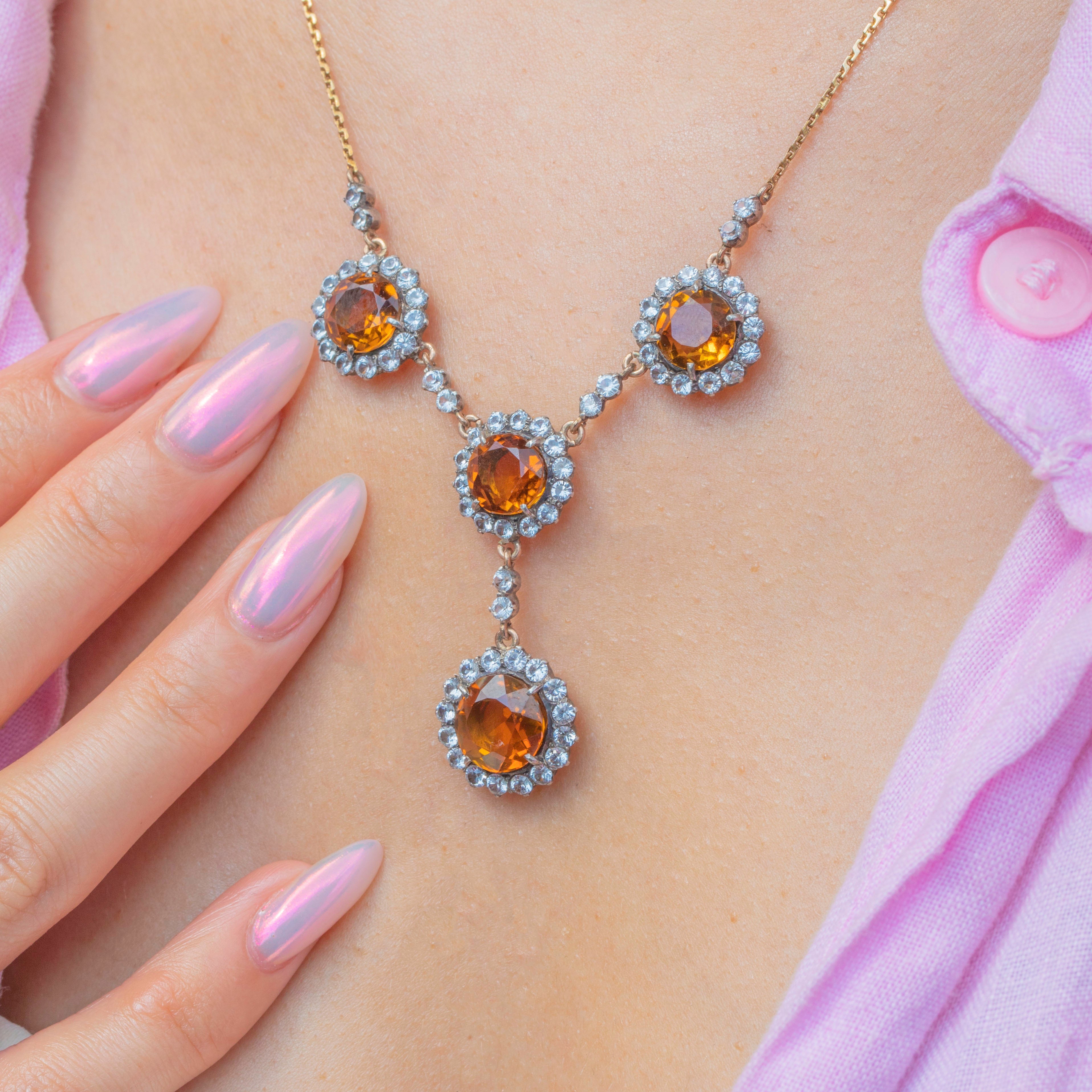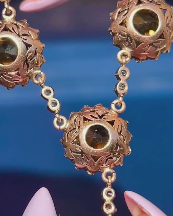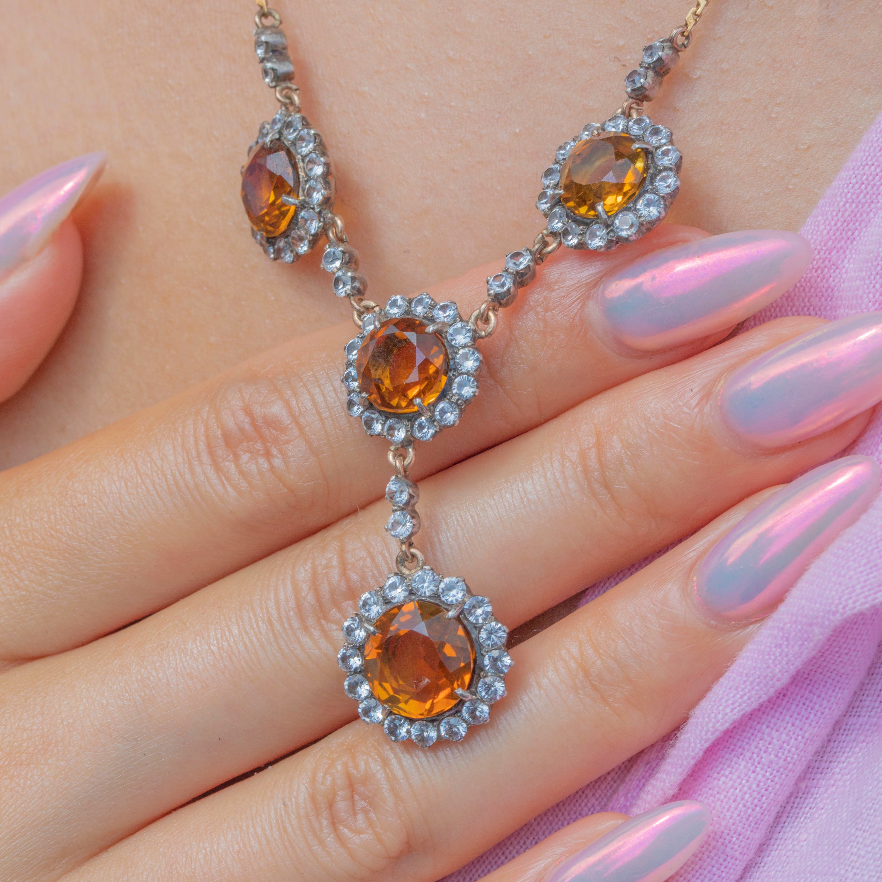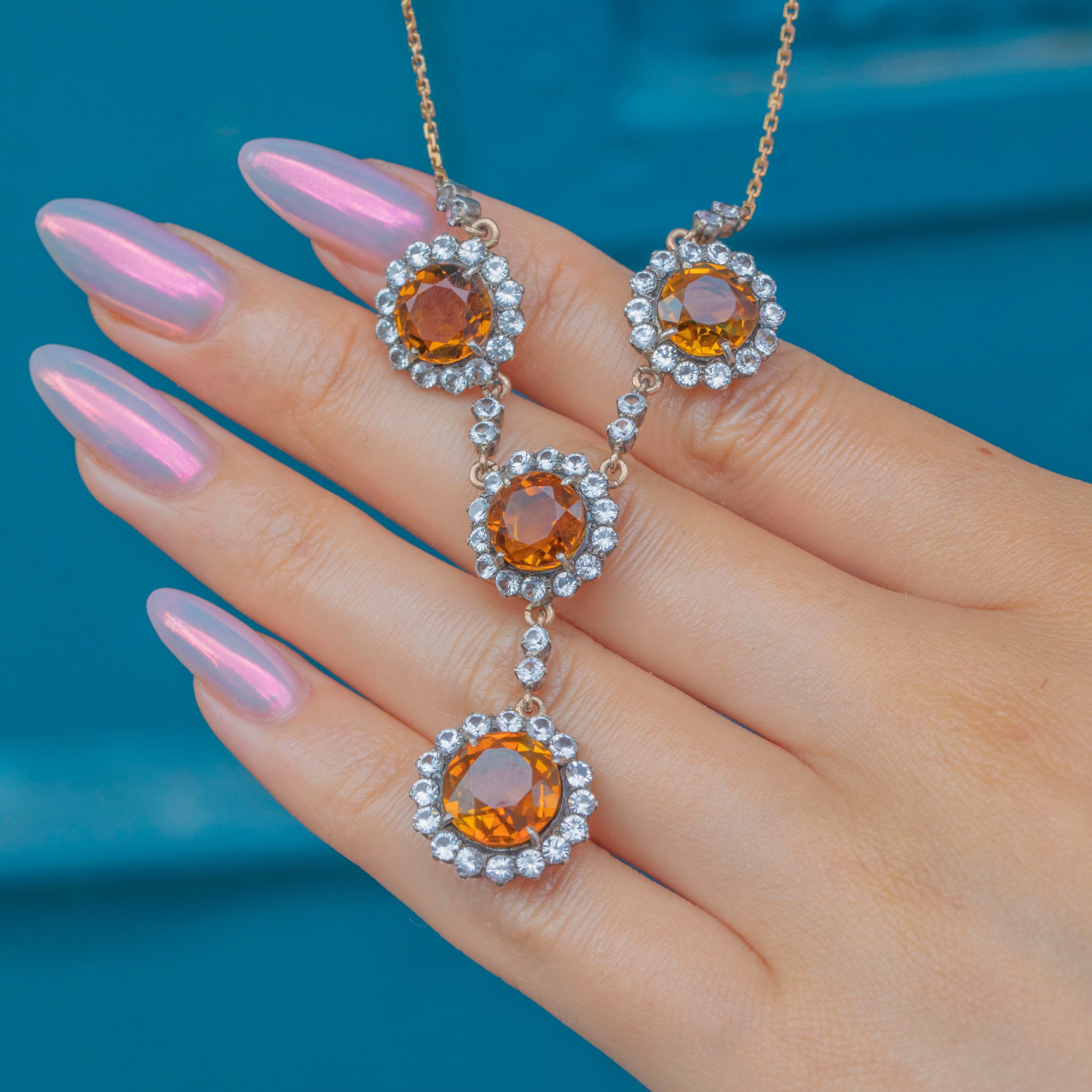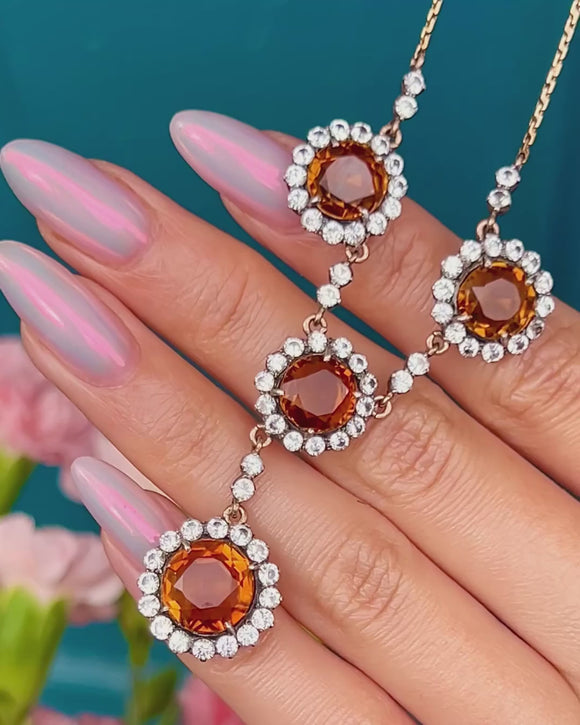 A radiant antique drop necklace, adorned with 7.25 carats of plump Citrine gemstones haloed by bright white Sapphires!