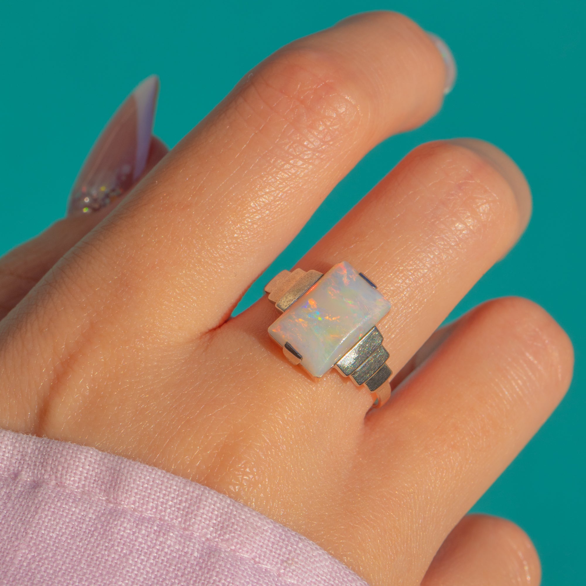 This Art Deco Opal solitaire ring is a beautiful example of 1920s design, combining clean geometric lines with soft, luminous colour. The natural Opal displays an ethereal play of colour, its elongated shape creating a striking and elegant presence on the hand.