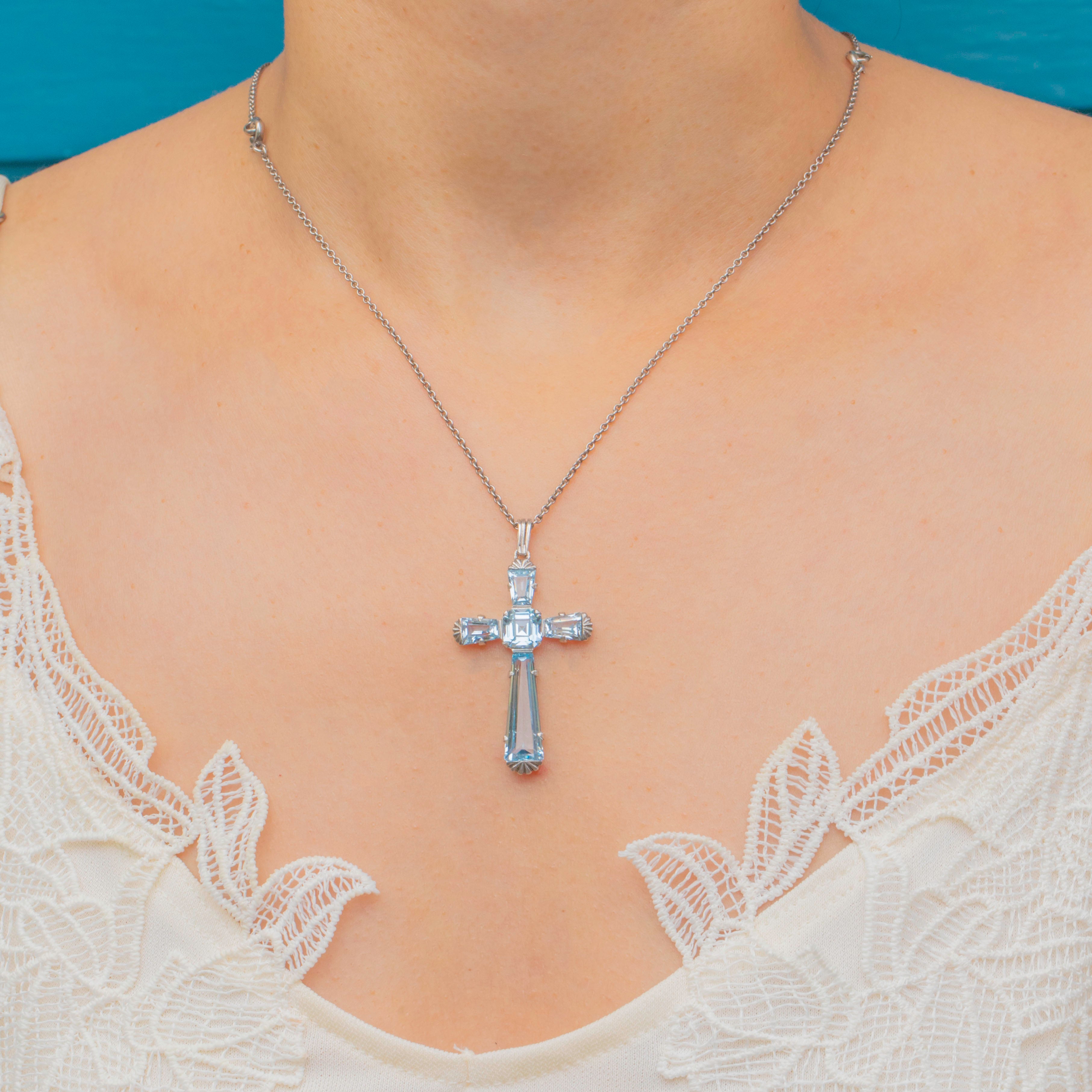 Art Deco Aquamarine Cross Pendant with 18" Chain