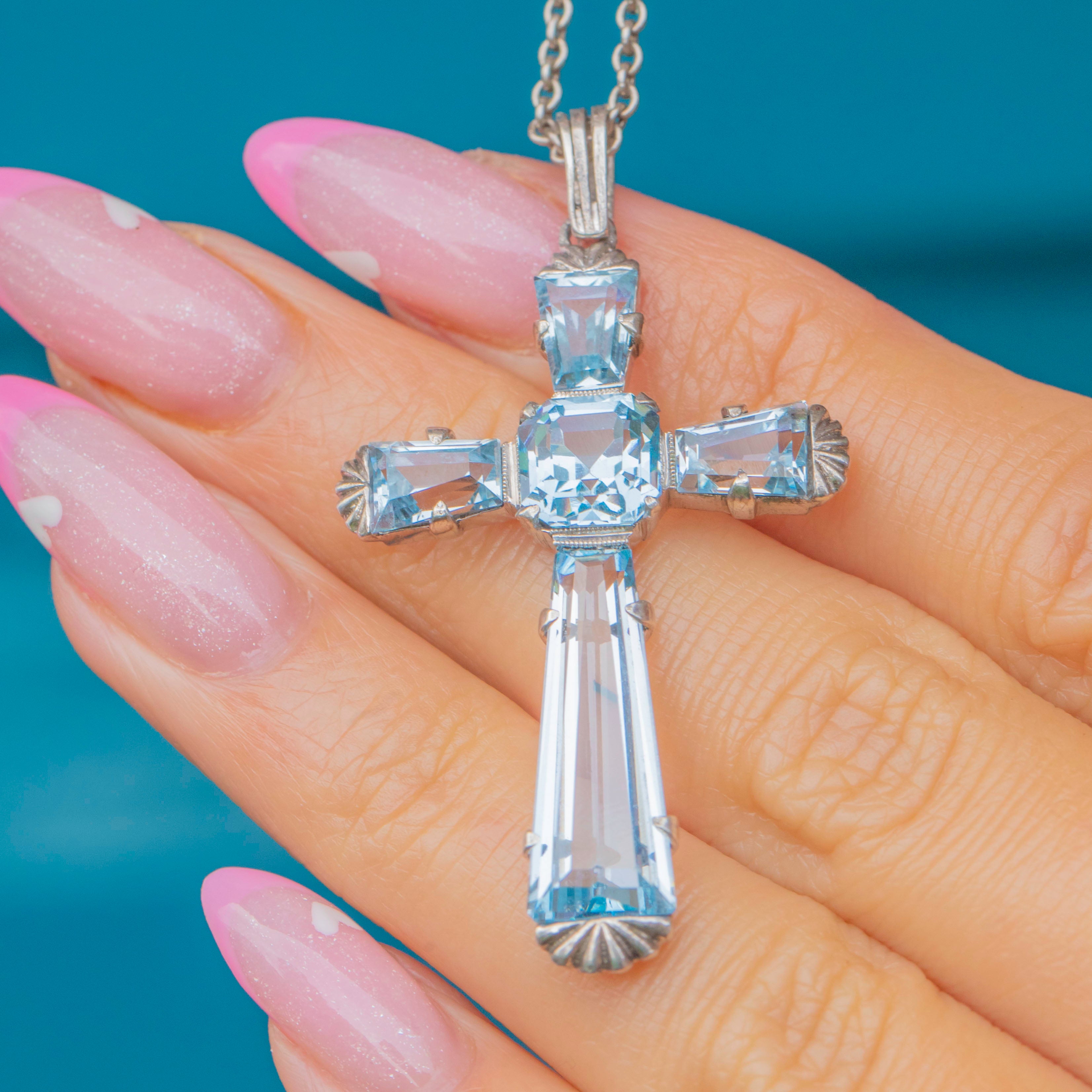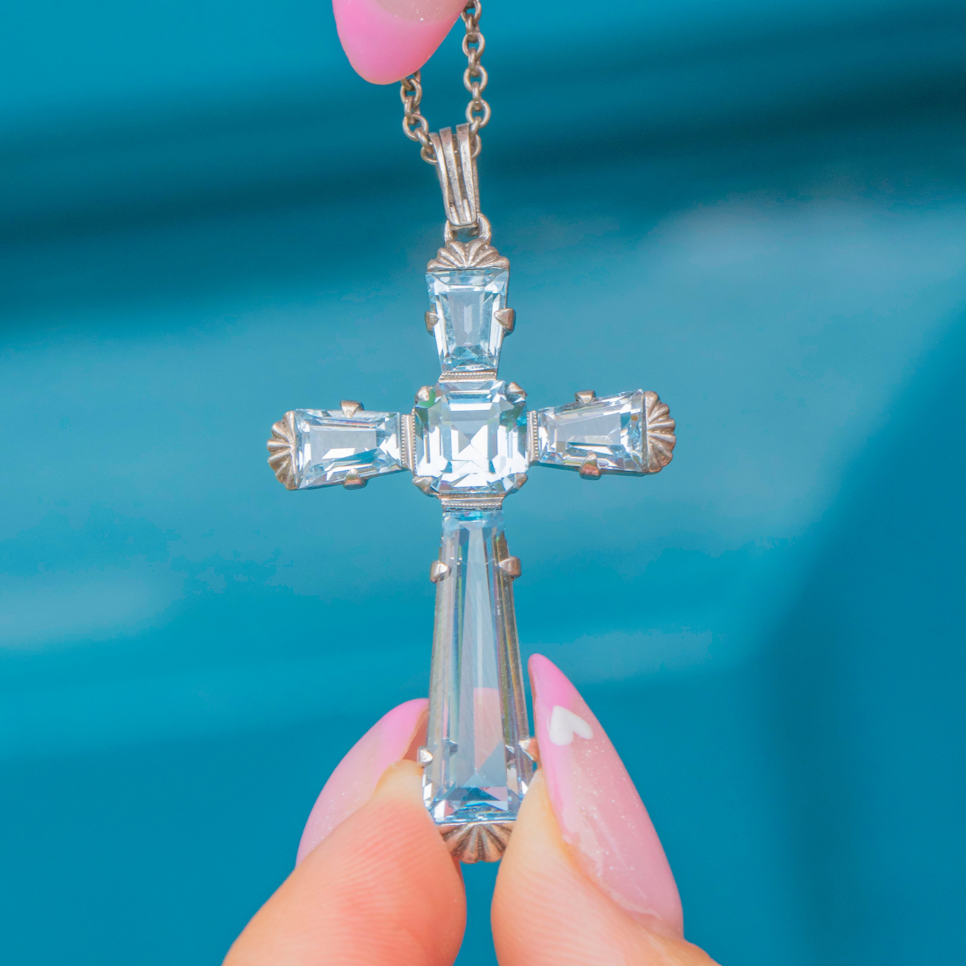 This striking Art Deco Aquamarine cross pendant showcases the clean geometry and cool tones that defined 1930s design. Set in high-purity 935 Silver, the cross glows with pale blue Aquamarines totalling approximately 12 carats, their clarity and icy hue exuding a serene elegance.