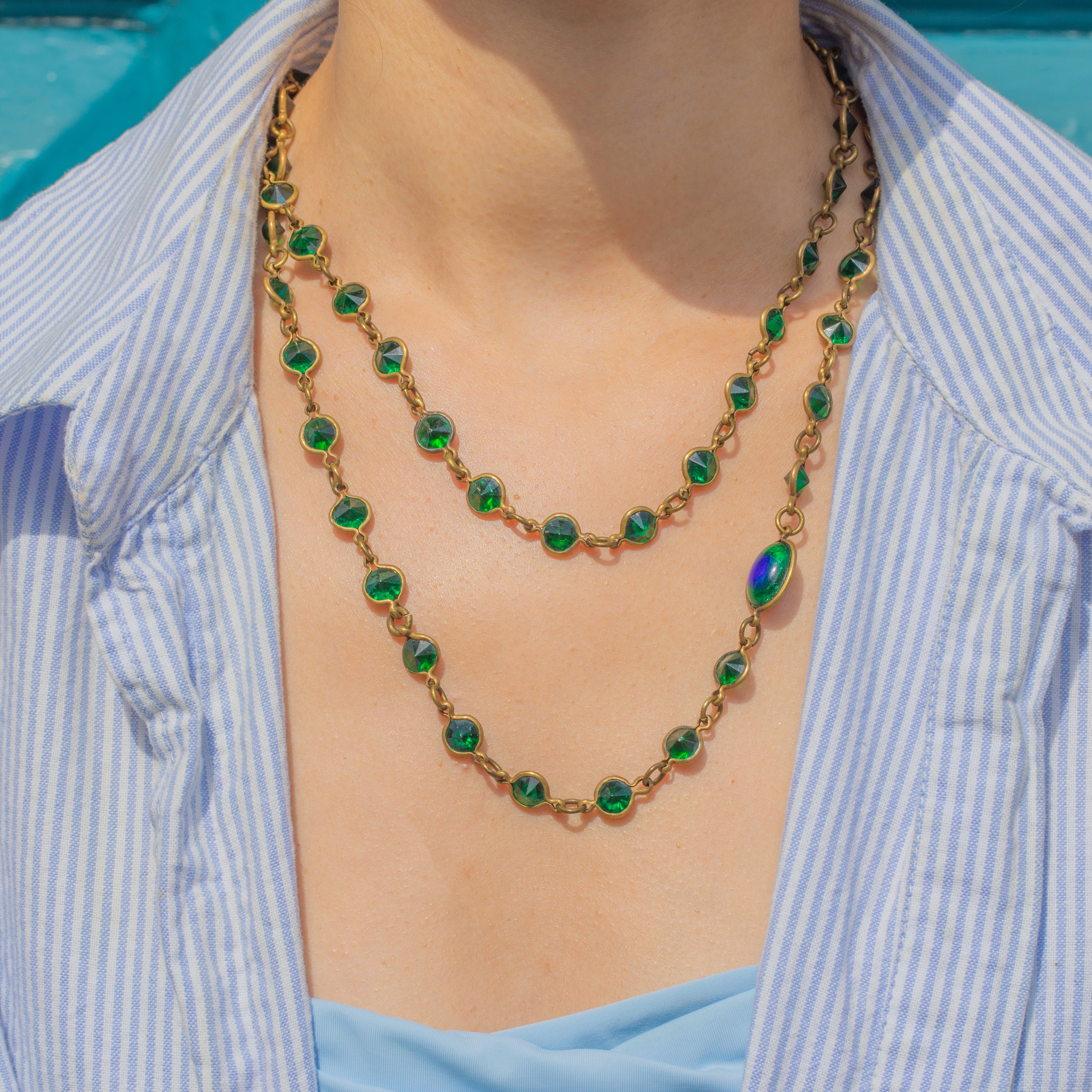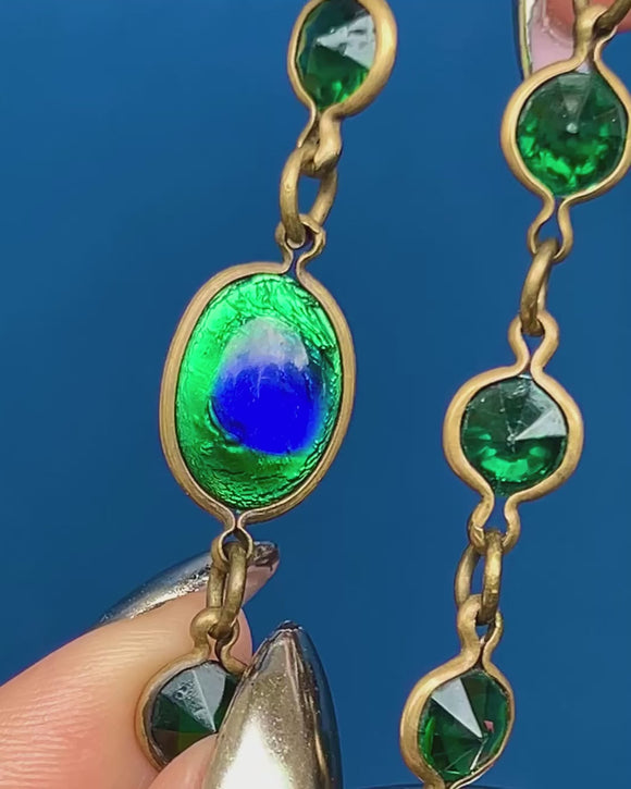 EXCELLENT. This Arts & Crafts green Paste peacock eye longuard necklace is in excellent condition. The necklace is so striking, each bright Paste gem is present and there is only minor surface wear commensurate with age!