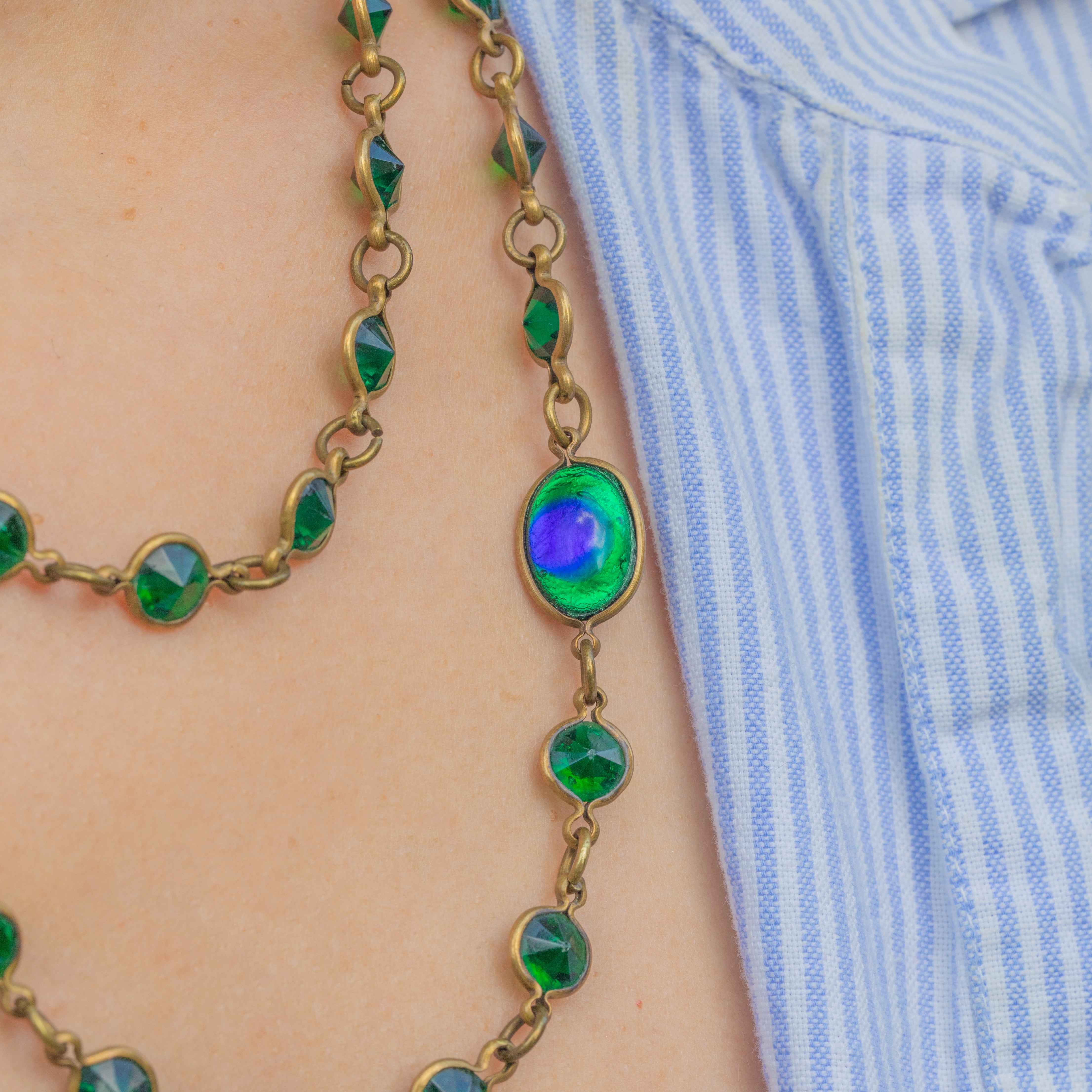 Art Deco Peacock Venetian Glass Green Paste Longuard Necklace