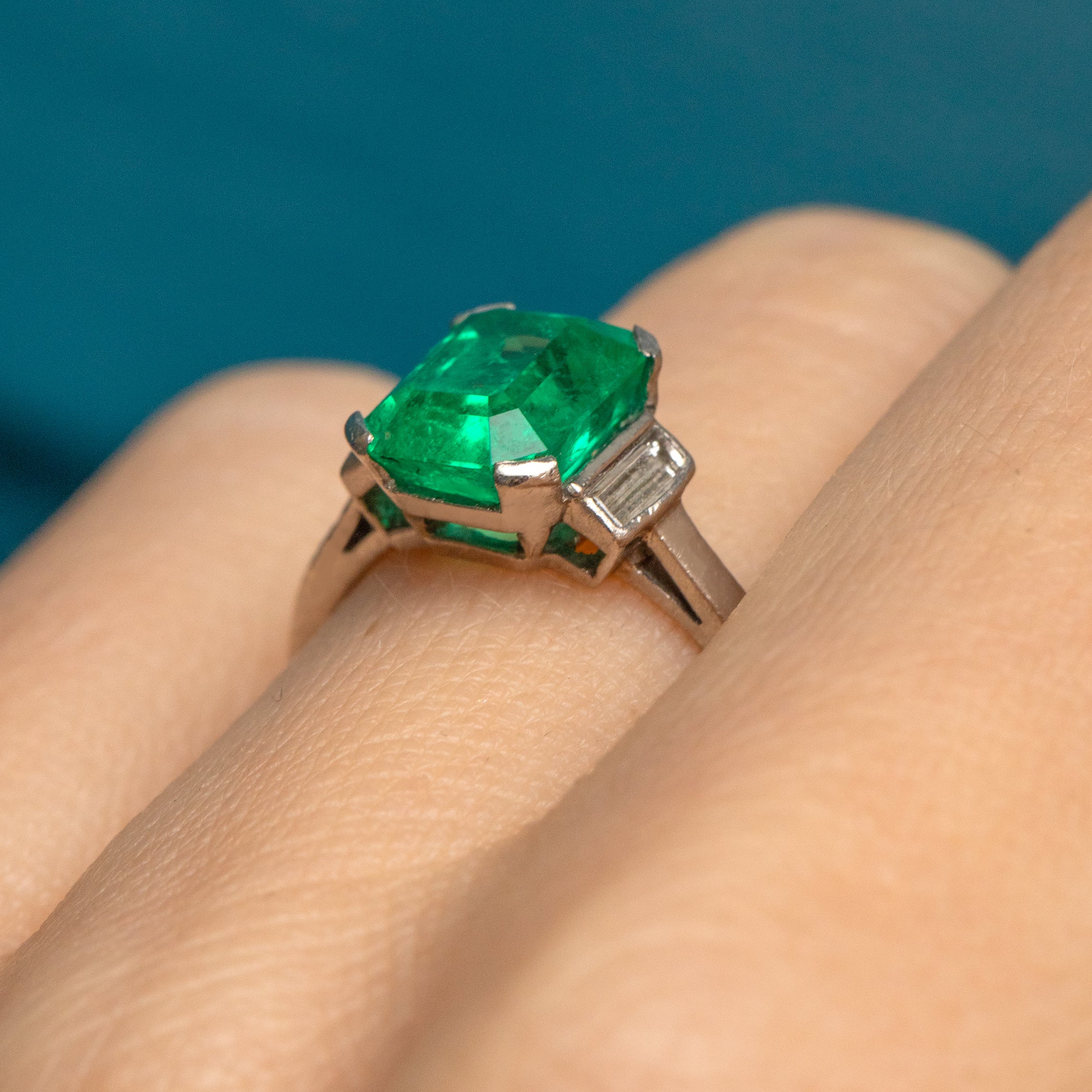 Nestled on either side of her Emerald are two baguette-cut Diamonds, adding an extra touch of splendour. The design of this Art Deco ring is effortless and will no doubt be a showstopper as she adorns your hand. Bringing you only the best with this Emerald Diamond ring, she bound together by solid Platinum providing a lifetime of luxury!