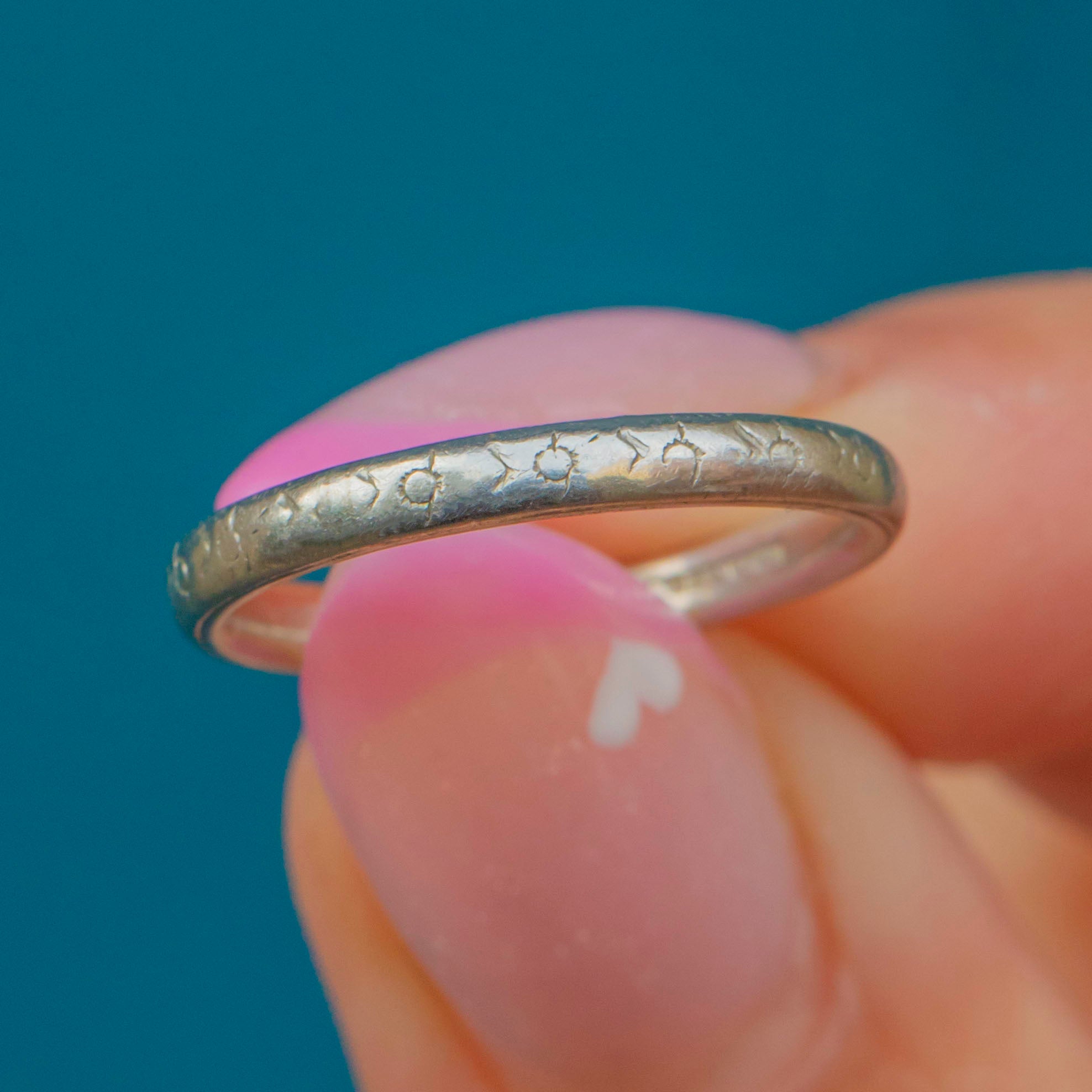 VERY GOOD. This splendid Art Deco Platinum engraved wedding band is offered in very good condition. Although her sweet engraved design has worn away slightly over time, it still retains a certain beauty! Her Platinum remains bright and glossy throughout, adding to the band's allure.