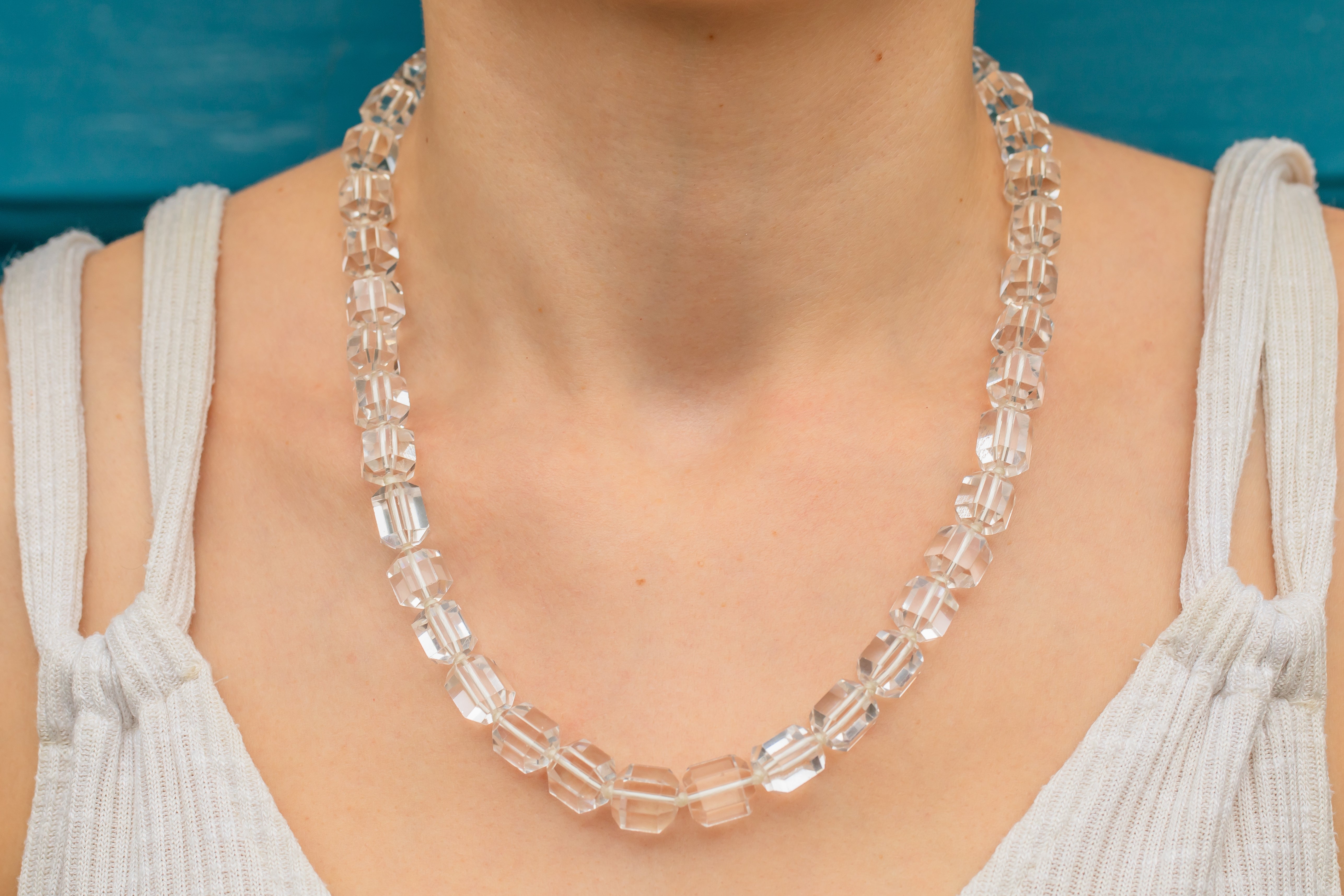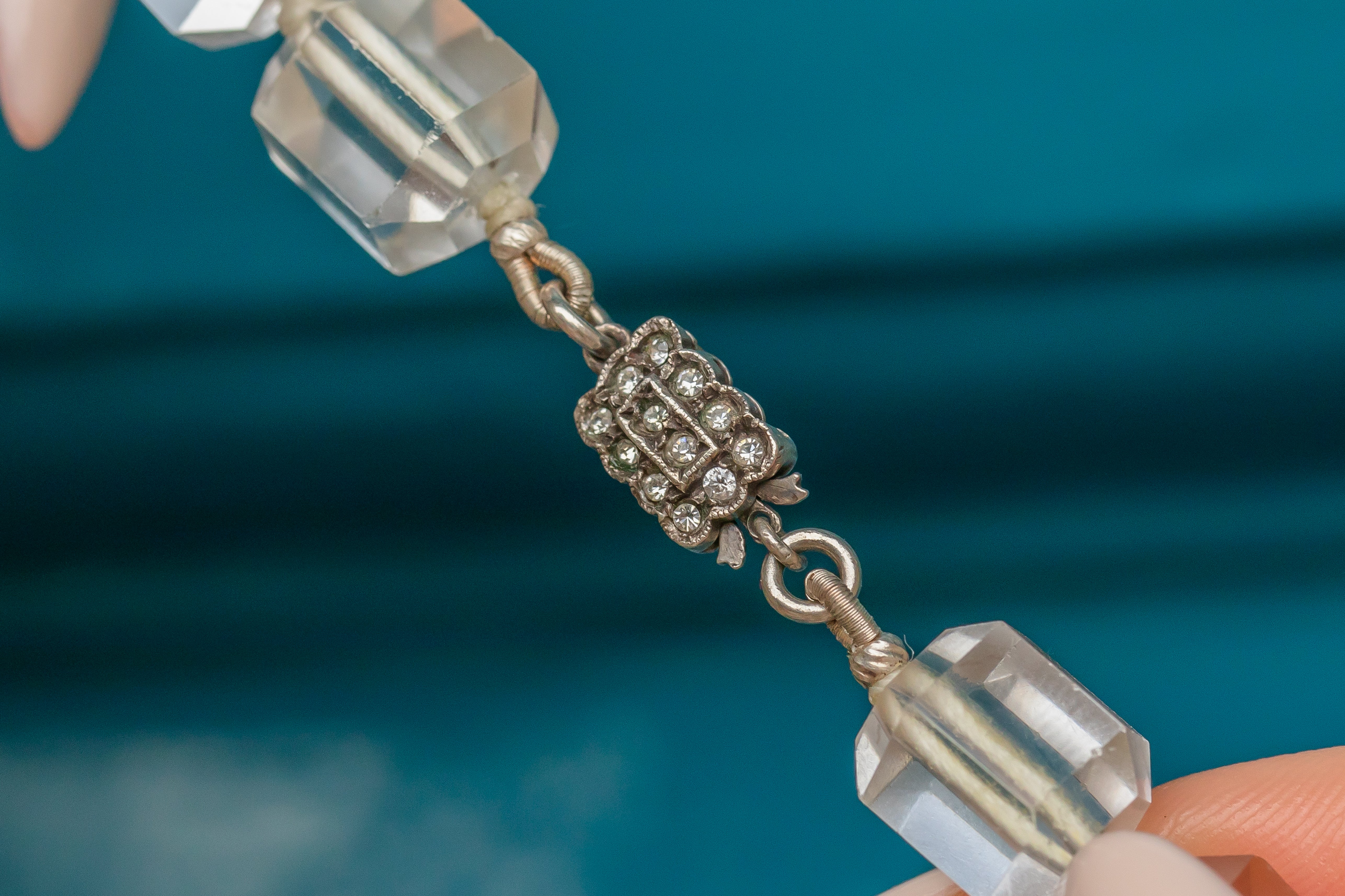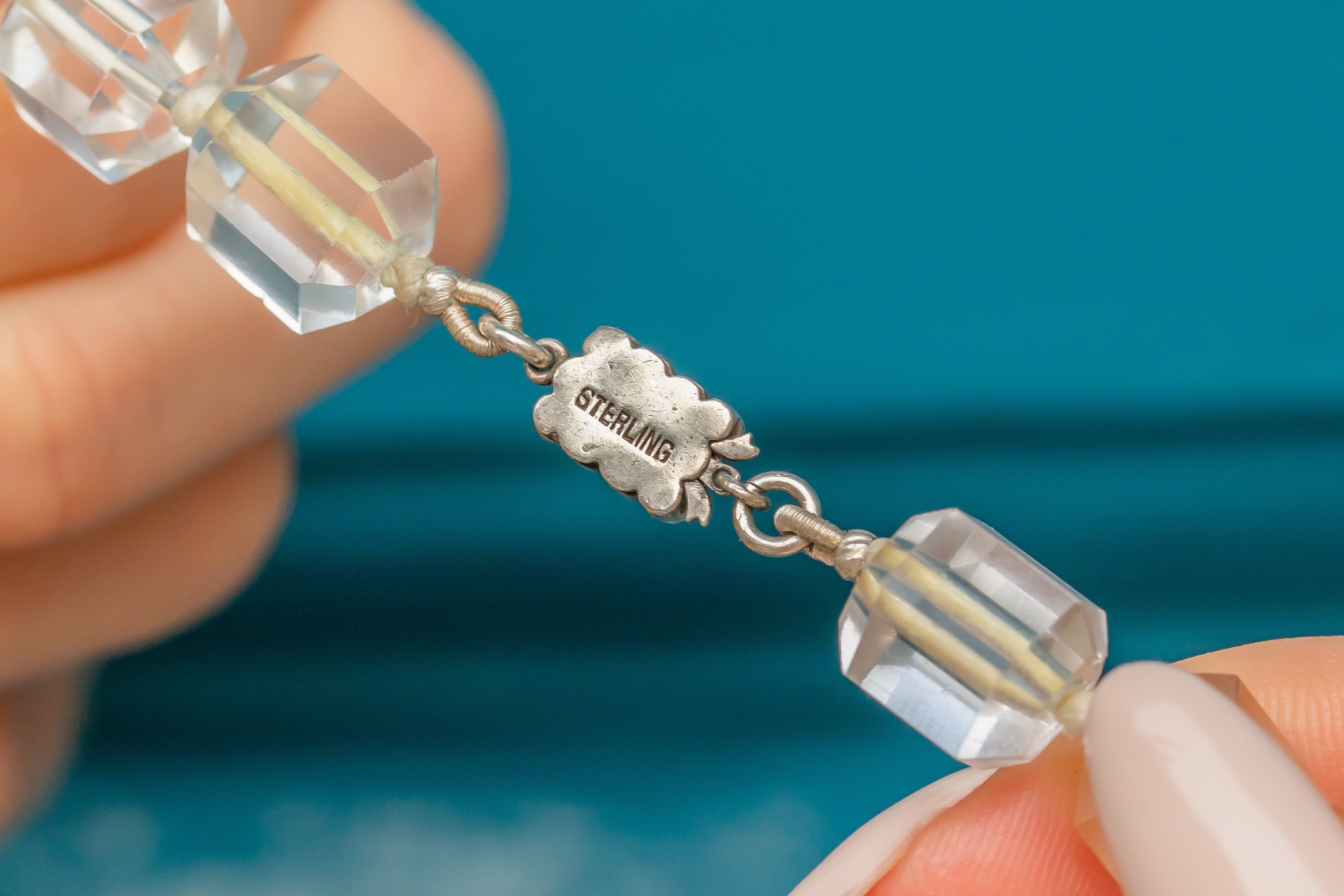 VERY GOOD. This Art Deco Rock Crystal beaded necklace is in very good condition. All of the beads are firmly connected and well-strung, with the Sterling Silver clasp also in fine working order! A few of the Rock Crystal beads have some minor abrasions after being worn and adored over many years but nothing significant. The Rock Crystals have been strung with thought and care, with a little knot between each of the stones for secure wear. This Art Deco item has lasted impeccably well through time and she remains a stunning and impactful piece!