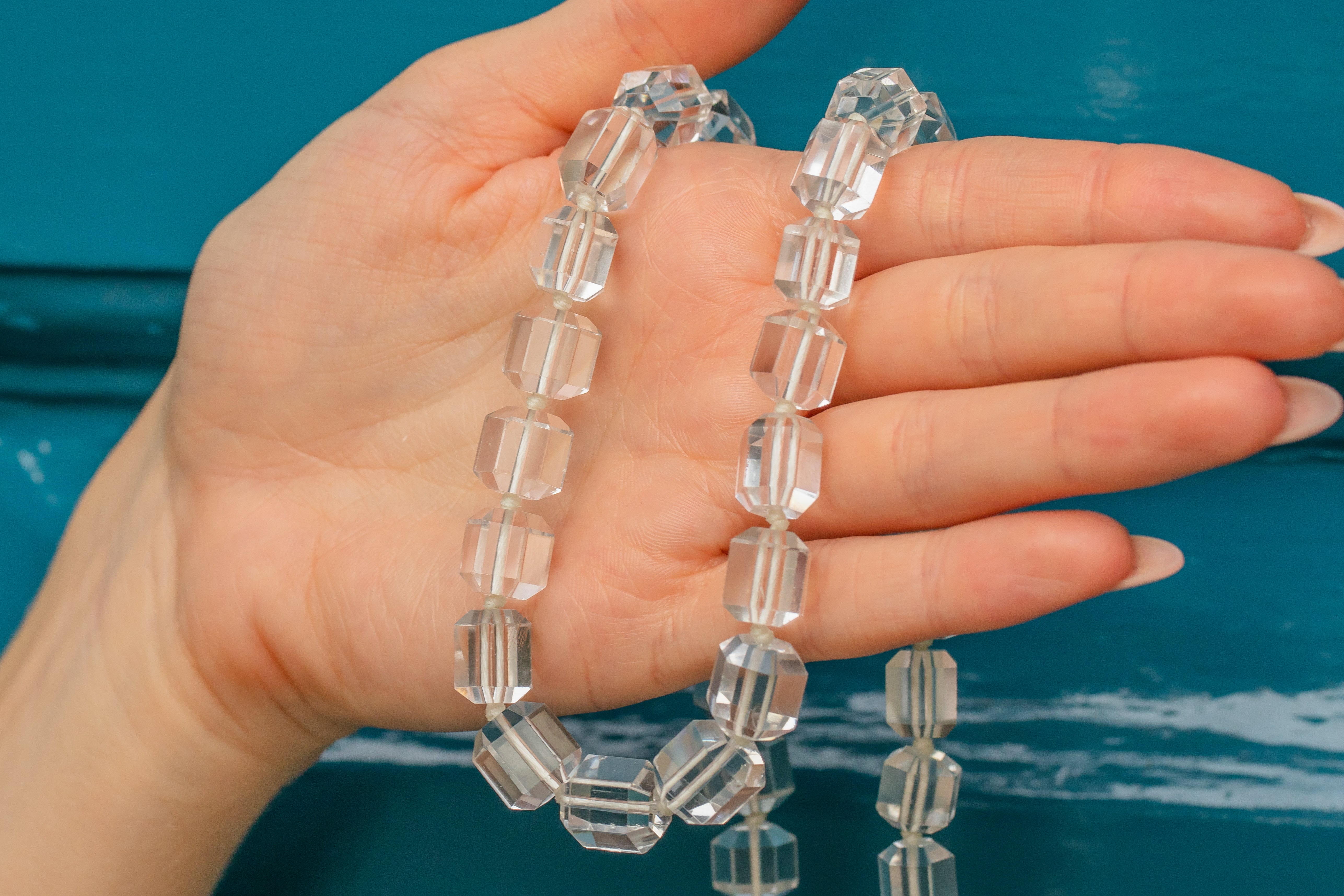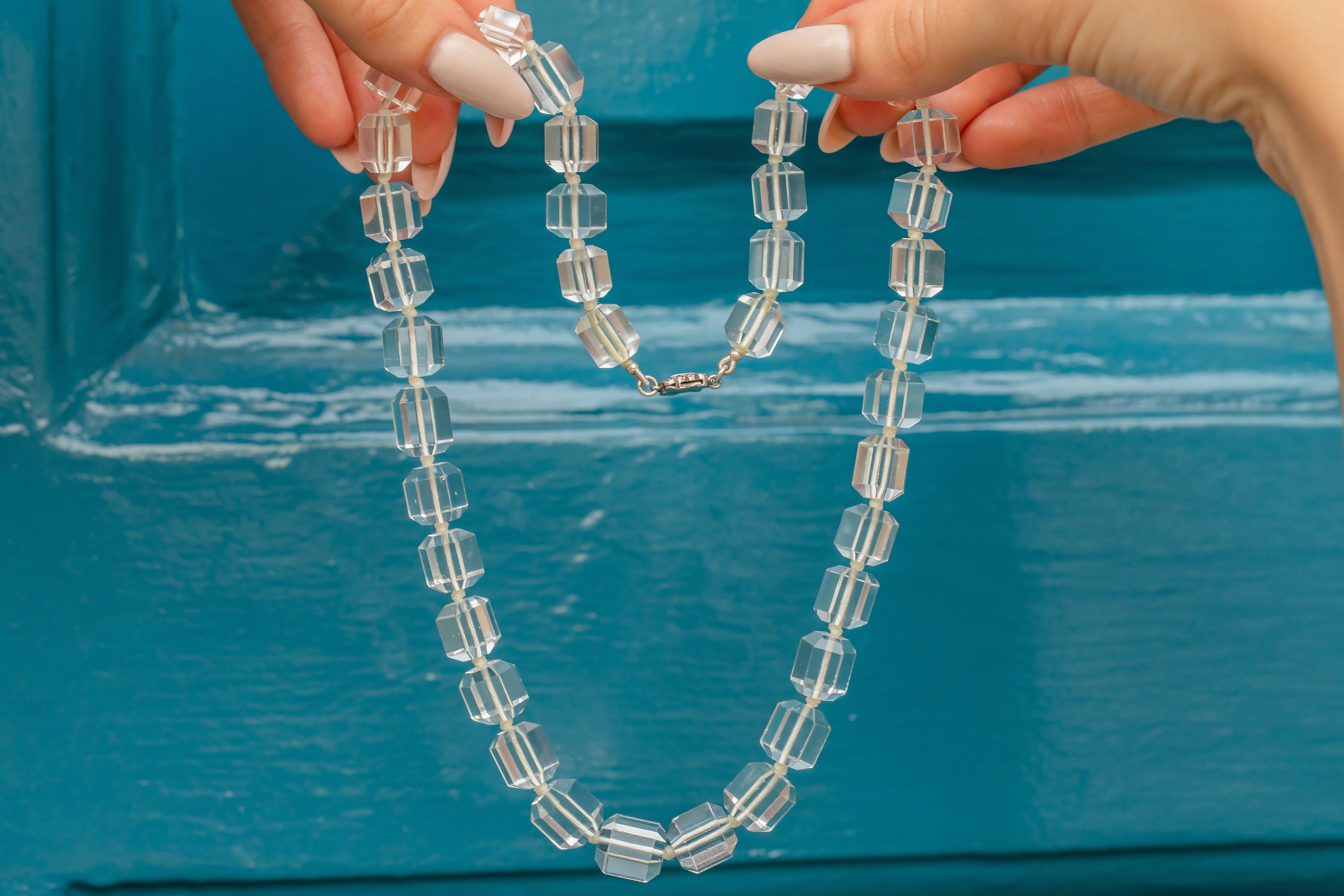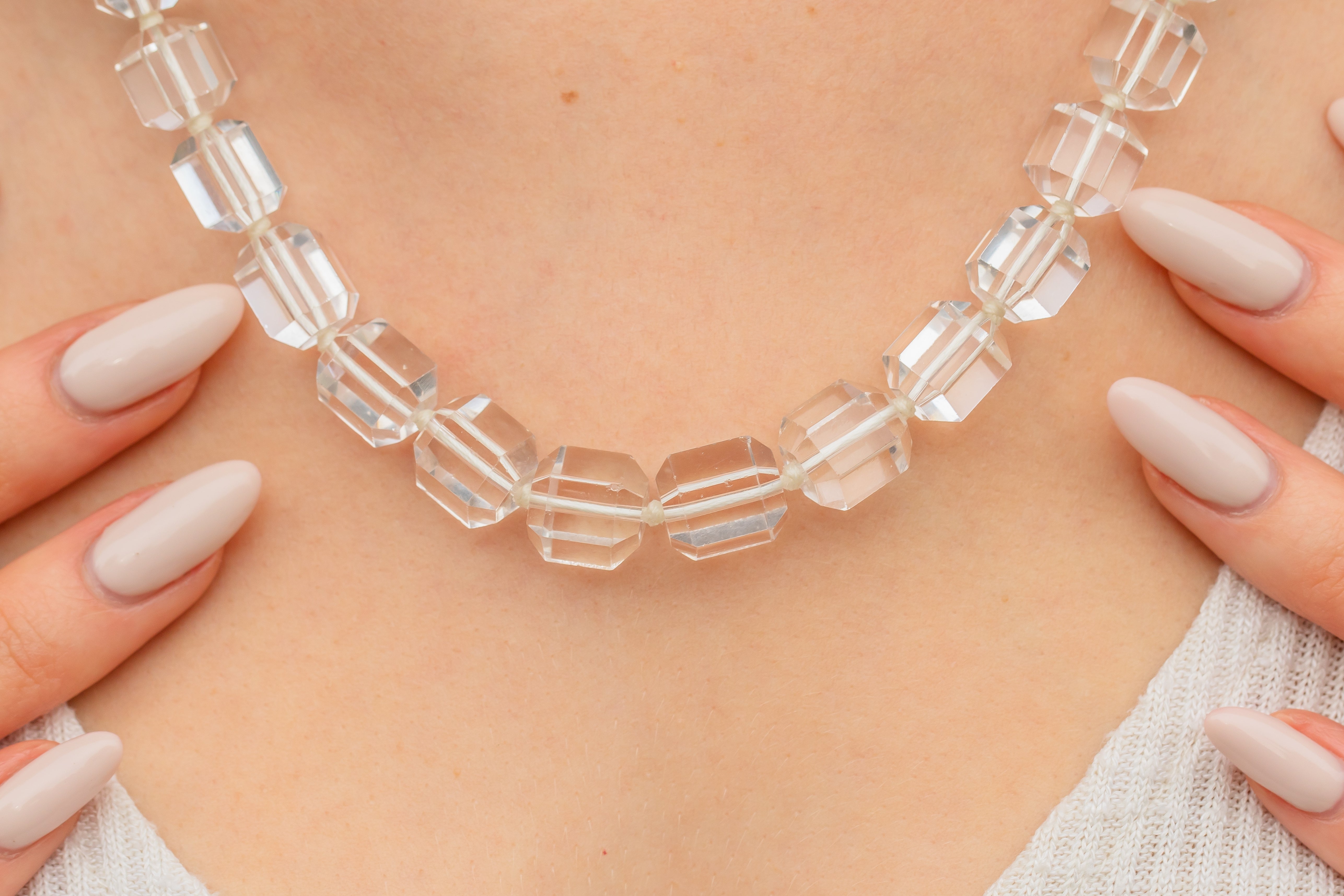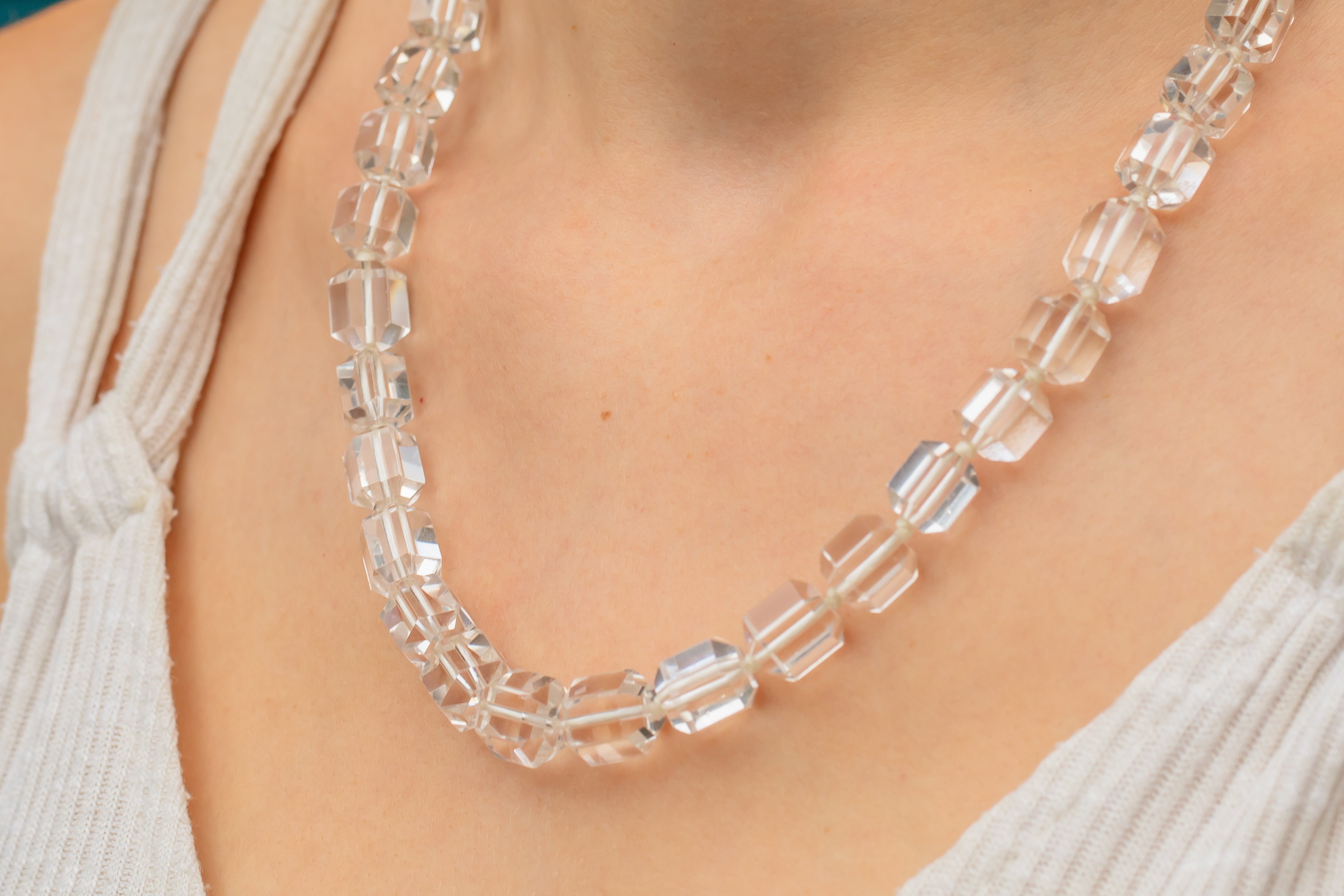 VERY GOOD. This Art Deco Rock Crystal beaded necklace is in very good condition. All of the beads are firmly connected and well-strung, with the Sterling Silver clasp also in fine working order! A few of the Rock Crystal beads have some minor abrasions after being worn and adored over many years but nothing significant. The Rock Crystals have been strung with thought and care, with a little knot between each of the stones for secure wear. This Art Deco item has lasted impeccably well through time and she remains a stunning and impactful piece!