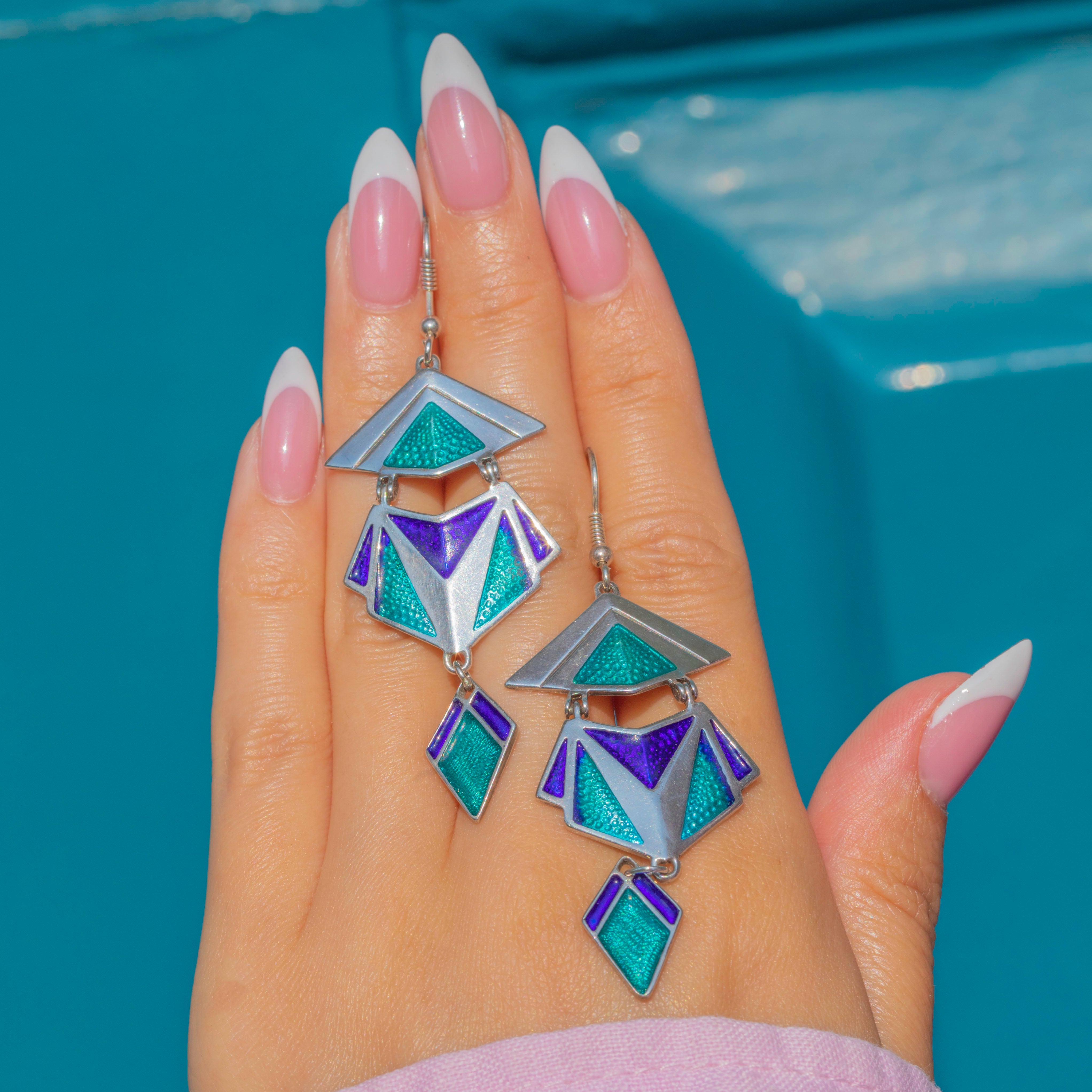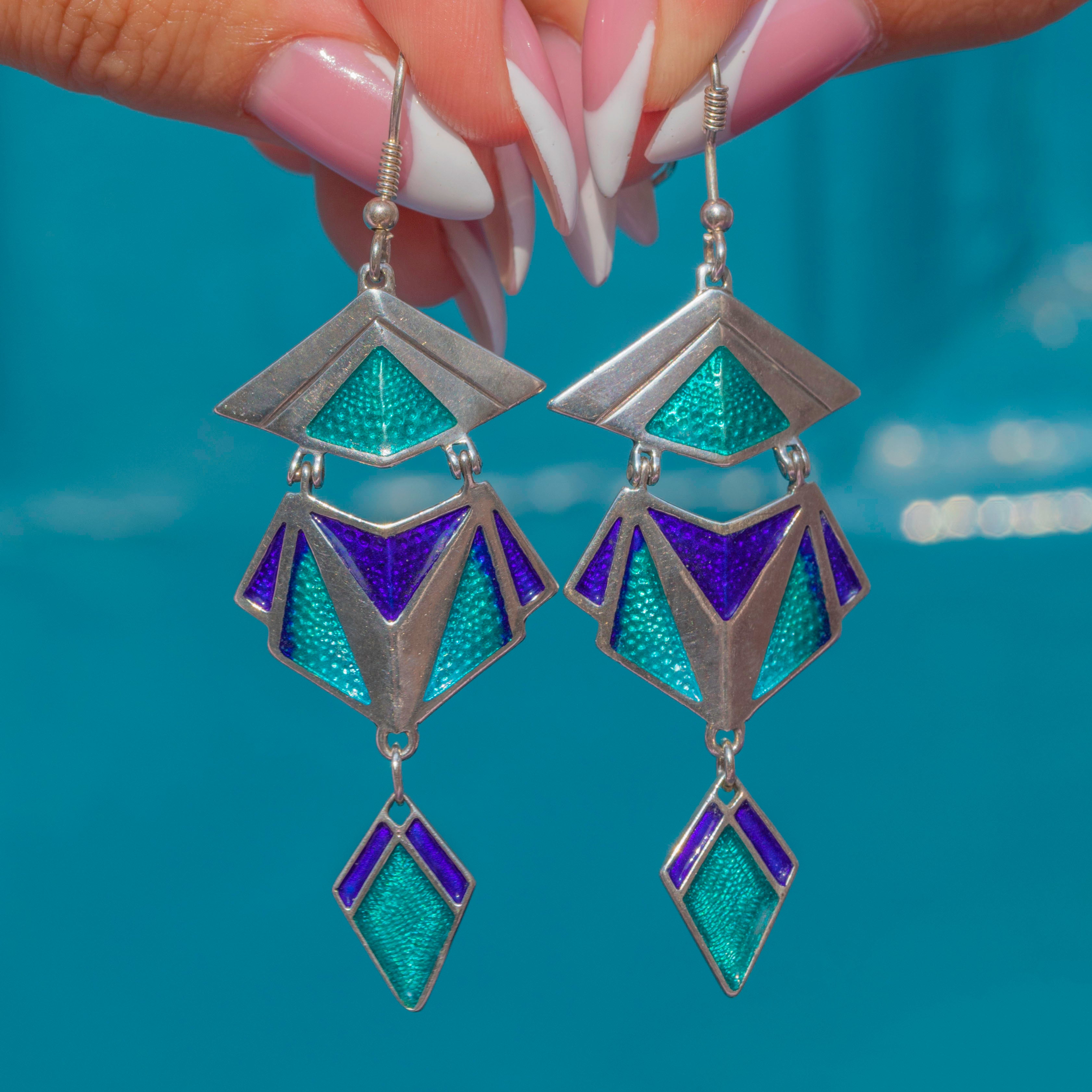 EXCELLENT: These Art Deco Silver Teal & Dark Blue Enamel Geometric Drop Earrings are in perfect condition, with no chips, cracks, or wear to the enamel. The Silver retains its bright, polished finish, and the clasp mechanisms are secure and functioning smoothly.