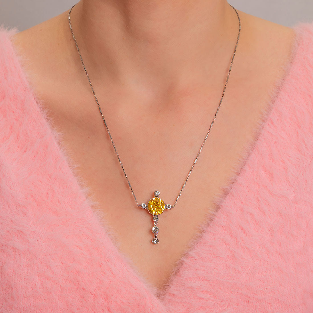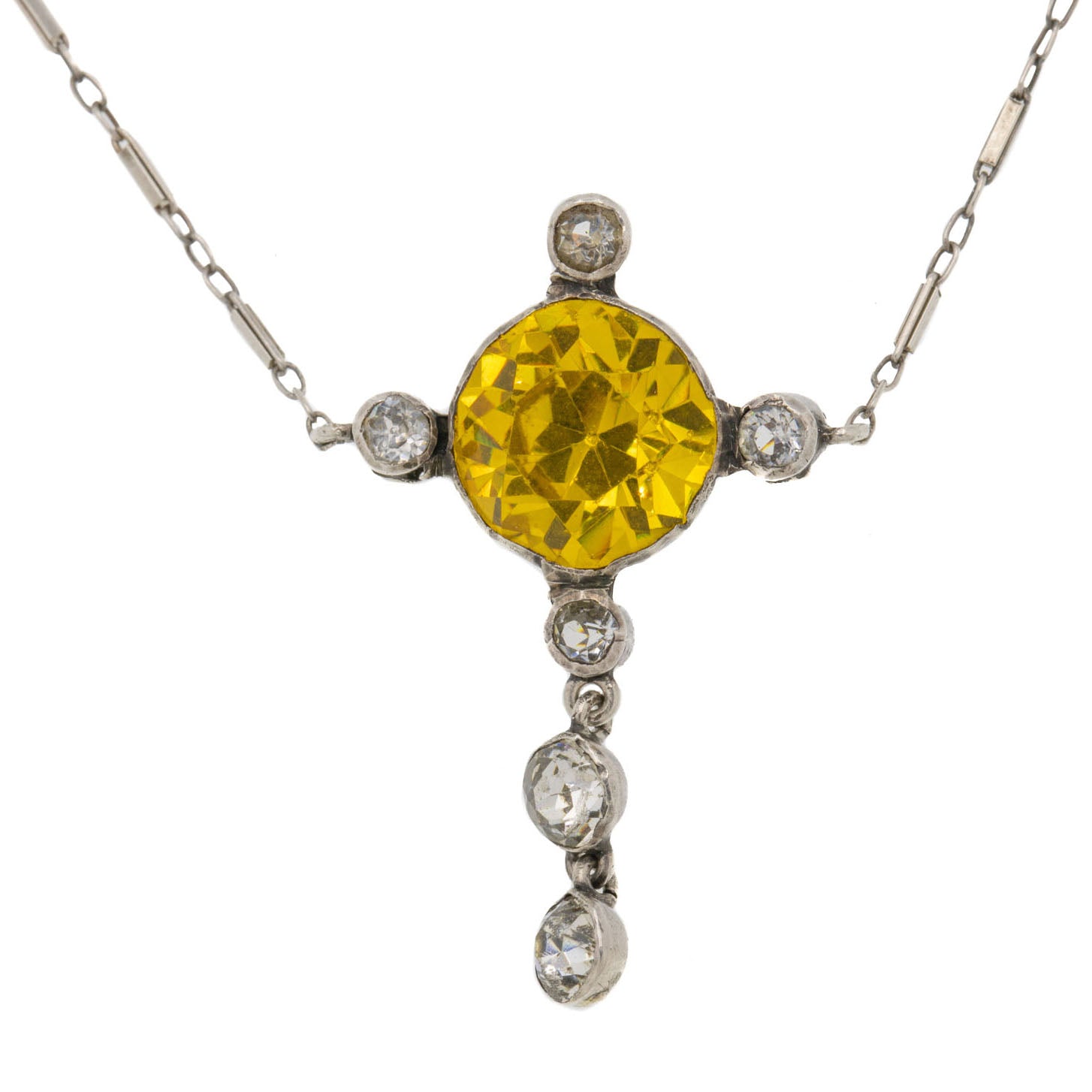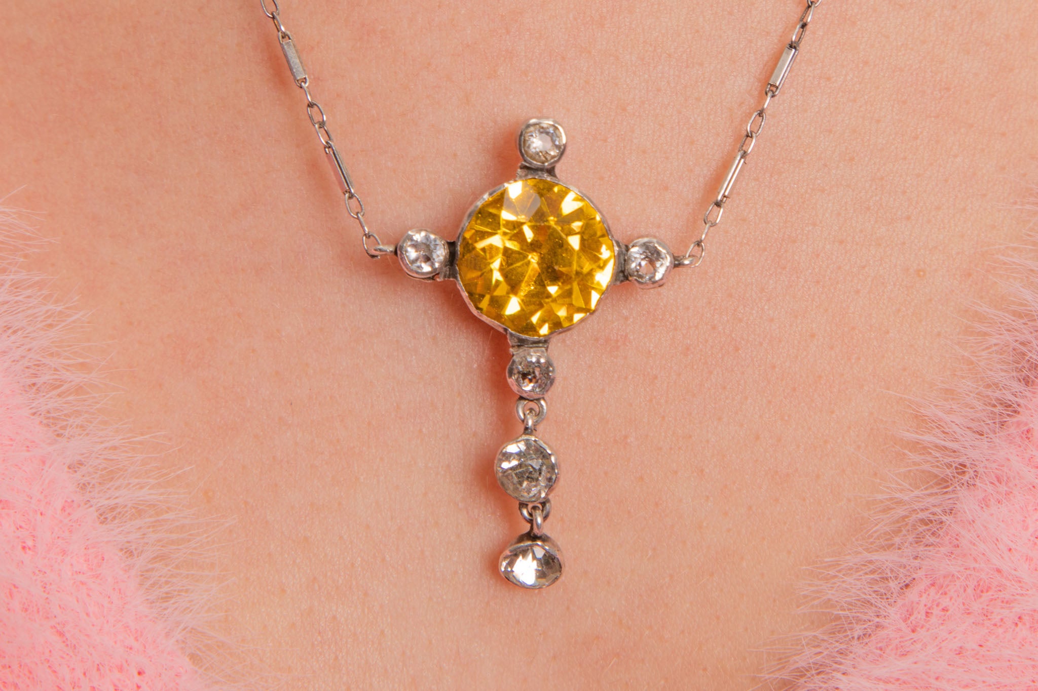 We adore this Art Deco Silver foiled yellow & white Paste integral necklace. This treasure is intriguing, to say the least, with a sunny yellow Paste centre and crisp white Paste gems to feast your eyes on!
