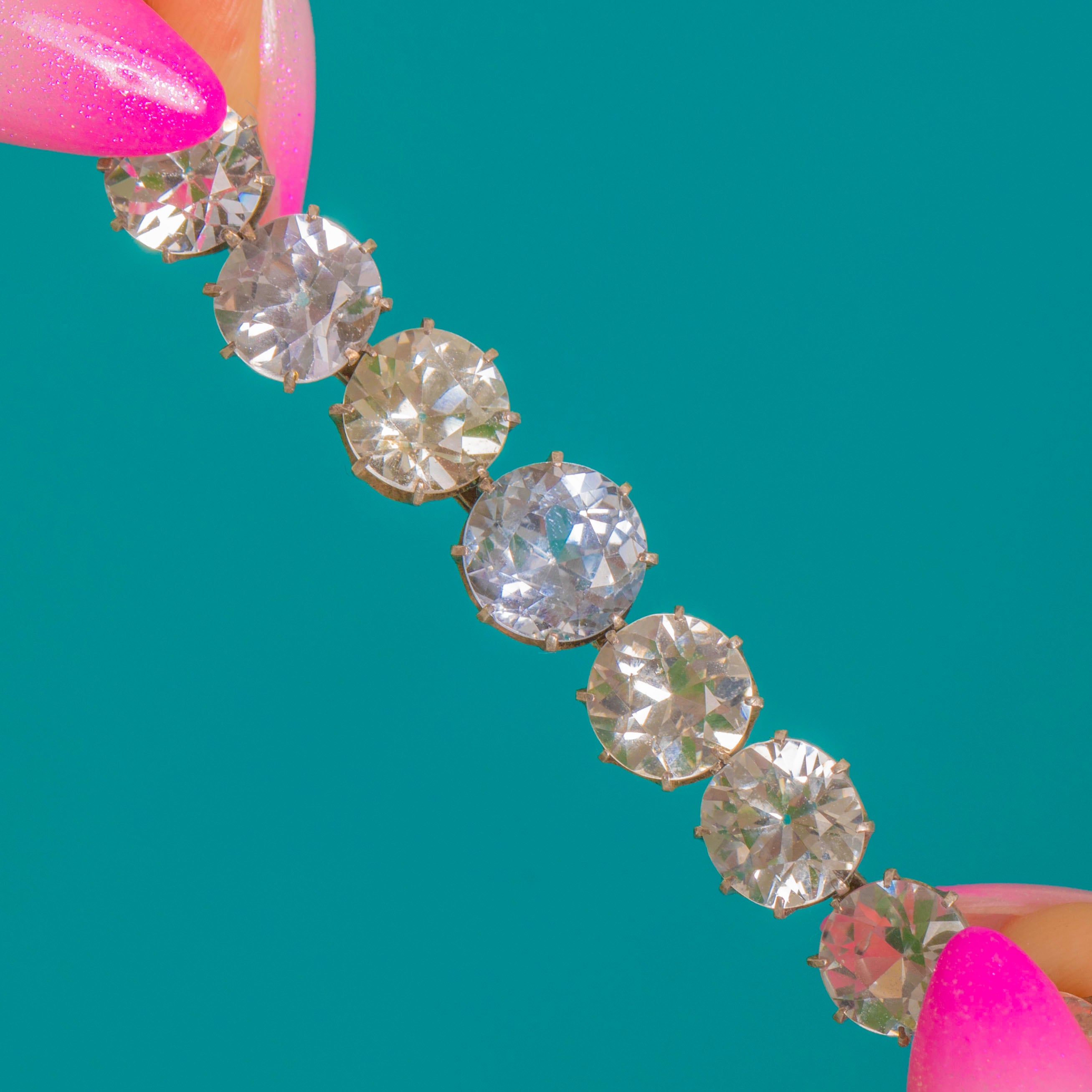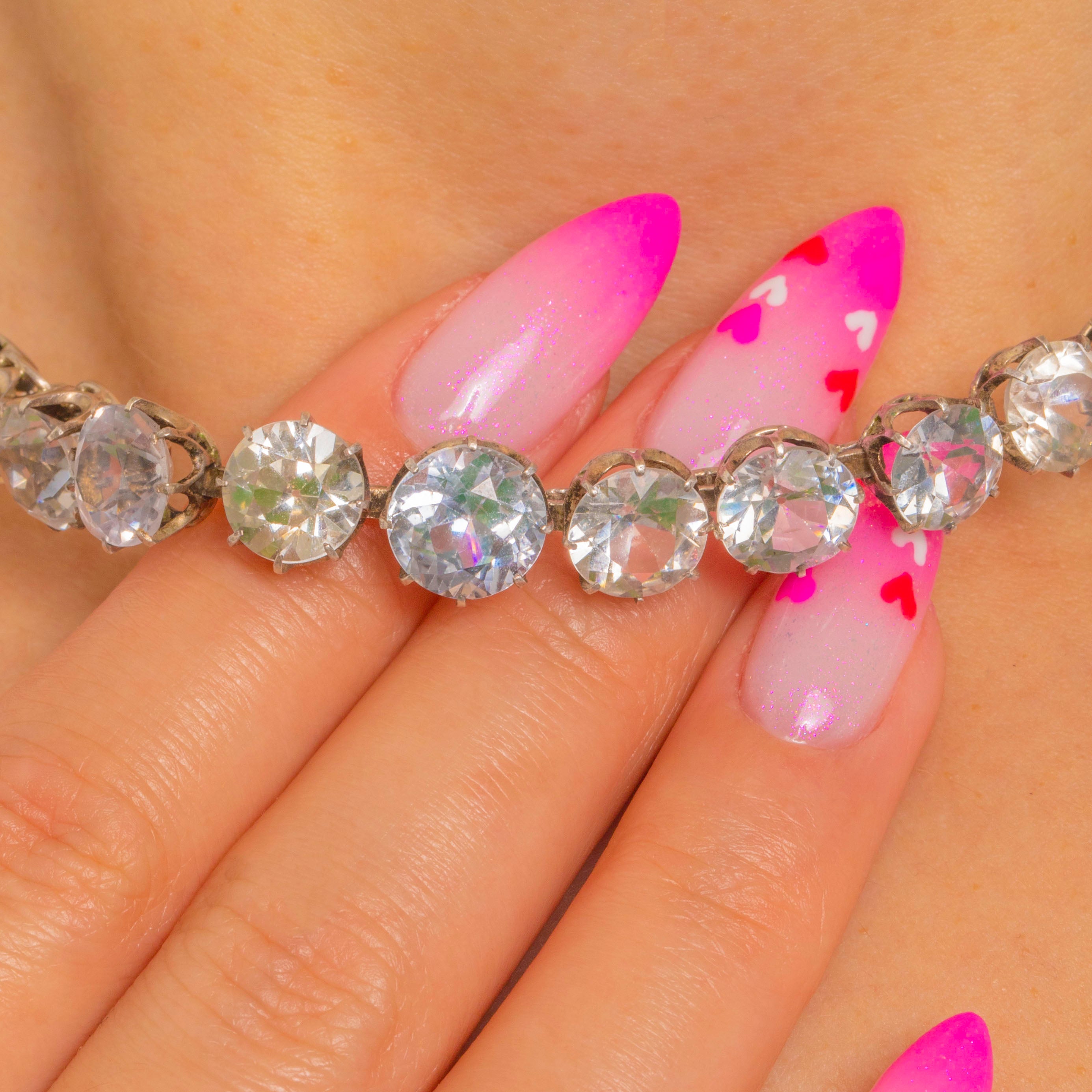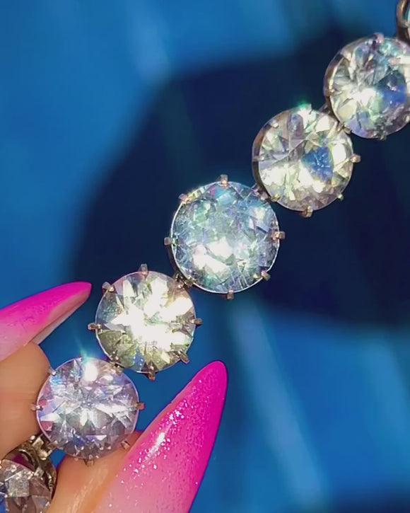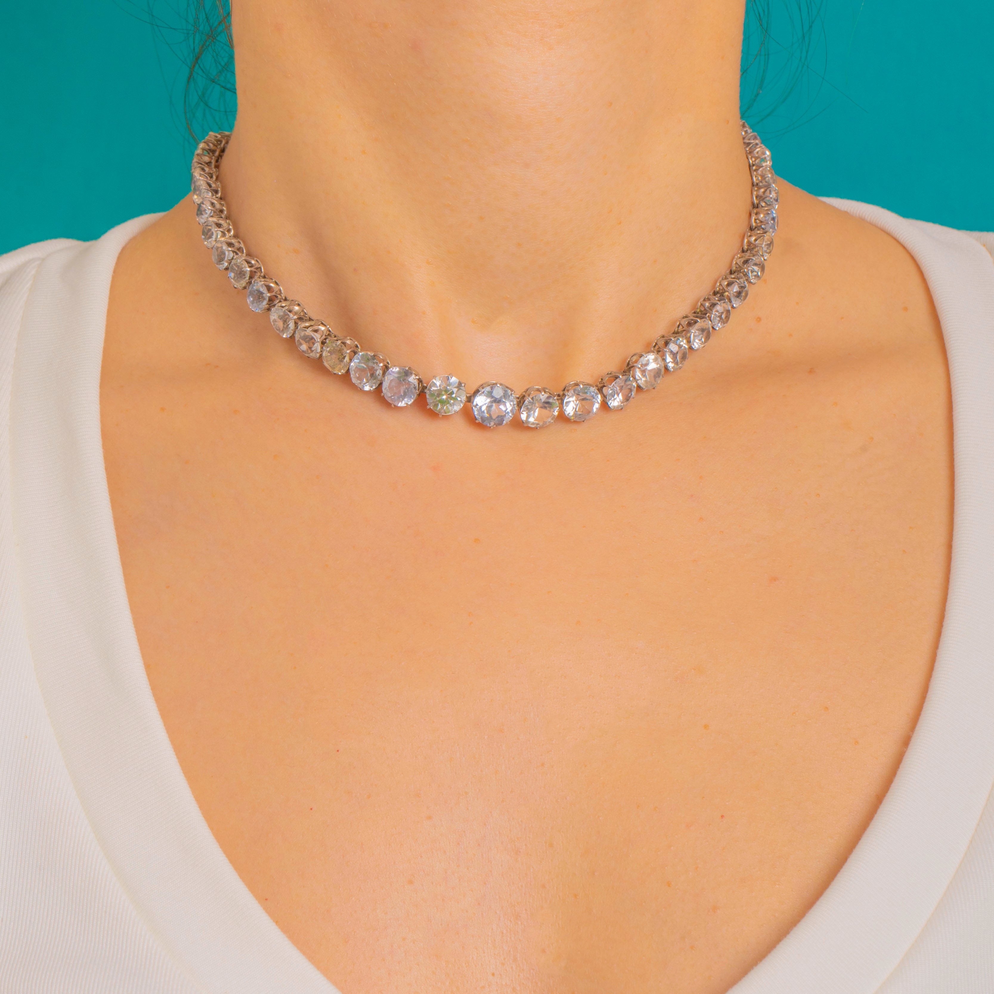Iconic Art Deco elegance in its purest form, this Paste riviere necklace shimmers with a single, seamless row of round stones that gently graduate towards the centre. The articulated collet settings create a fluid drape that catches the light beautifully, framing the neckline with cool, crystalline sparkle.