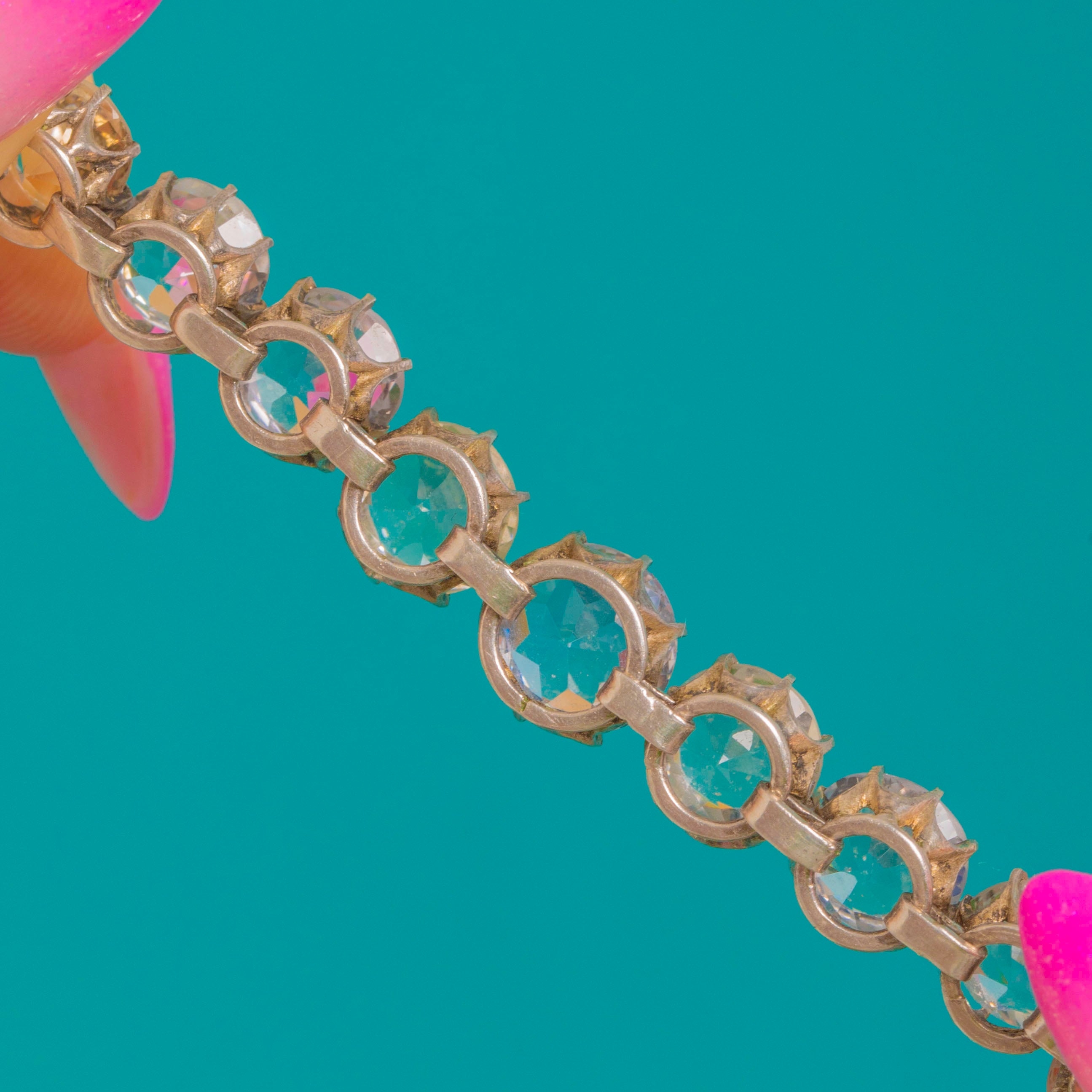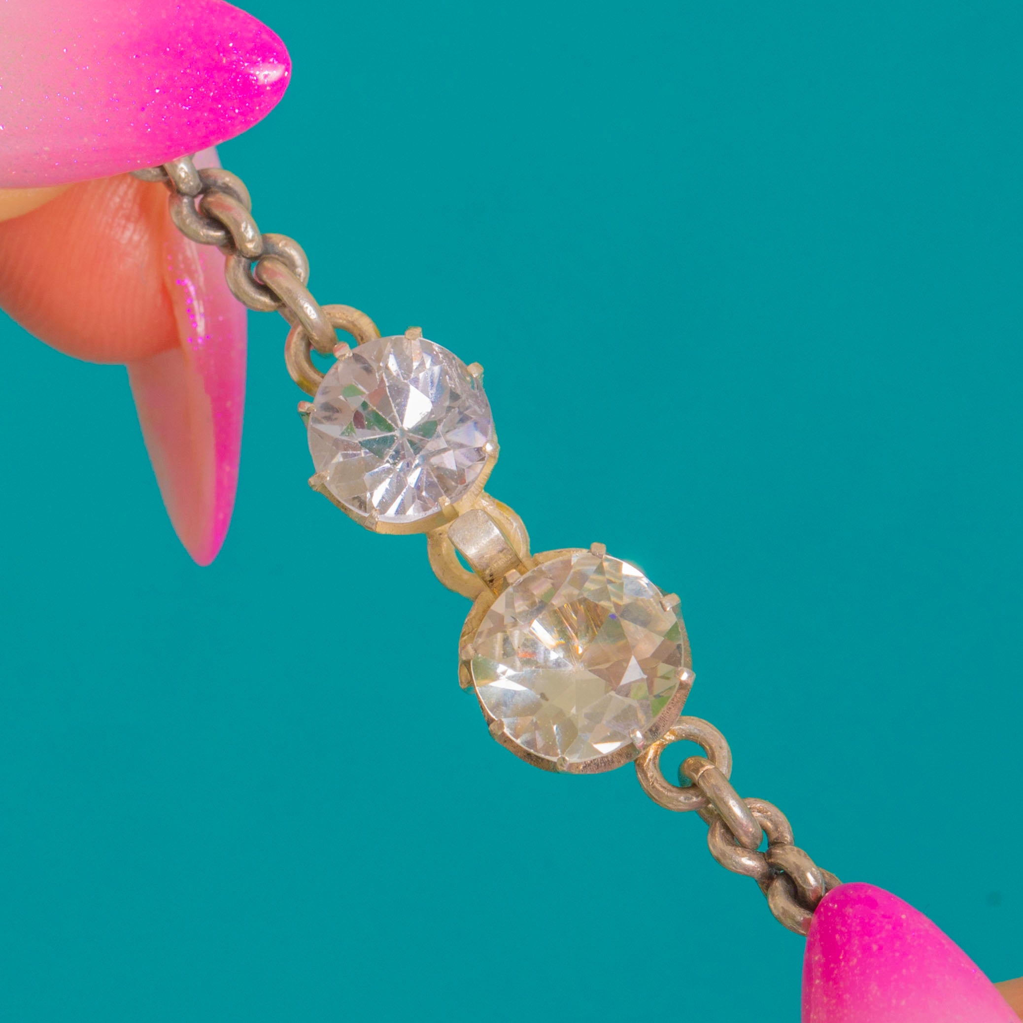 EXCELLENT: Paste stones are bright with minimal surface wear visible under magnification. The articulated Silver settings are secure and well-preserved, with crisp collets and smooth movement. No obvious repairs; light age-appropriate wear commensurate with the period.