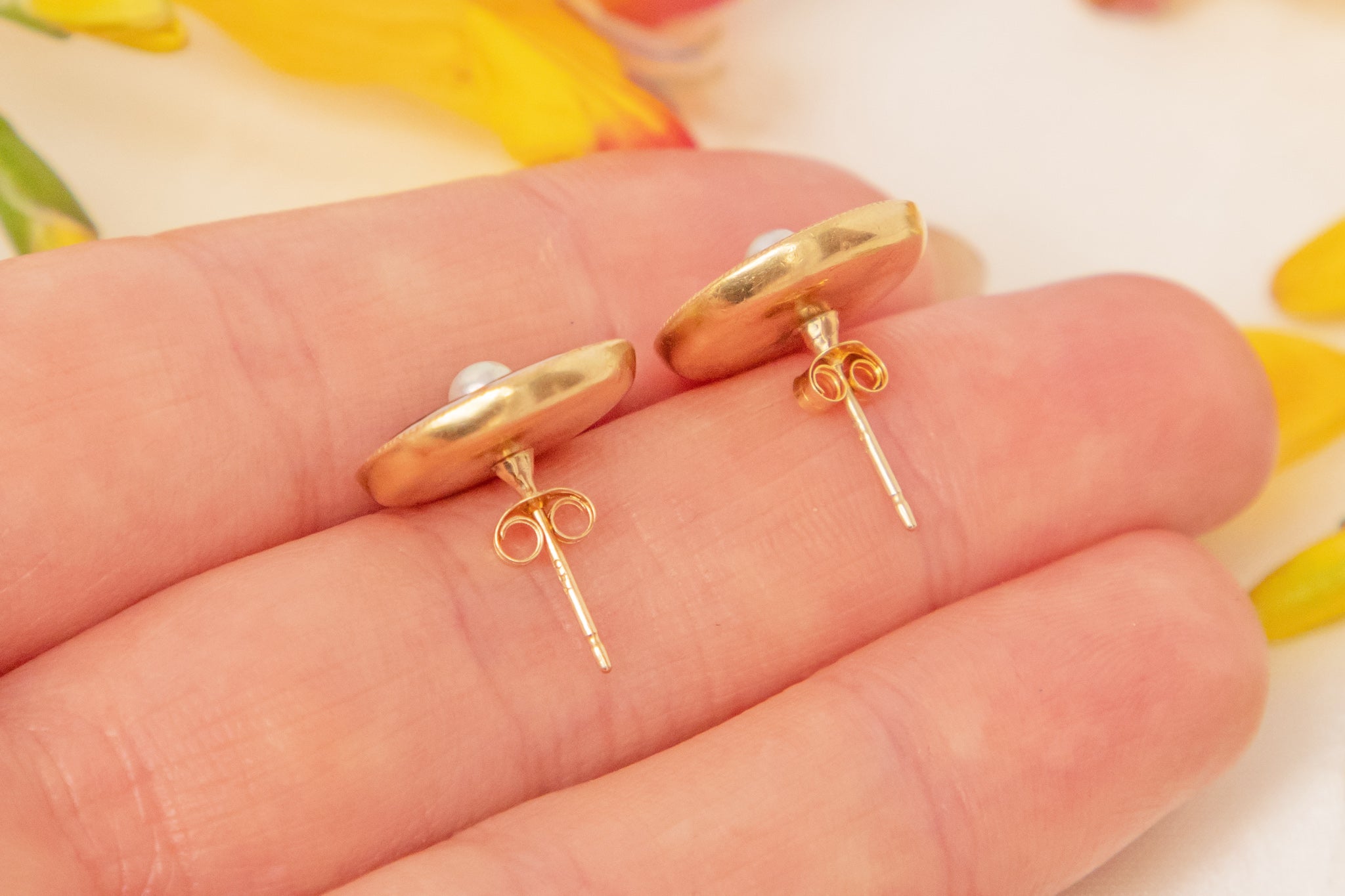 EXCELLENT. These Art Deco White Enamel Mother of Pearl stud earrings are in excellent condition! Each component of these lovely ladies are securely affixed with no damage to the Mother of Pearl, central Pearl or Enamel. We love the contrast between the deep hues of the Mother of Pearl against the cotton-white shimmer of the central Pearl. The 18ct Gold is sturdy with a lovely smooth back to optimise comfort.