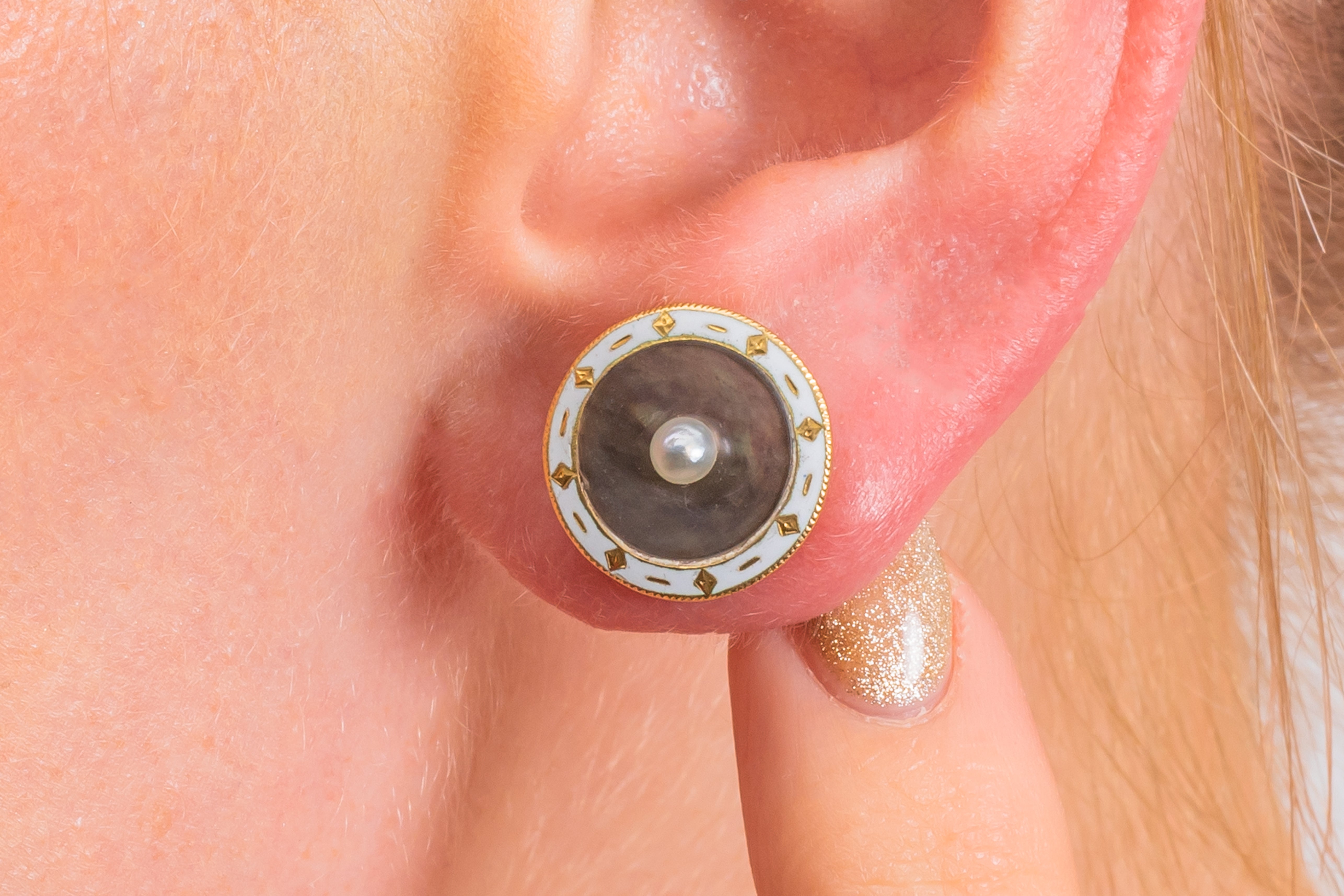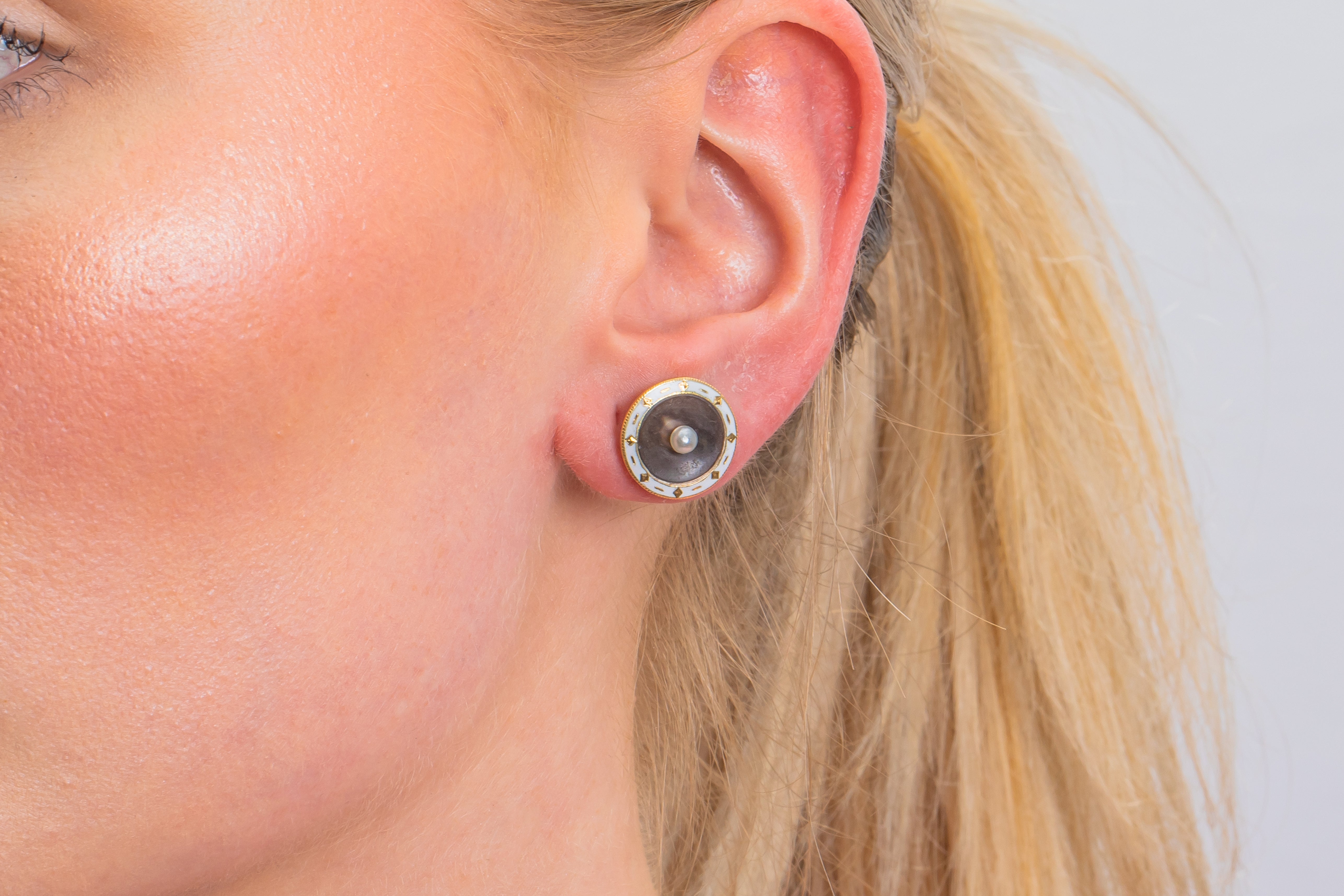These Art Deco White Enamel Mother of Pearl stud earrings will satisfy your penchant for something subtly splendorous! The deep iridescent Mother of Pearl disks are haloed by crisp white Enamel, with a single shimmering Pearl poised at the centre of each one.