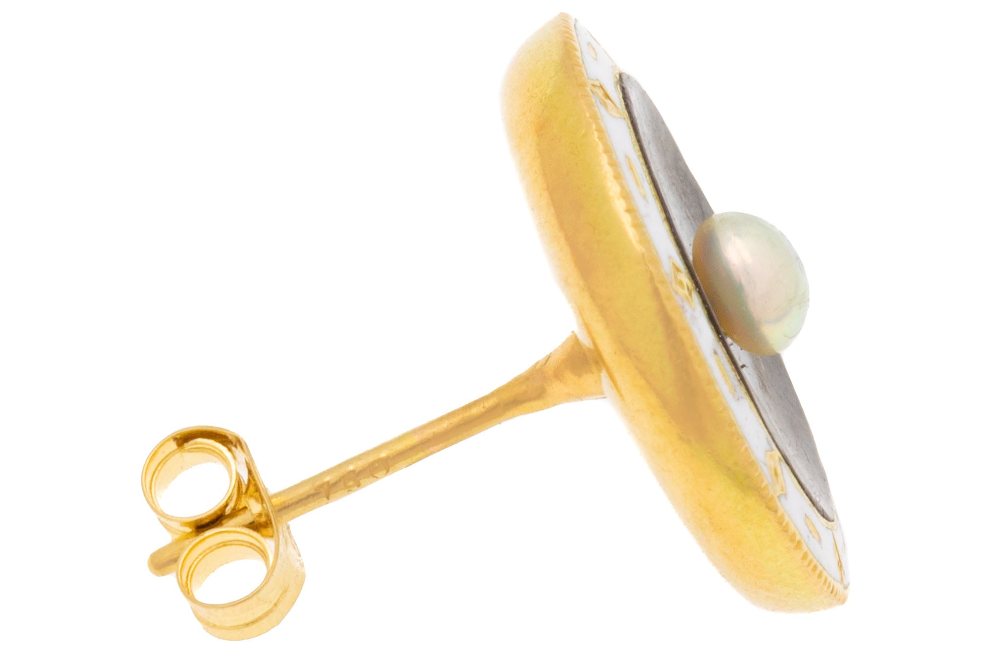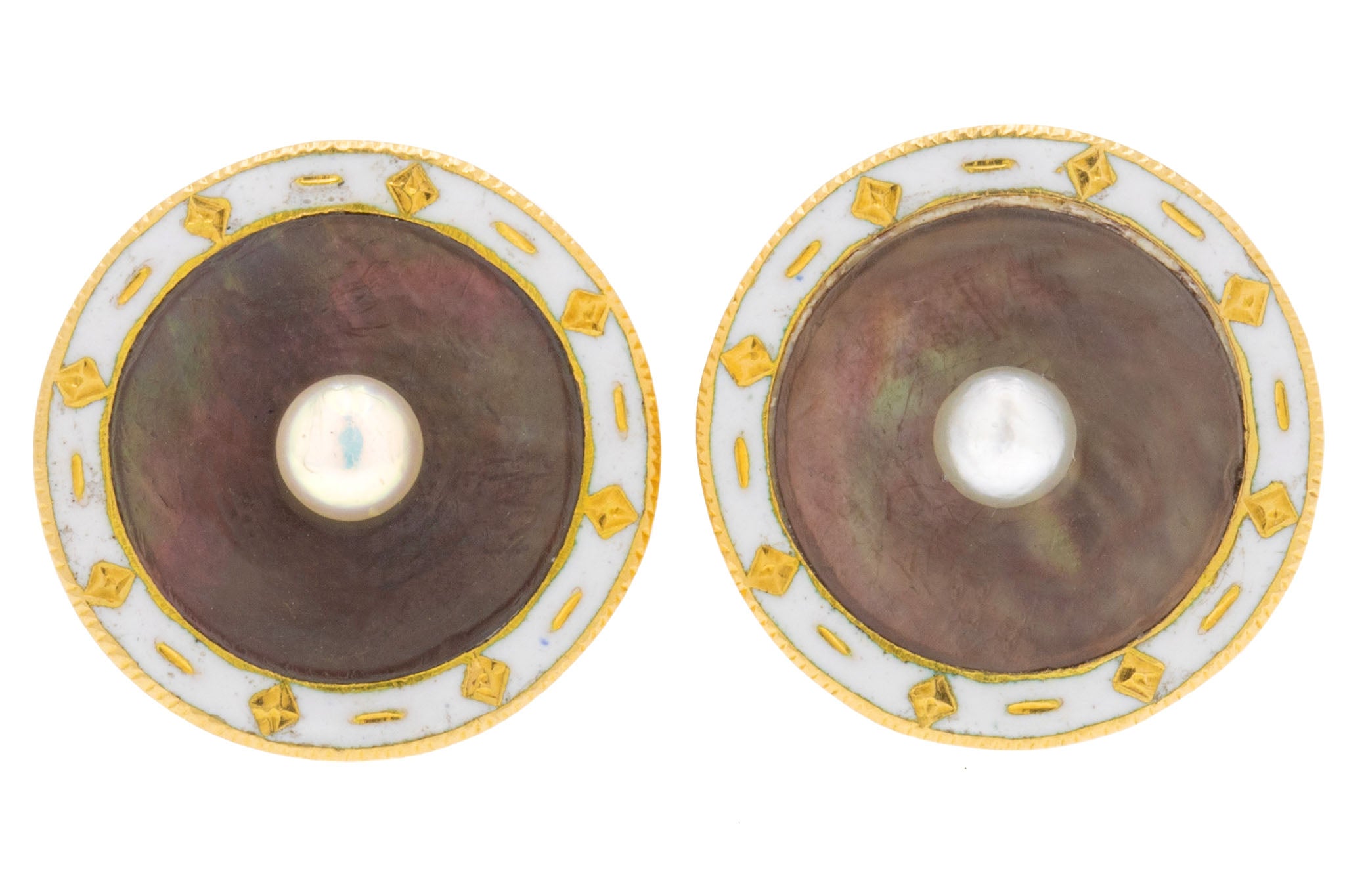 MATERIALS: Tests as 18ct Gold settings & butterfly backs, White Enamel, Mother of Pearl,  Pearl.