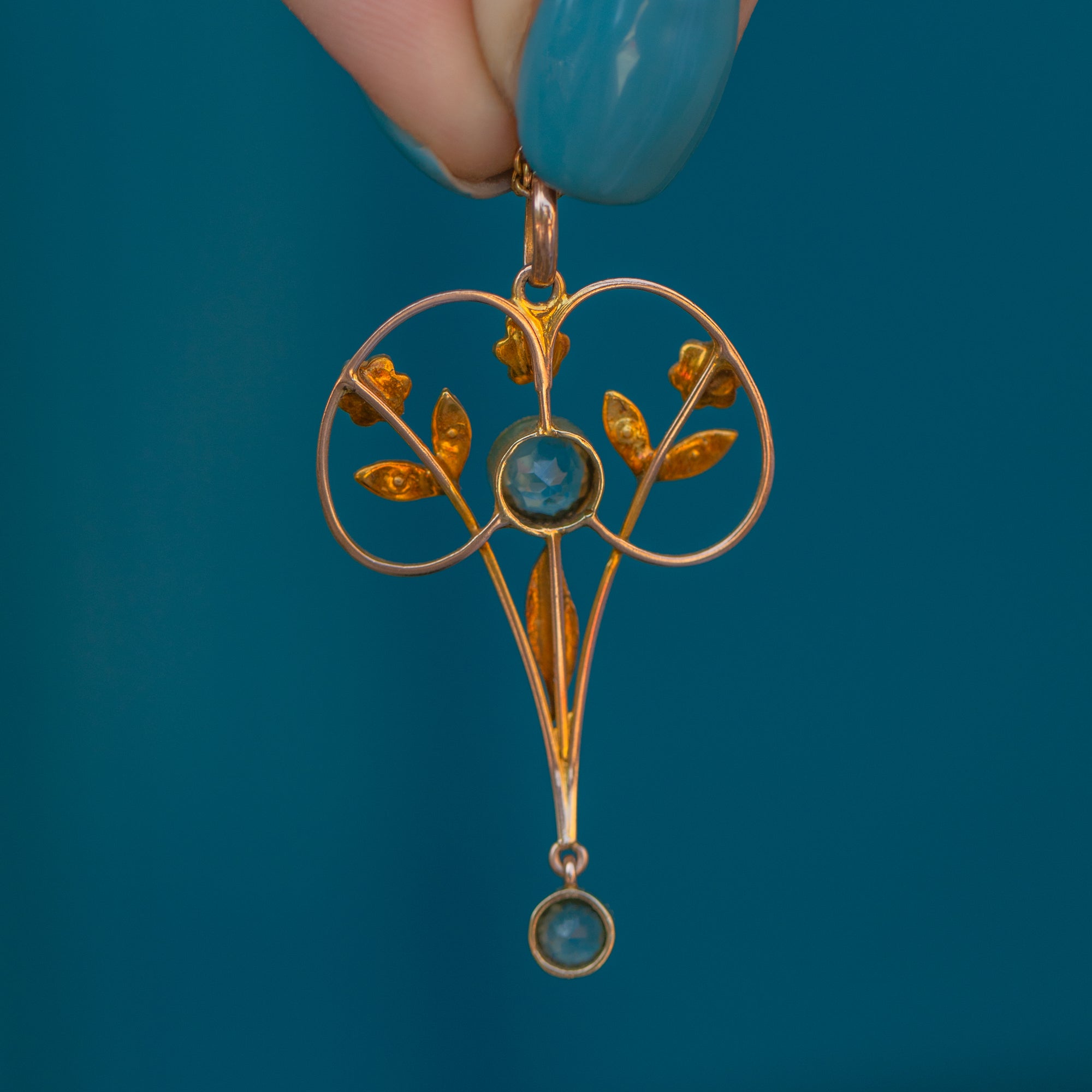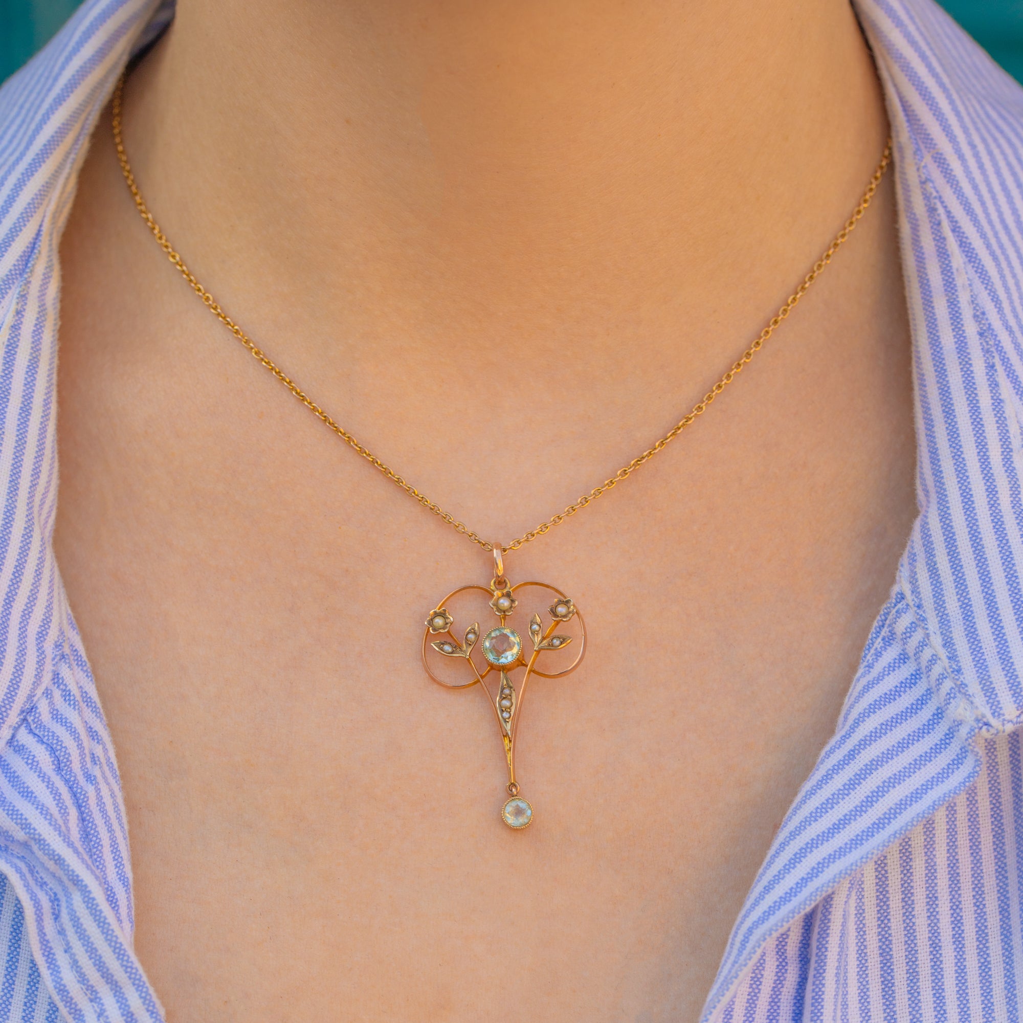 This exquisite Art Nouveau 9ct Gold Aquamarine Pearl Lavalier pendant is a captivating blend of elegance and charm. Crafted during the illustrious Art Nouveau era, this pendant is a testament to the refined craftsmanship of the time. A central icy Aquamarine is encompassed by three Gold budding flowers, each one adorning shimmering Pearls. She is enchanting us at every turn!