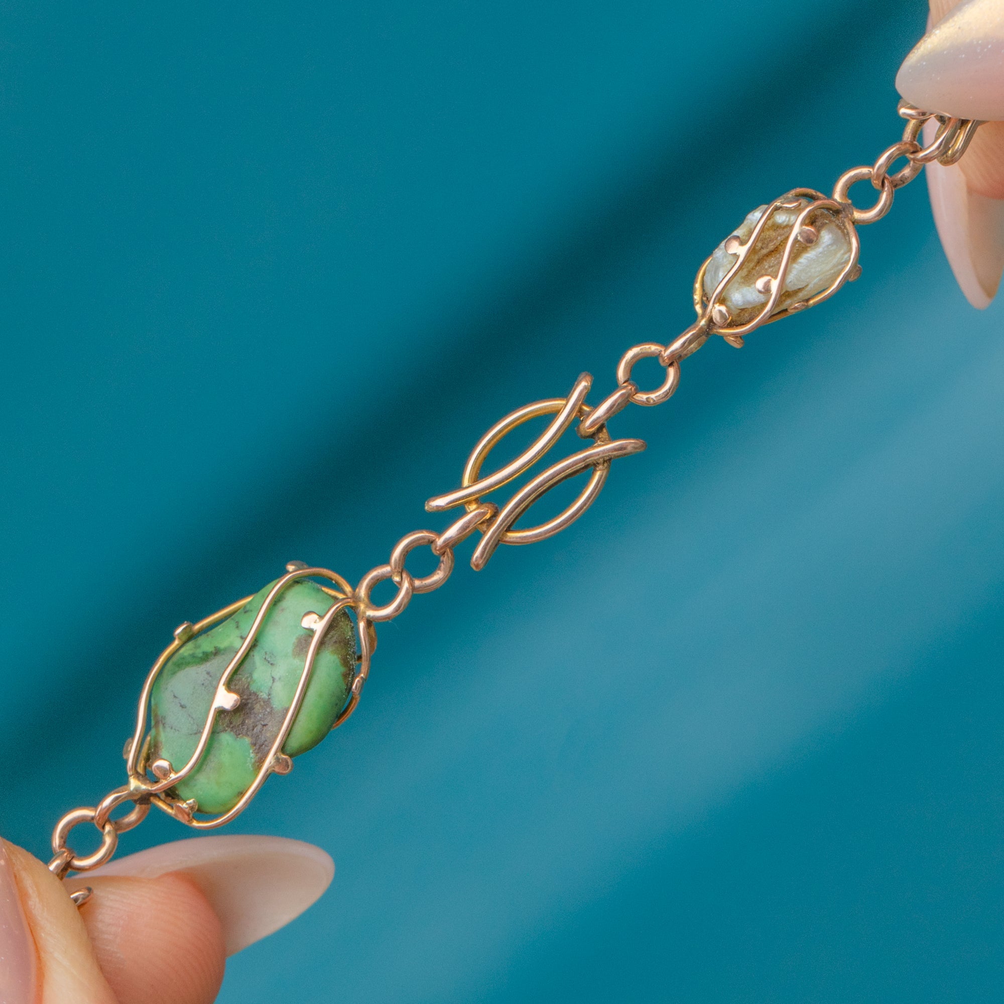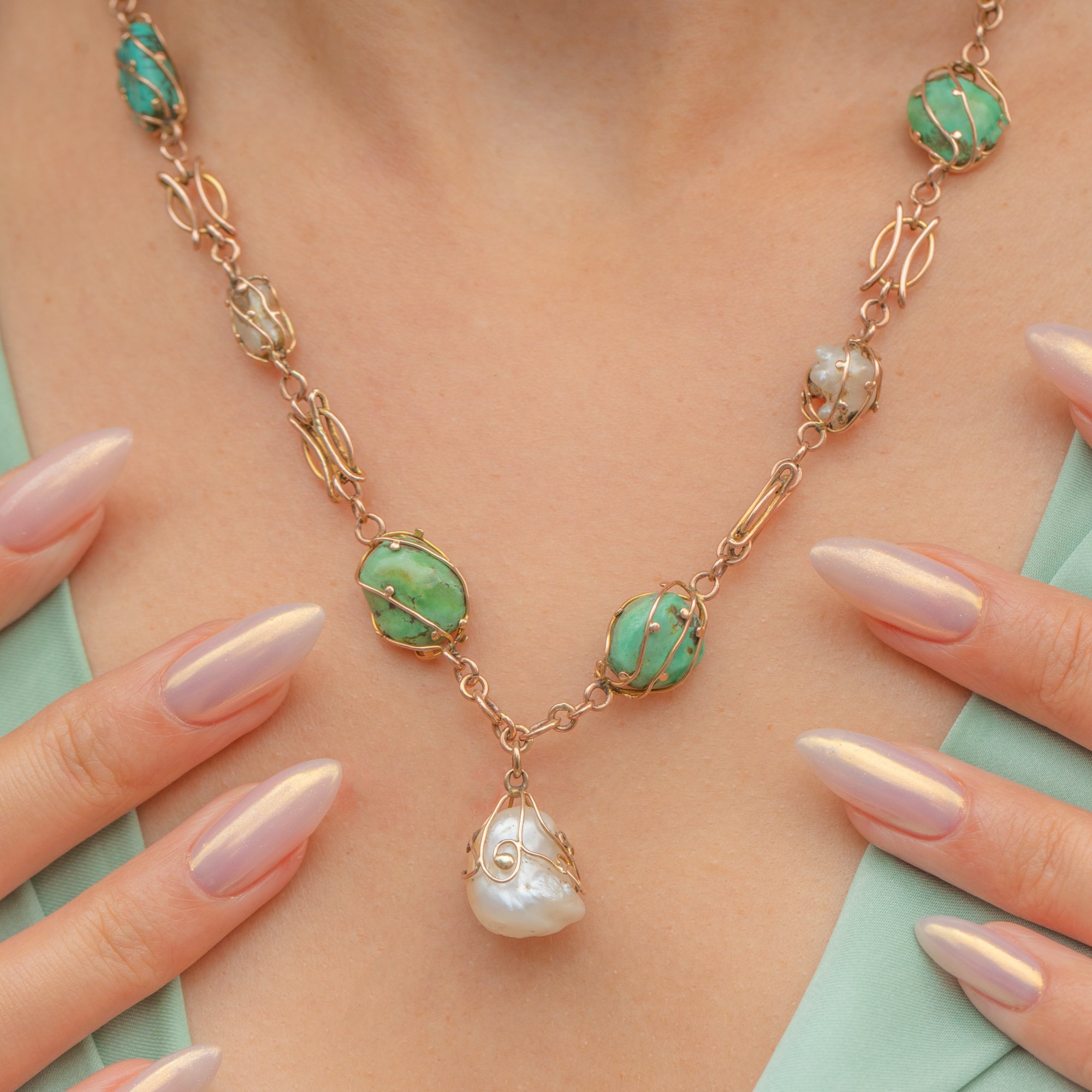 This Art Nouveau 9ct Gold necklace showcases a graceful arrangement of Matrix Turquoise and Baroque Pearls, beautifully graduating in size along the 16" chain.