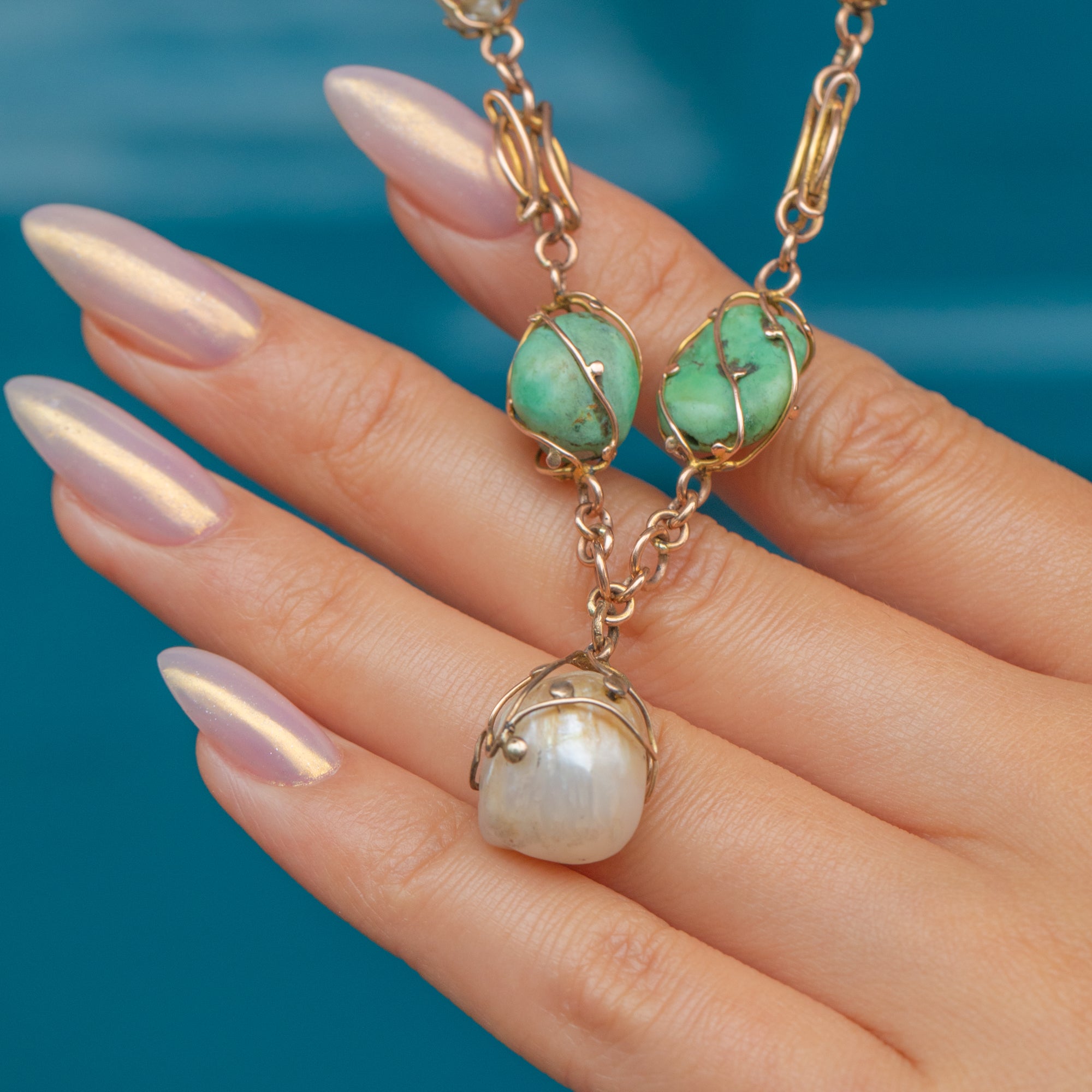 Art Nouveau 9ct Gold Matrix Turquoise and Baroque Pearl Necklace
