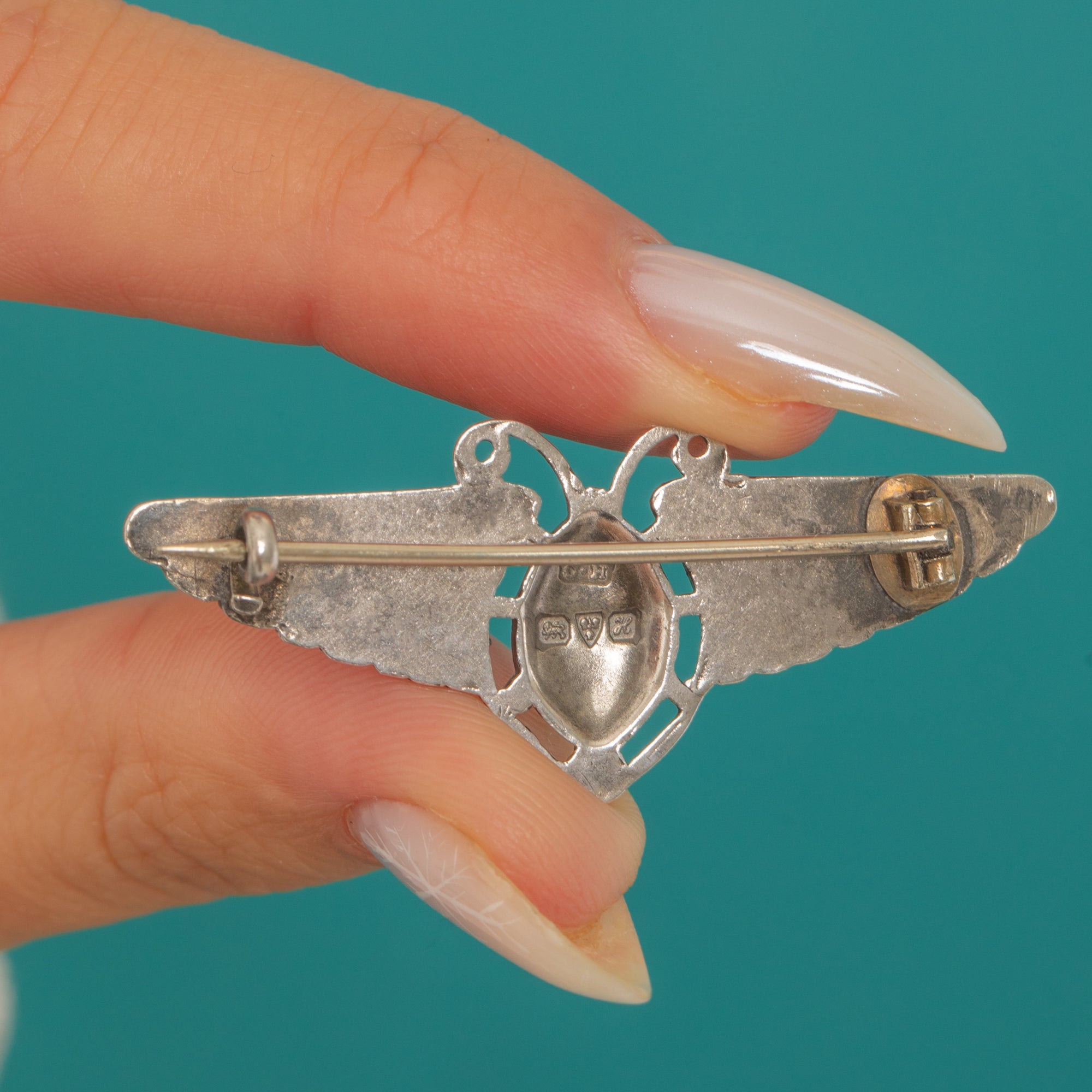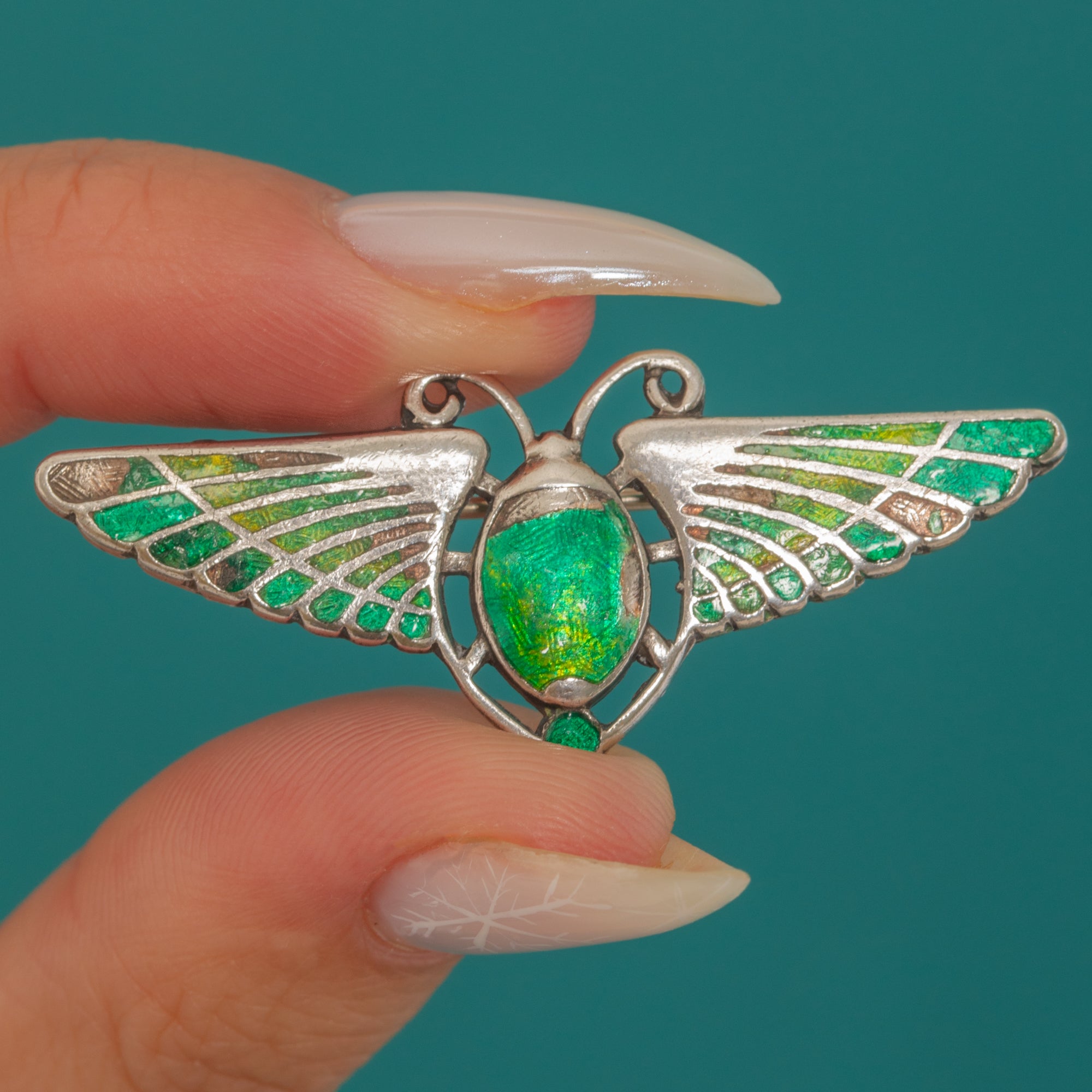 A rare Art Nouveau scarab brooch by Charles Horner, crafted in Sterling Silver with beautifully segmented, variegated green Enamel wings. The openwork silhouette and curling antennae capture the movement and grace of the period, while a lustrous green Enamel section forms the body with a smaller green accent below for balance.