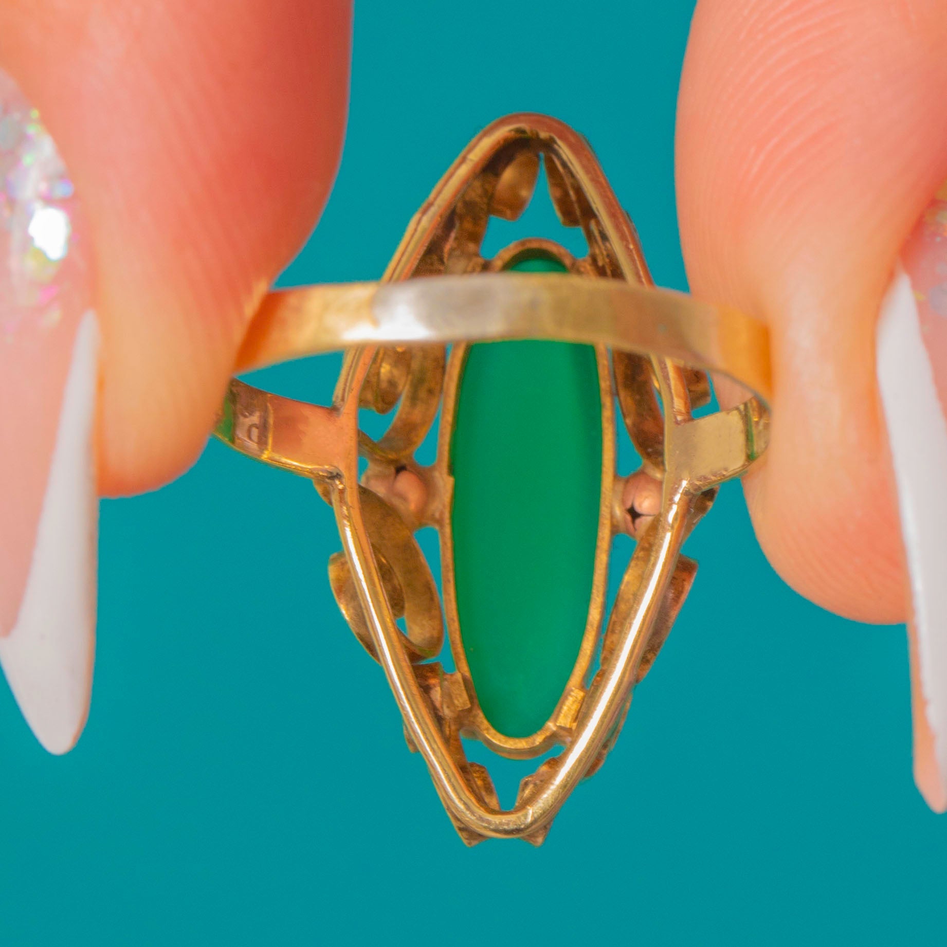 EXCELLENT: The green Chalcedony is smooth, glossy and free from damage and glowing bright! The solid 14ct Gold band is well-shaped and polished well with a gorgeous buttery yellow hue and no re-size marks or thinning to the band.