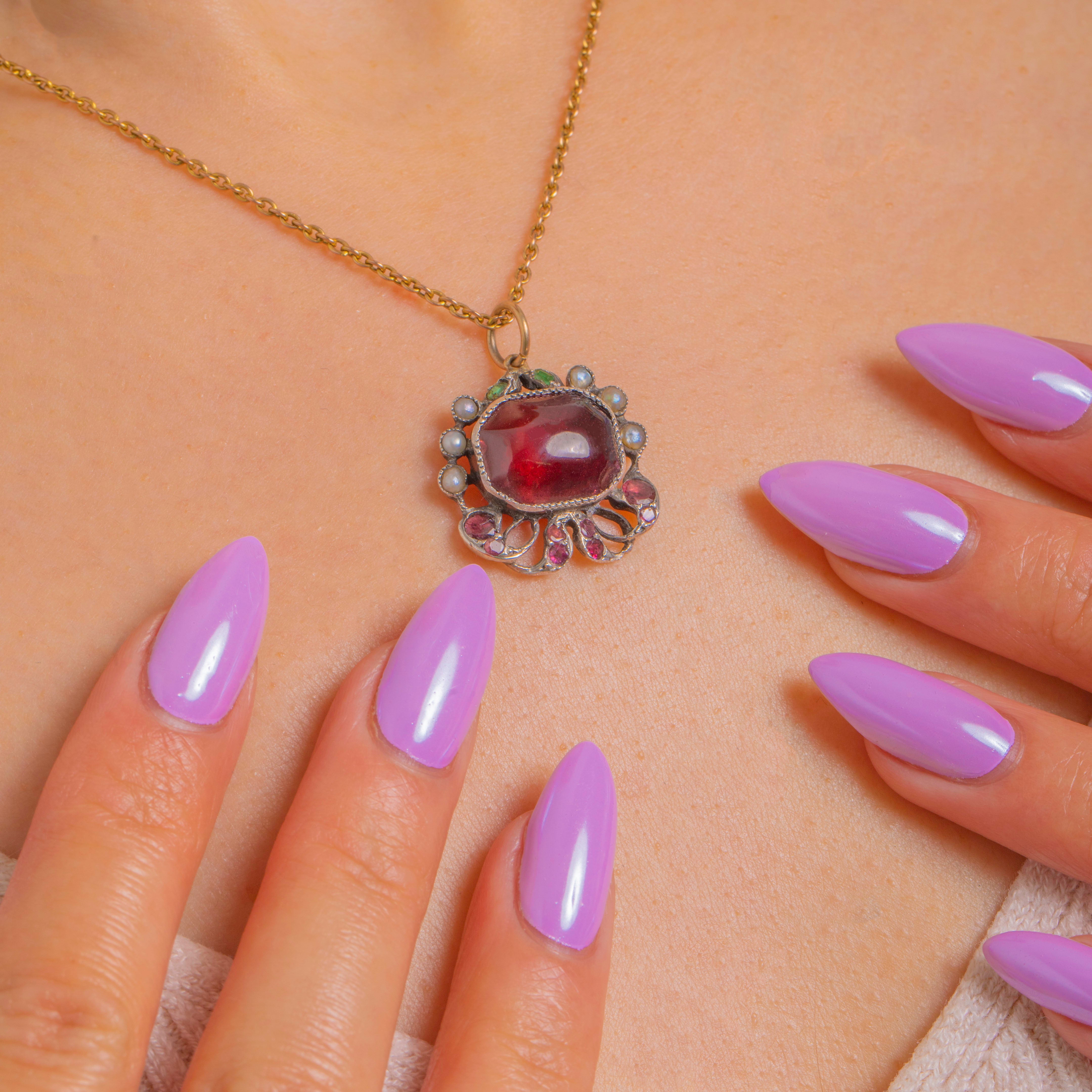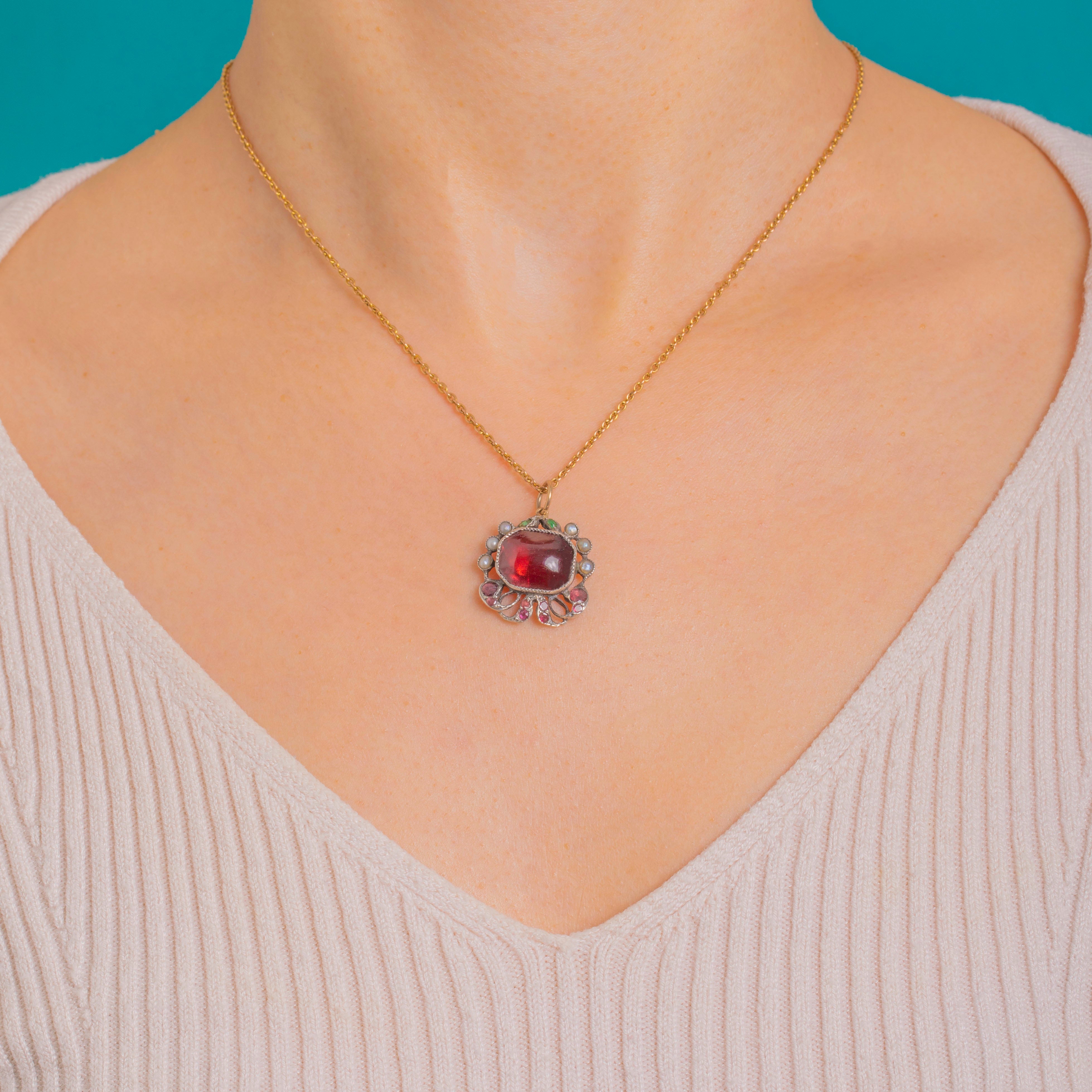 A rich and romantic Austro-Hungarian cherry-red Garnet pendant! Crafted by hand in solid Silver, the glowing domed Garnet cabochon is framed by a dainty halo of creamy Seed Pearls. The openwork foliate and scroll motifs, finished with delicate Emerald accents, create a lace-like silhouette that feels both ornate and exquisitely refined.