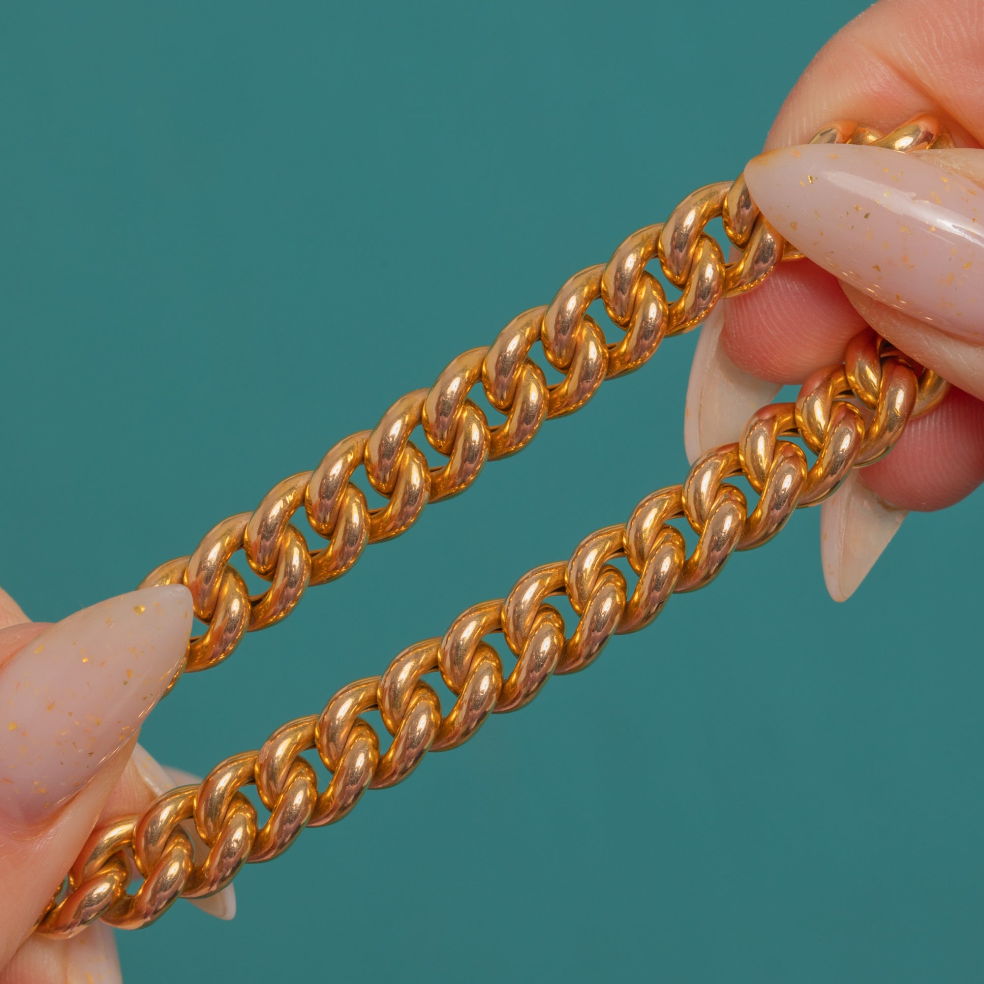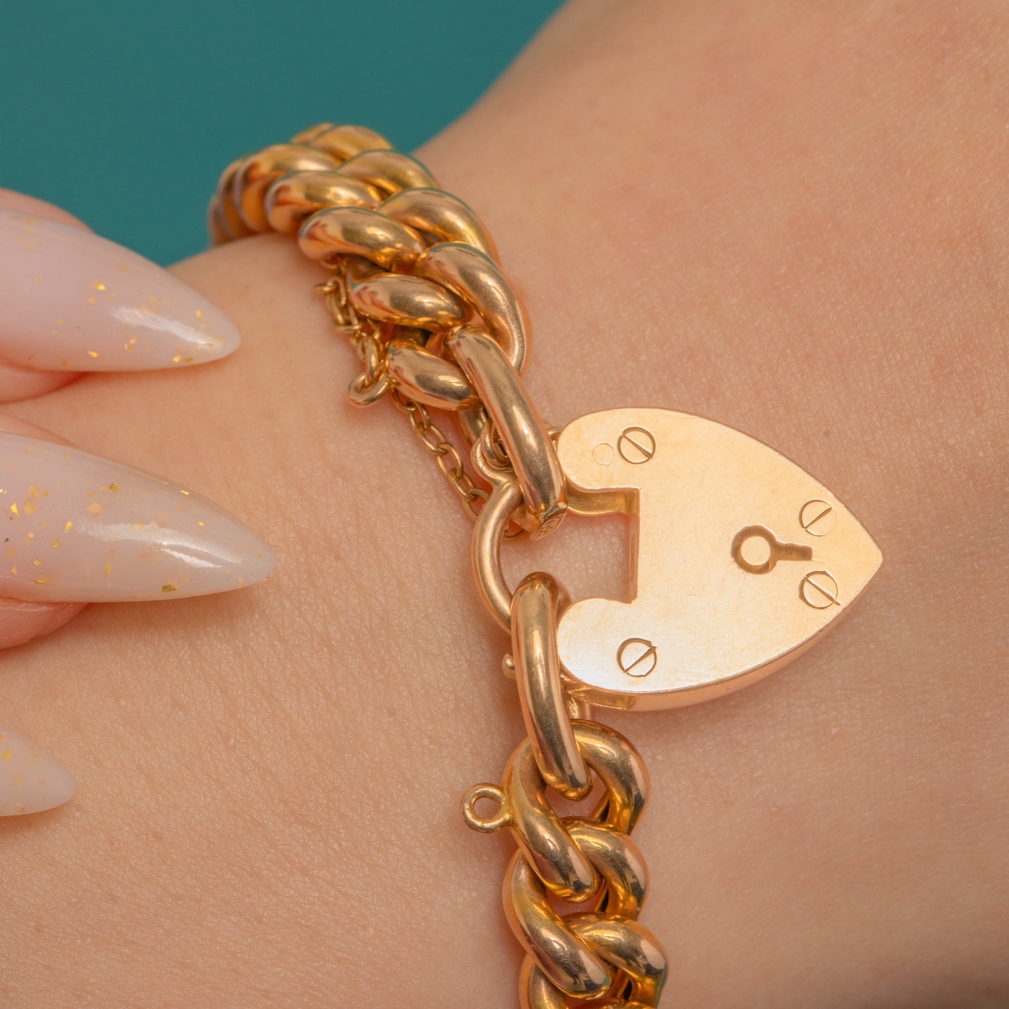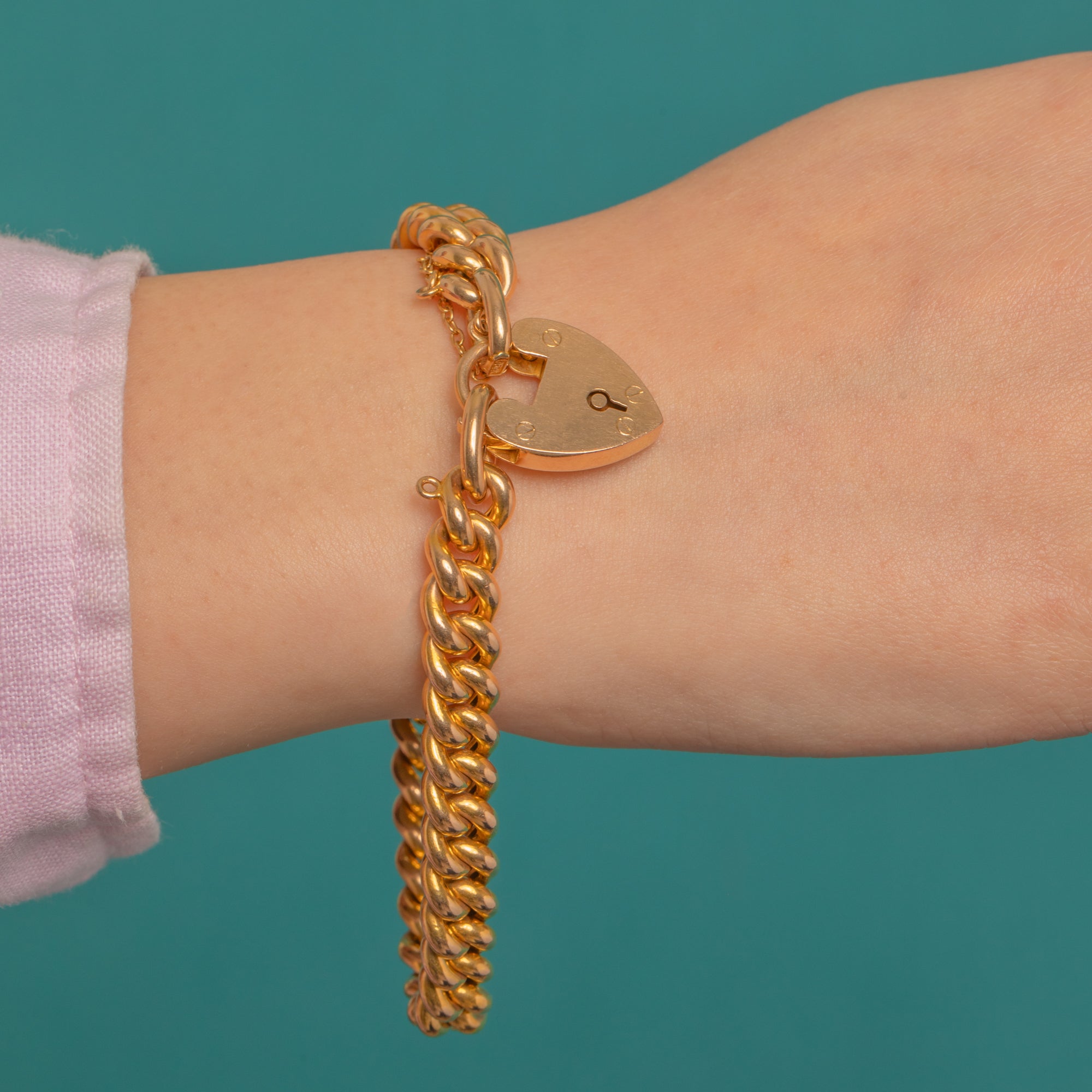 Crafted in glowing 15ct Gold, this Edwardian curb link bracelet is a timeless treasure with a romantic twist. The uniform, rounded links gleam with a high-polish finish, closing with a classic heart padlock clasp complete with engraved keyhole and decorative faux screw-head details. An integrated safety chain offers added peace of mind, with a small additional jump ring beside the clasp for versatility.
