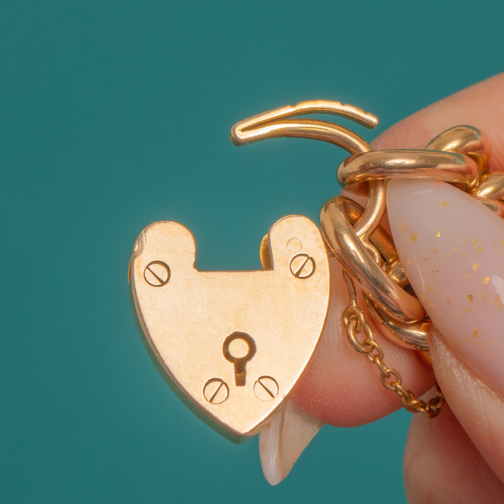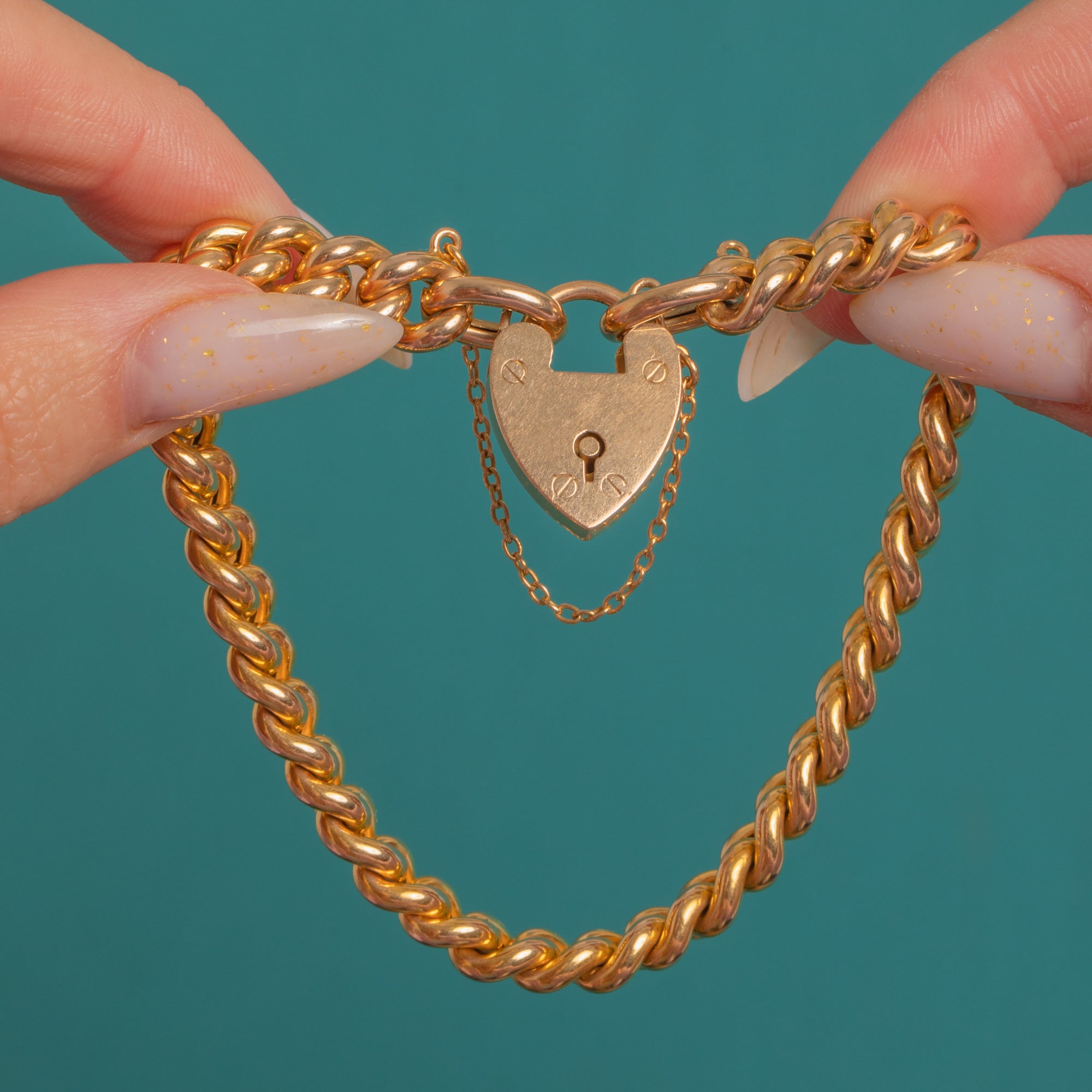 VERY GOOD: Bright polish with light surface wear and fine hairline scratches to the Gold commensurate with age. Links are well-formed and the heart padlock clasp and hinge align and function well; the safety chain is intact.