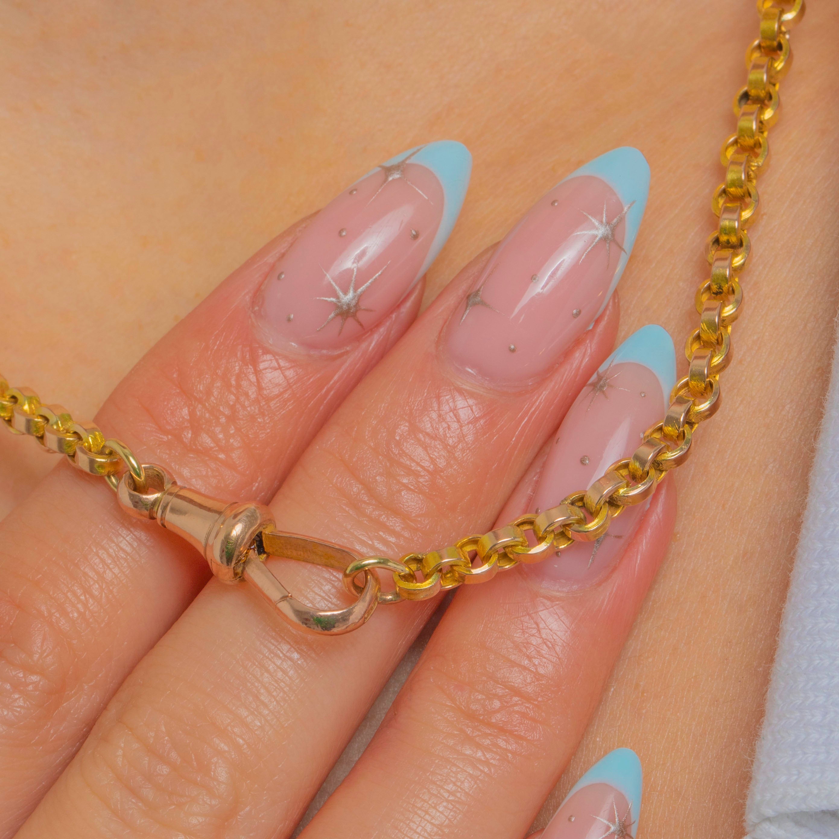 VERY GOOD: Light, even surface wear and minor abrasions to the links consistent with age and use. The links are secure and well-formed with some expected rubbing to a few links. The spring dog clip operates crisply and closes securely, with no visible repairs.
