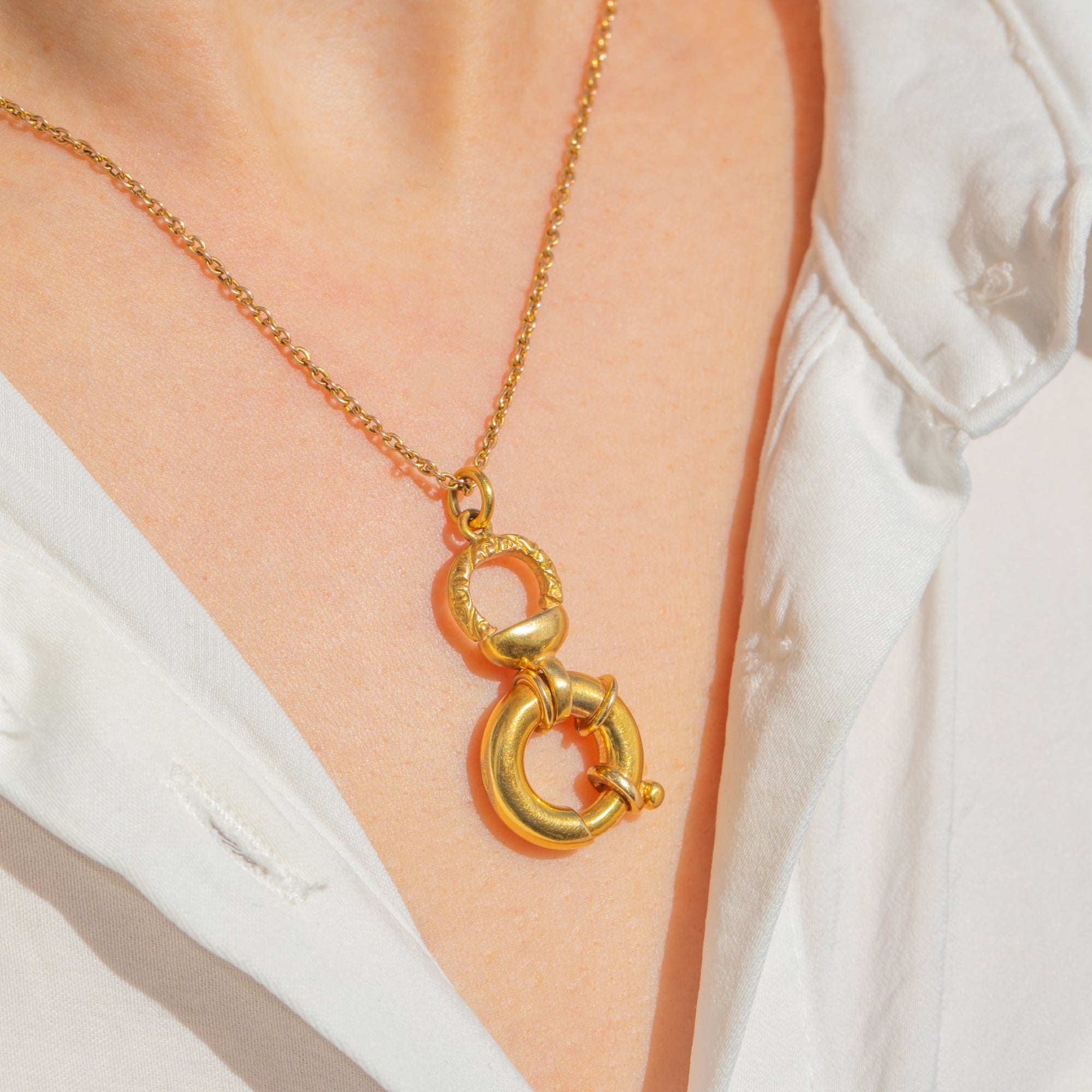 Sculptural and satisfyingly chunky, this Victorian 9ct Gold charm holder brings a bold, architectural twist to your layering. The articulated design features a textured oval bail with subtle chased detail, leading to a sleek connector and a generous tubular bolt ring below. Warm, glowing Gold and clean lines make it the perfect focal point for a curated chain stack.