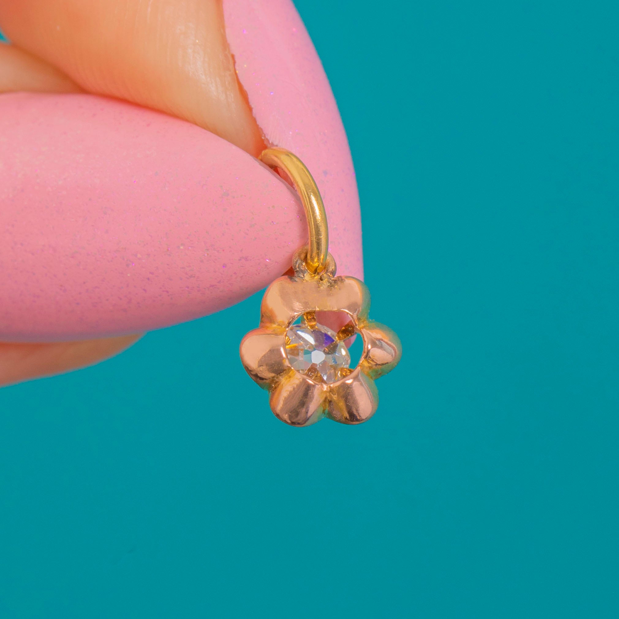 Petite and perfectly formed, this Victorian buttercup charm is crafted in glowing 15ct Gold and set with a bright Diamond at its heart. The classic buttercup setting gently cups the stone so it catches the light beautifully, offering a delicate sparkle in the most refined way.
