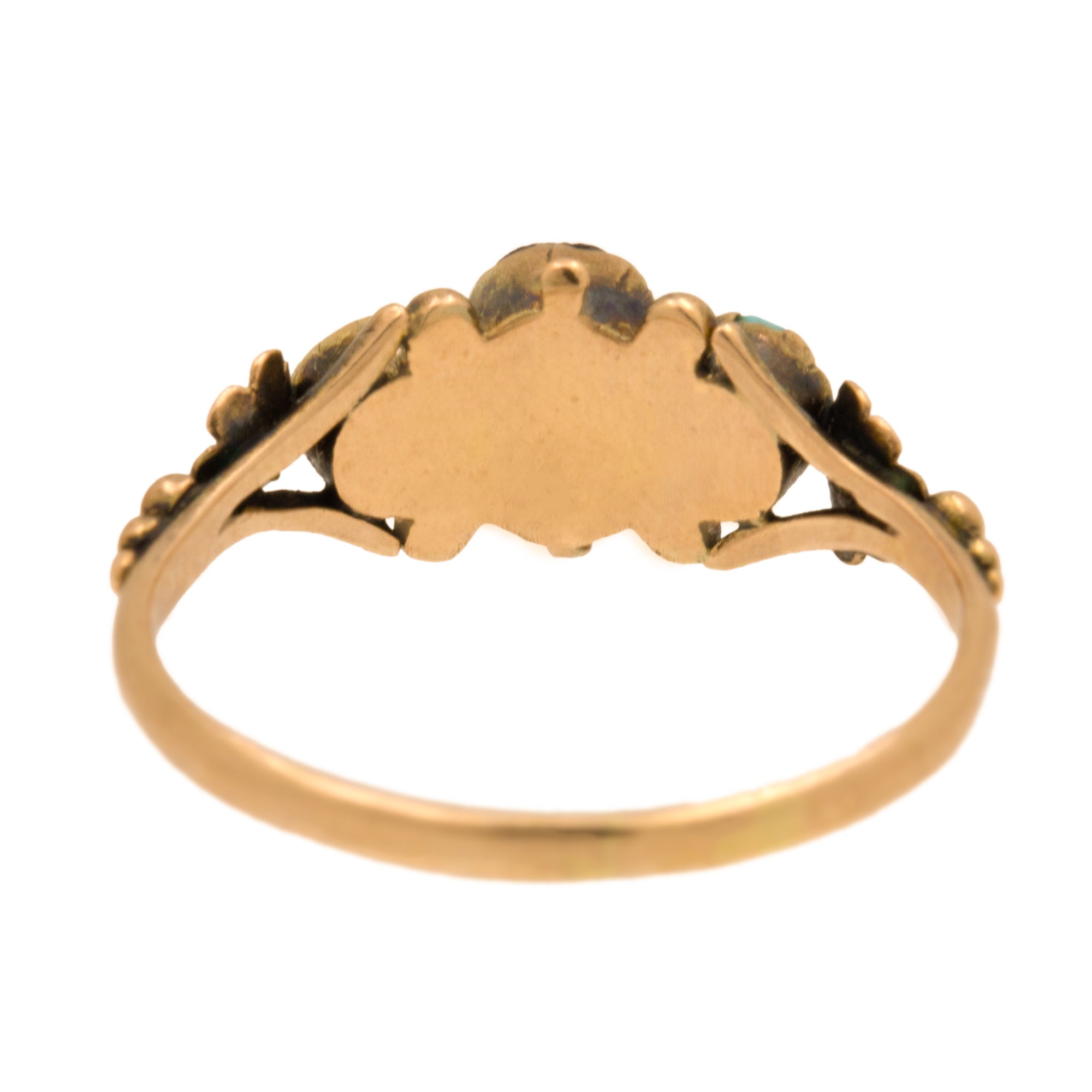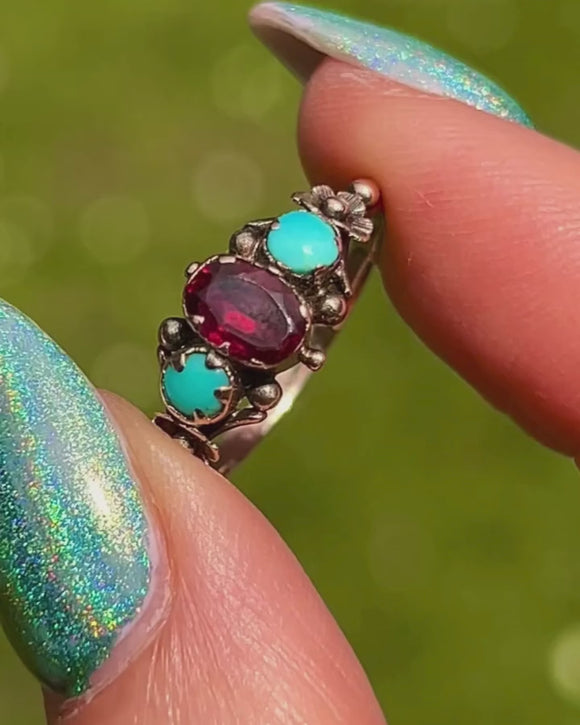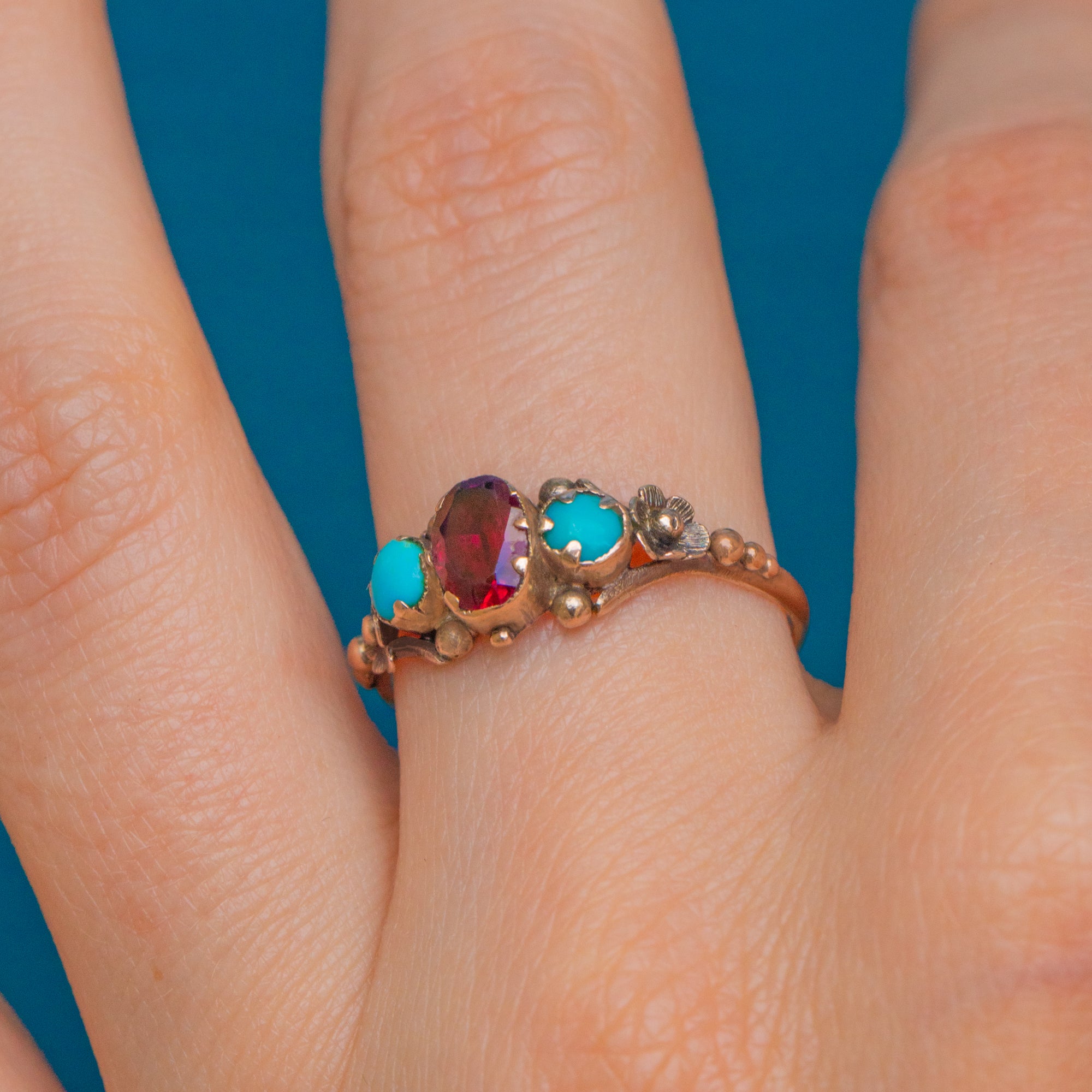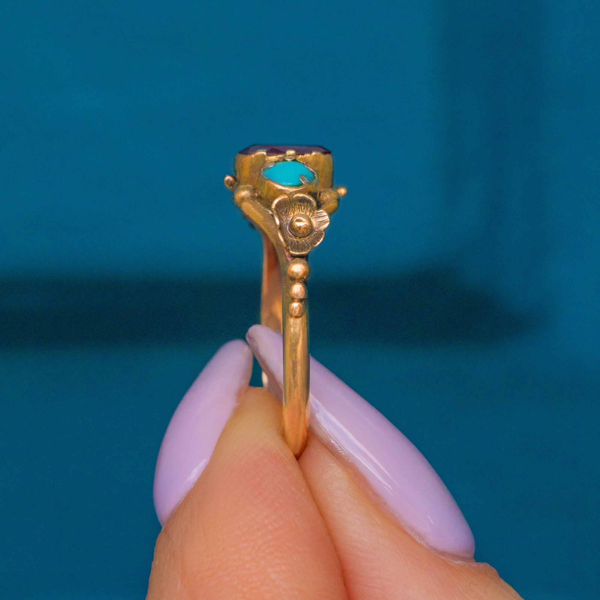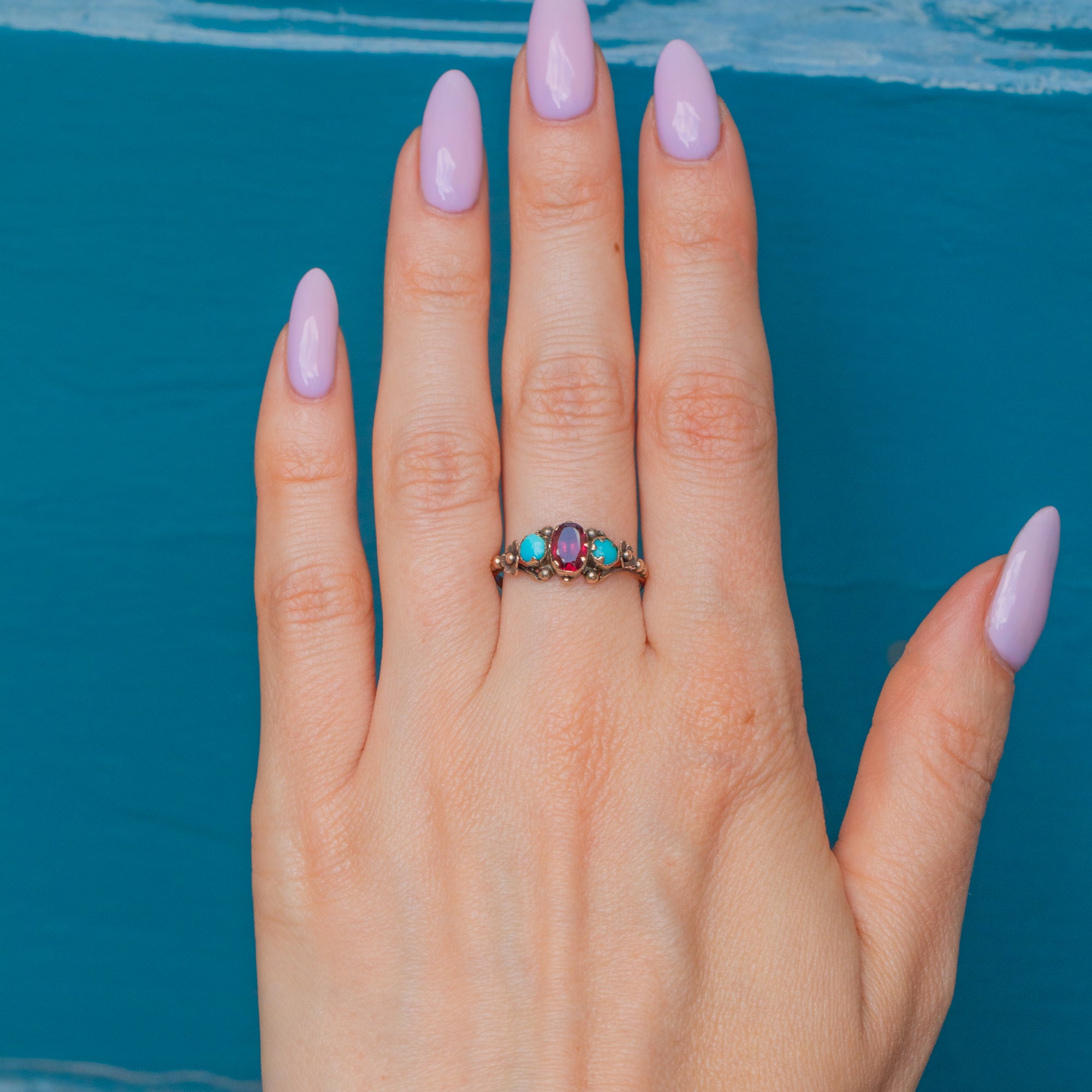 As though plucked from an enchanted forest, this early Victorian 9ct Gold Garnet Turquoise ring will make a captivating addition to your curated ring stack!