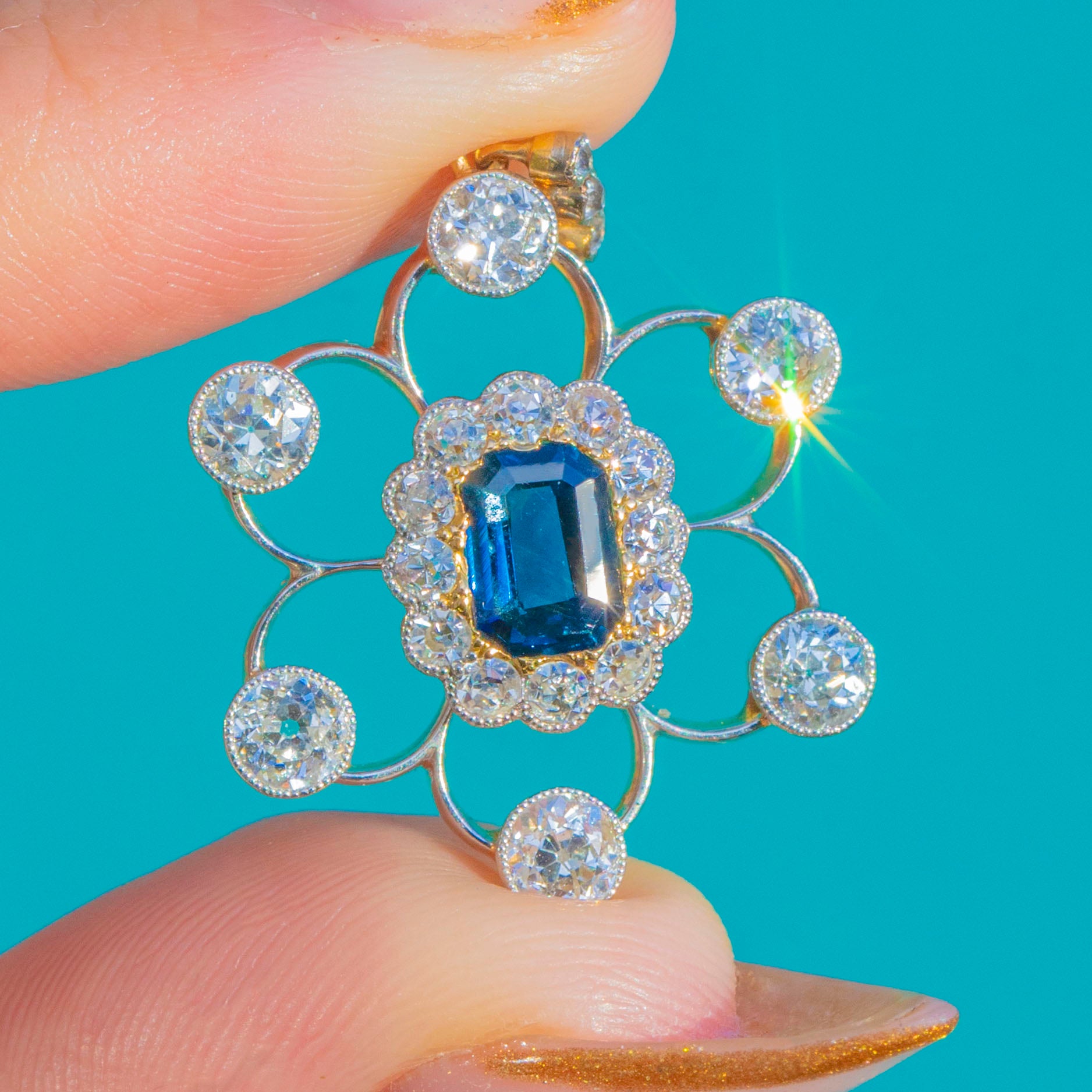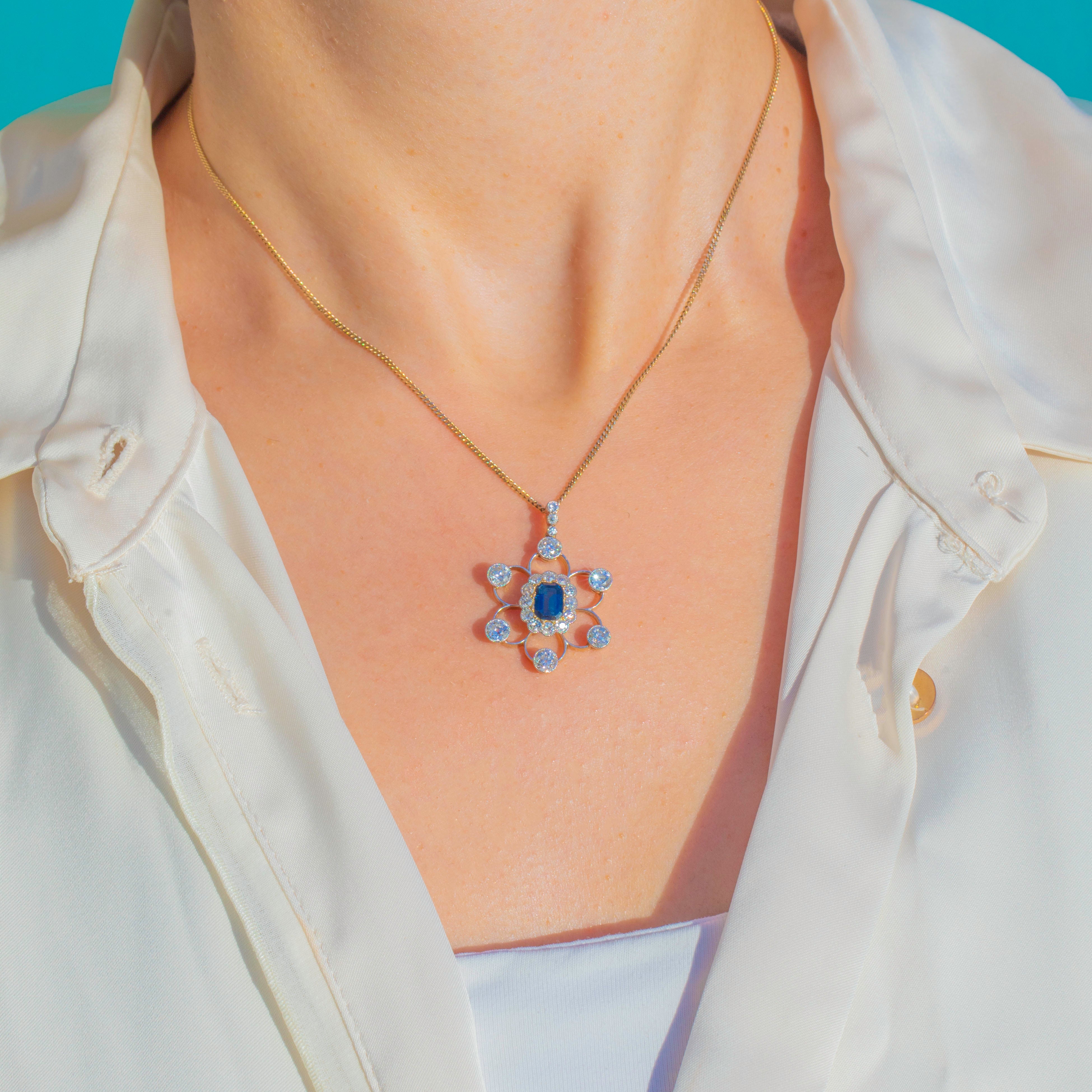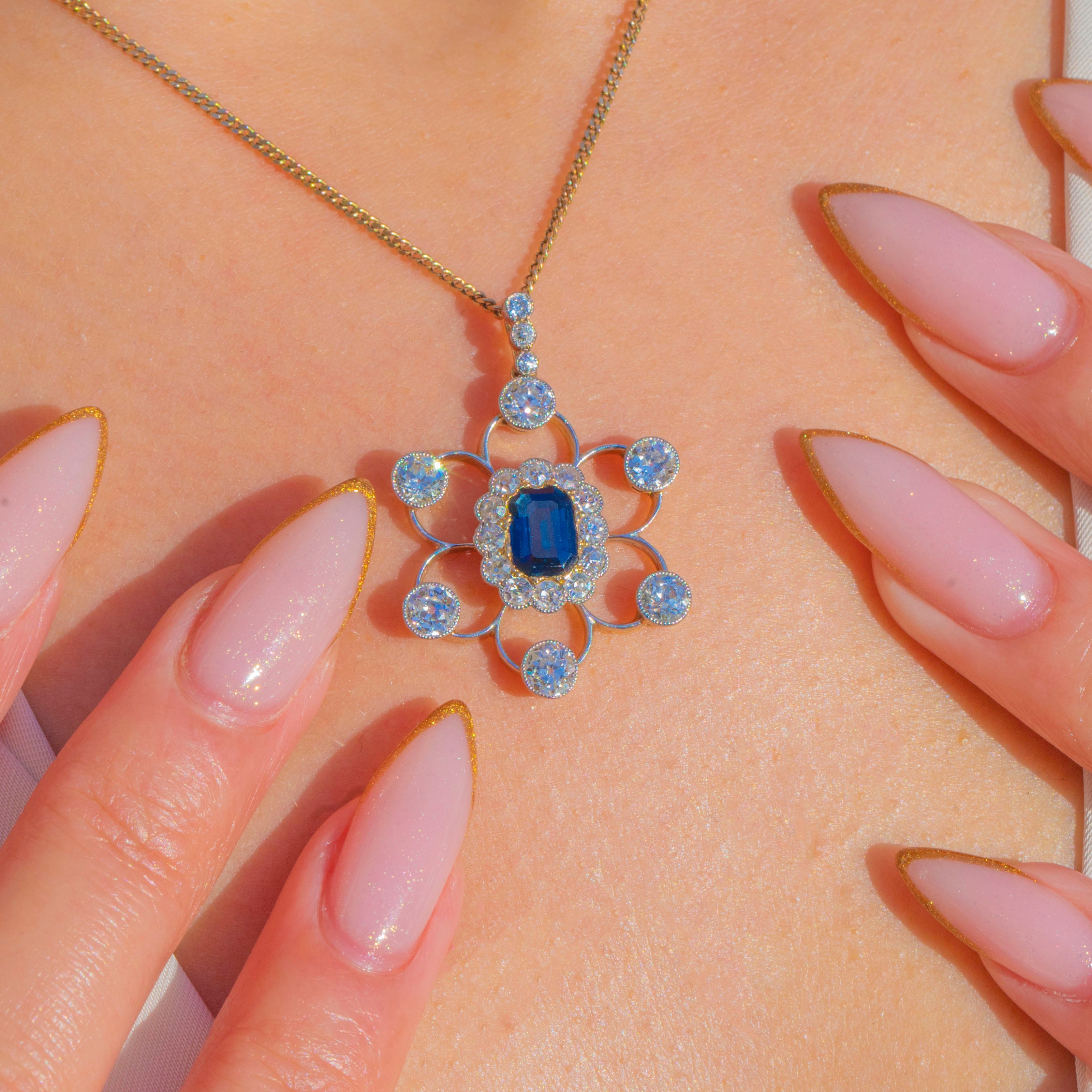This glorious Edwardian Sapphire and Diamond pendant is crafted in 18ct Gold with White Gold settings, arranged in a radiant floral or snowflake design. At the centre sits a rich (natural!) royal-blue Sapphire, surrounded by a sparkling halo of Diamonds and further Diamond clusters that add up to 1.00cts and radiate outwards in a delicate openwork frame.