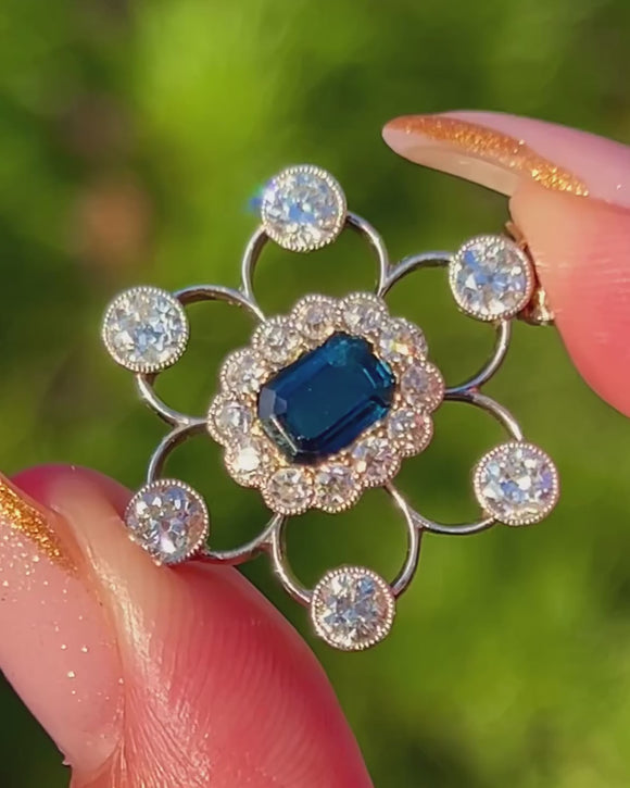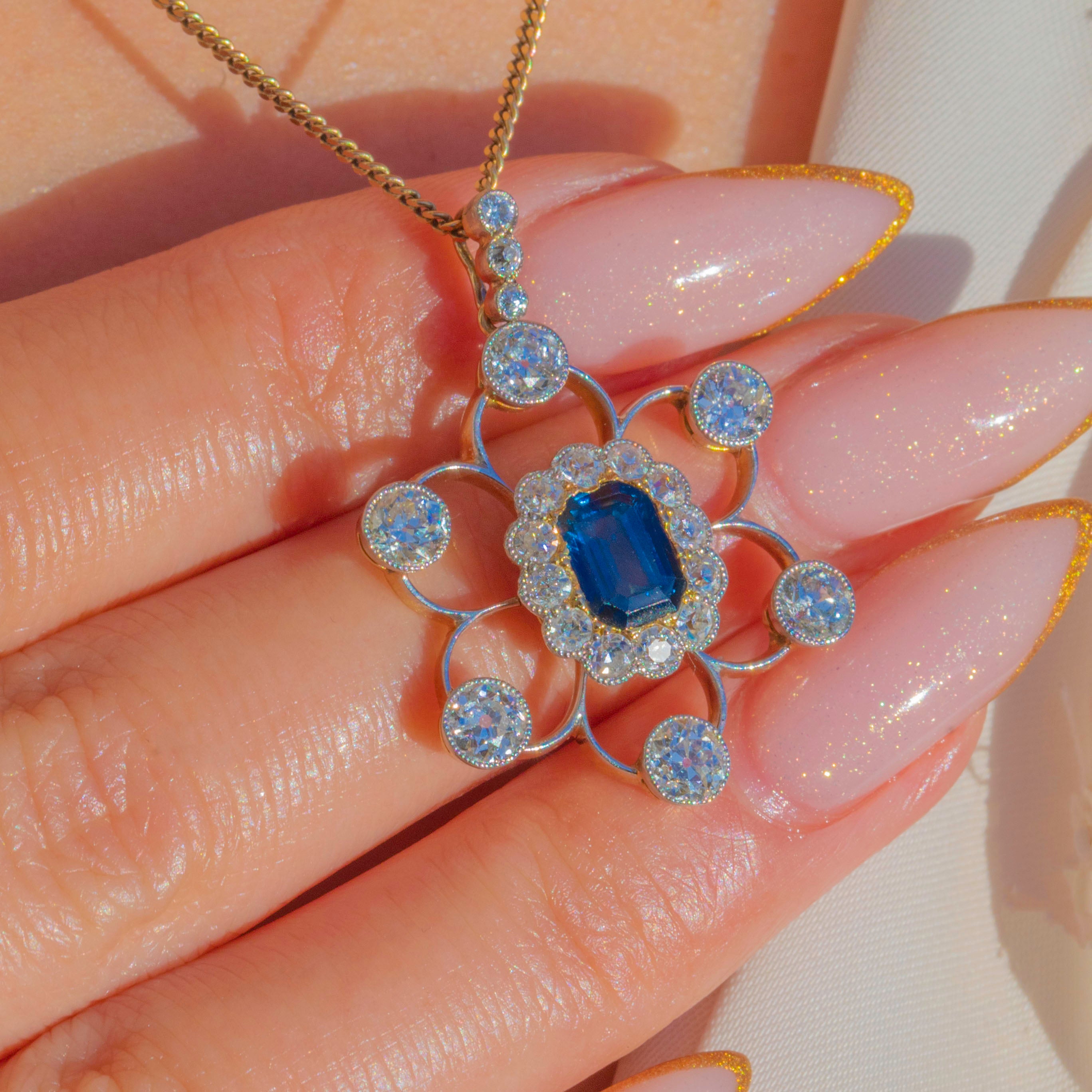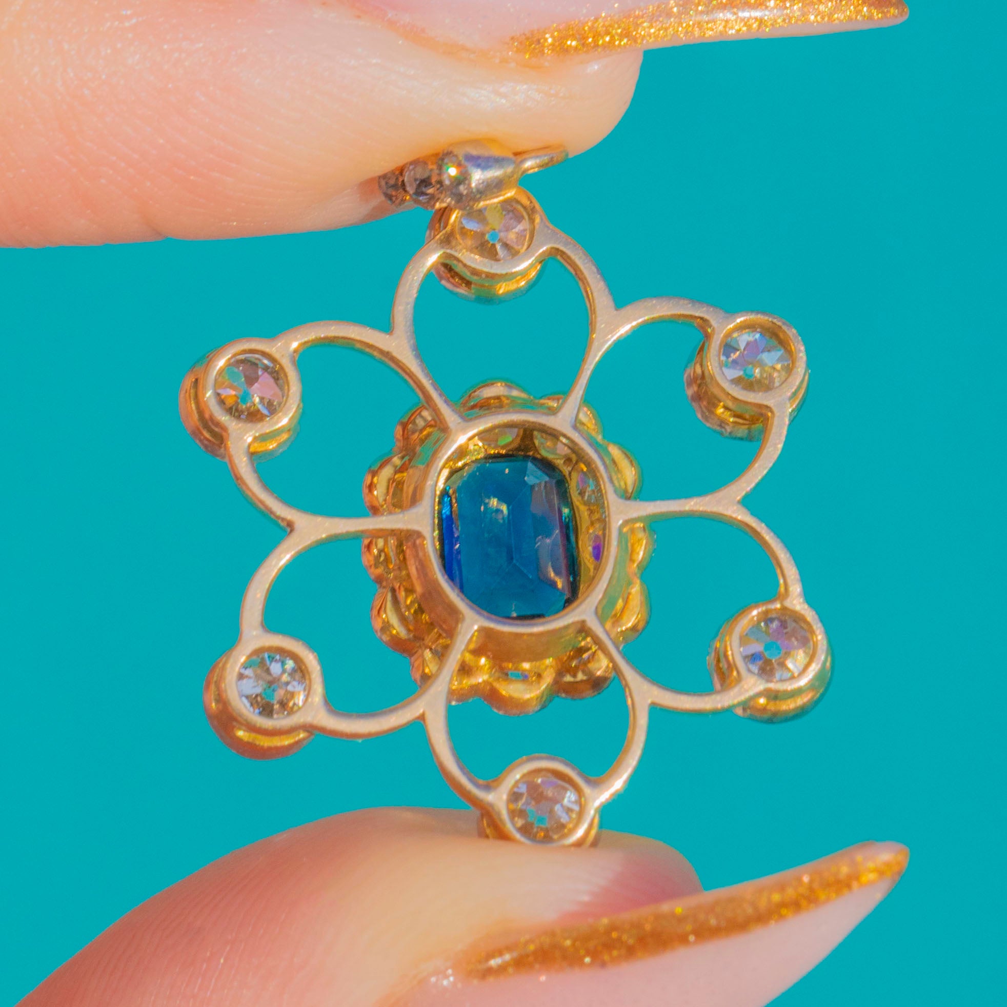 This glorious Edwardian Sapphire and Diamond pendant is crafted in 18ct Gold with White Gold settings, arranged in a radiant floral or snowflake design. At the centre sits a rich (natural!) royal-blue Sapphire, surrounded by a sparkling halo of Diamonds and further Diamond clusters that add up to 1.00cts and radiate outwards in a delicate openwork frame.