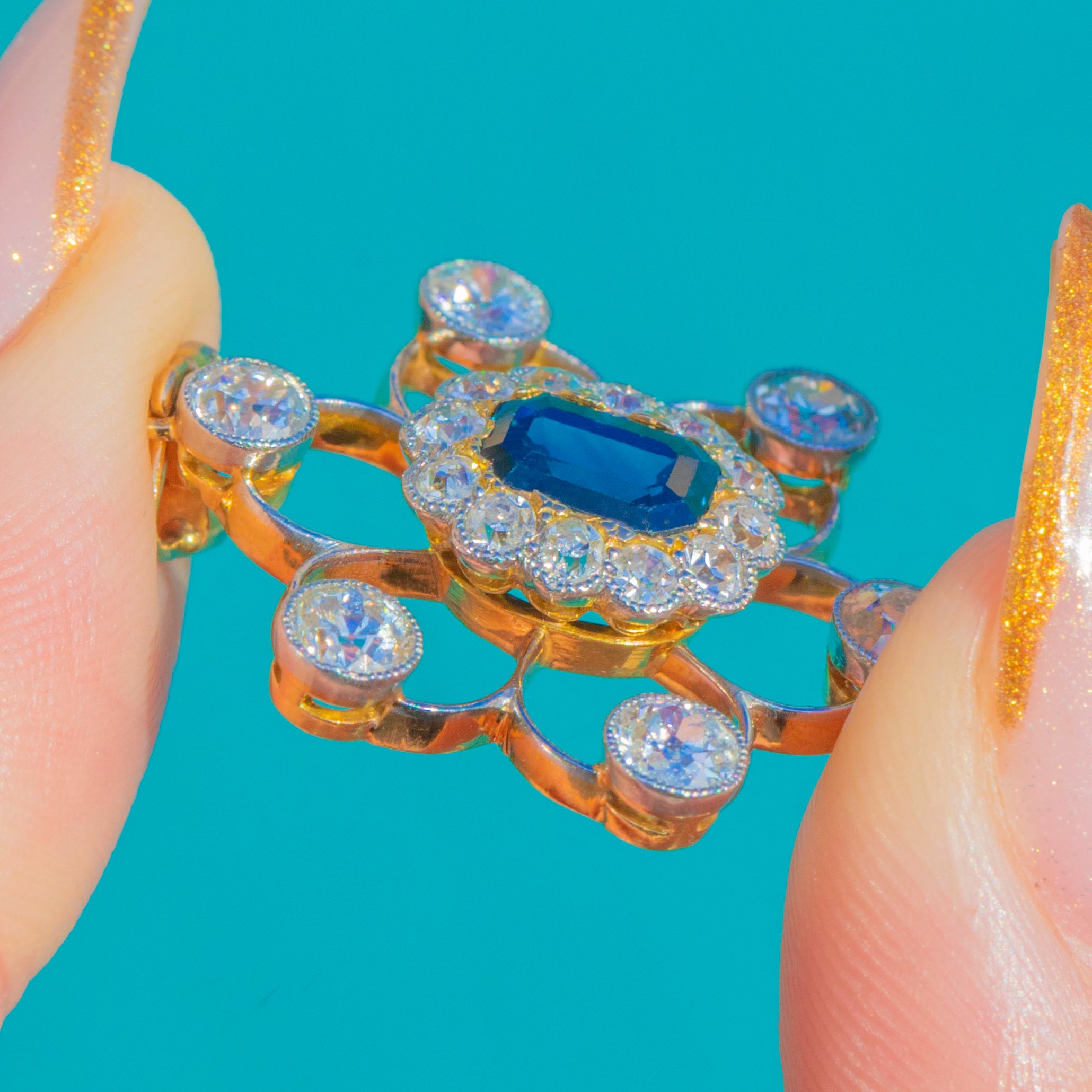 EXCELLENT: The Sapphire is bright and richly coloured, with no evidence of heat treatment. The antique old-mine-cut Diamonds are incredibly bright & lively, and secure in their settings. The solid 18ct Gold framework is crisp with minimal surface wear consistent with age. A beautifully preserved Edwardian pendant!
