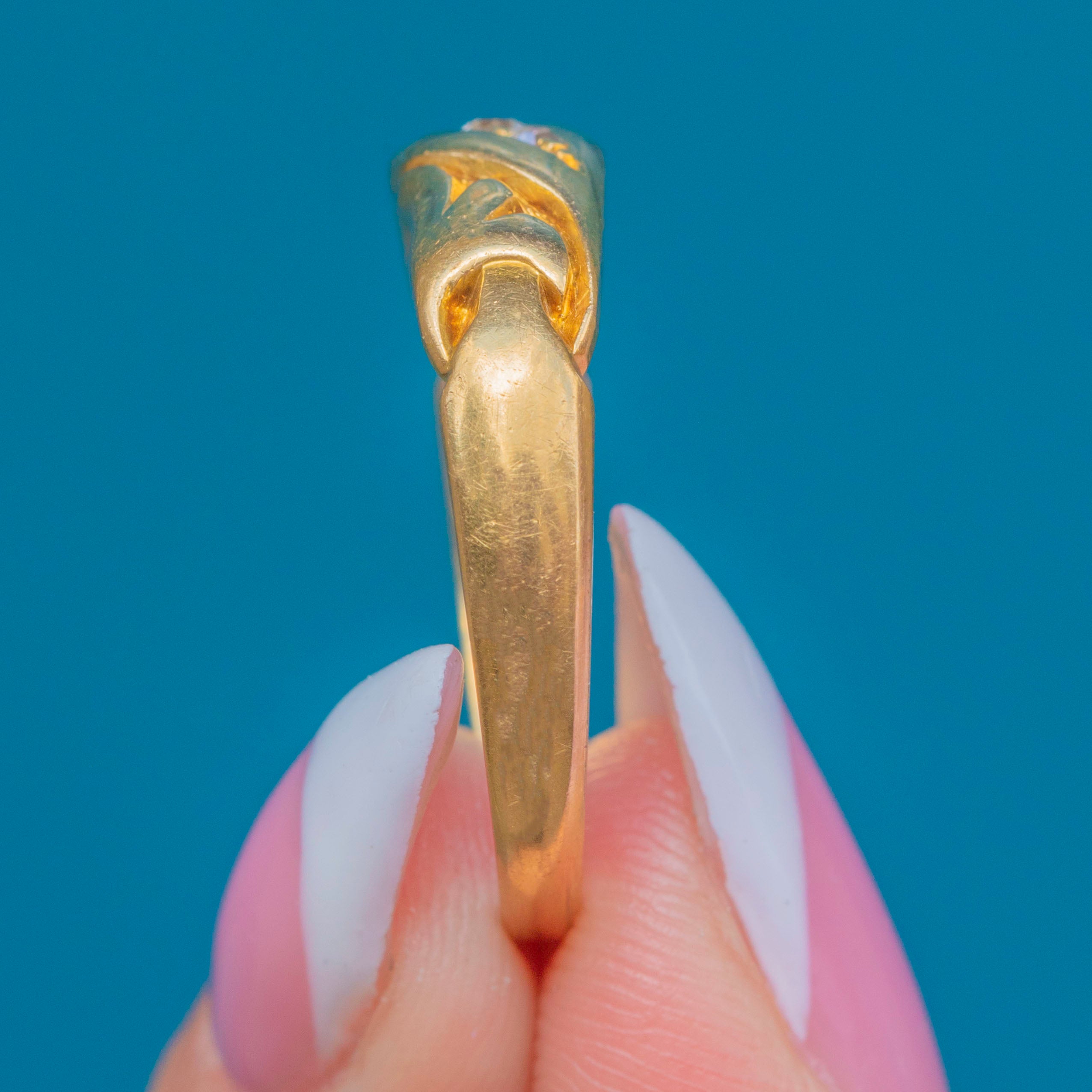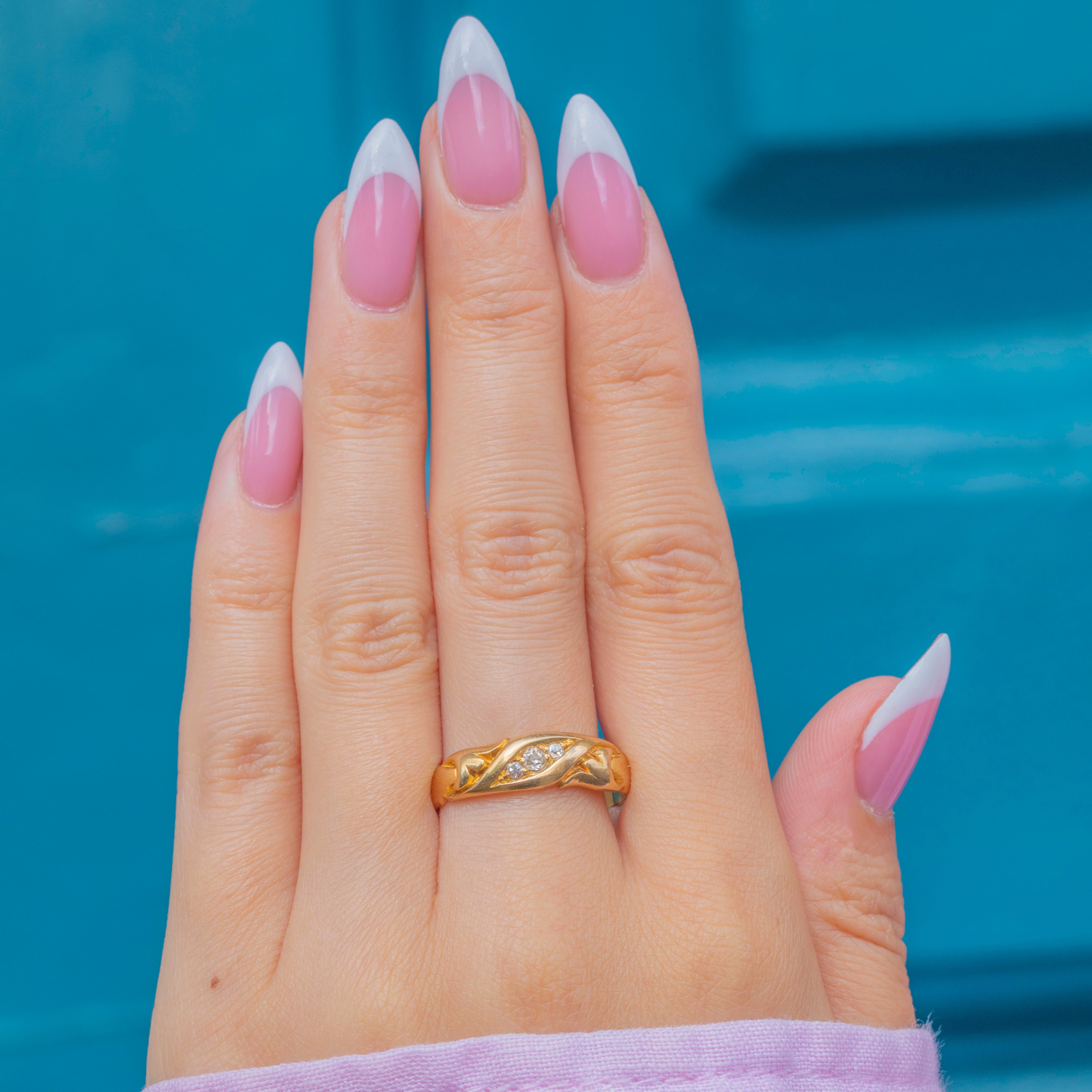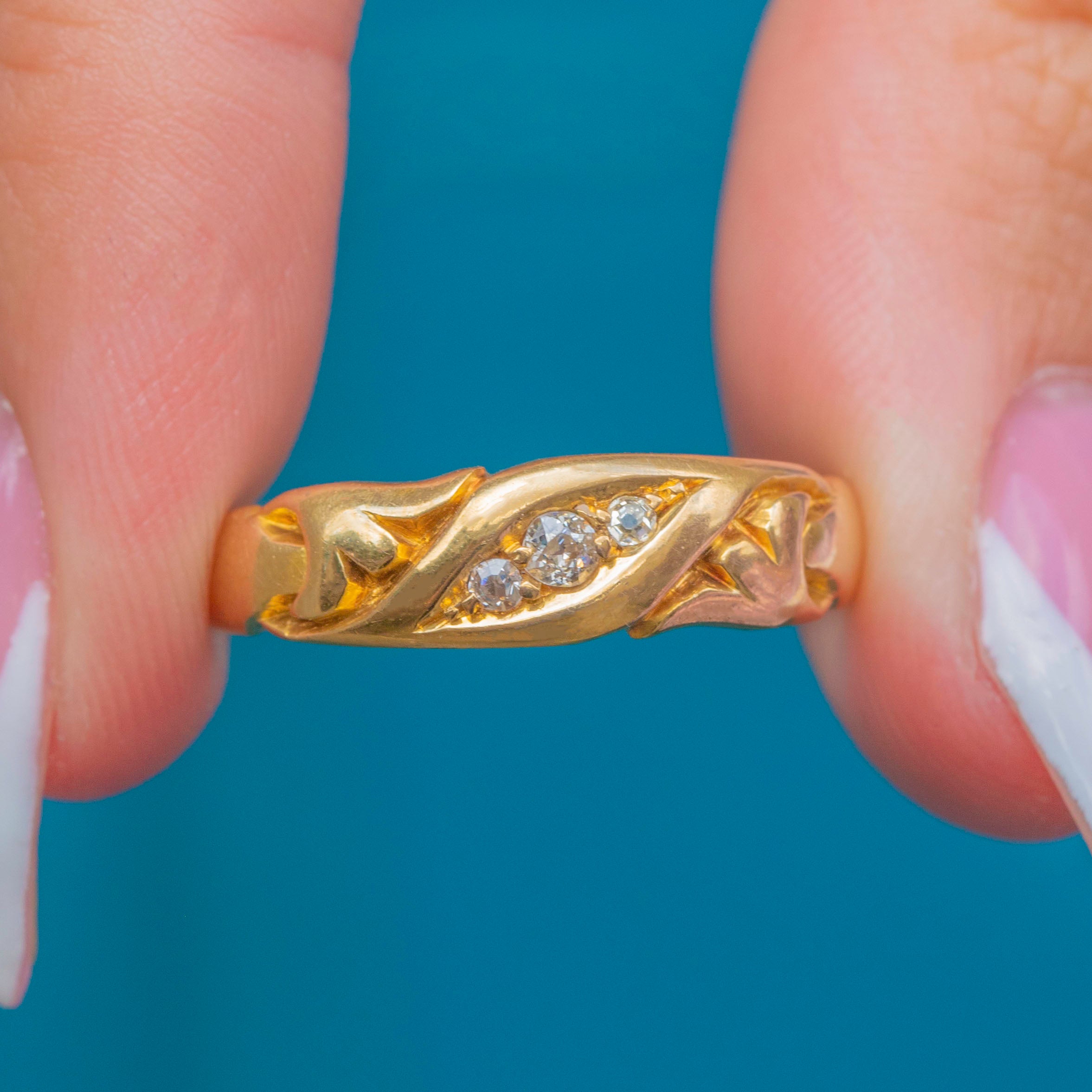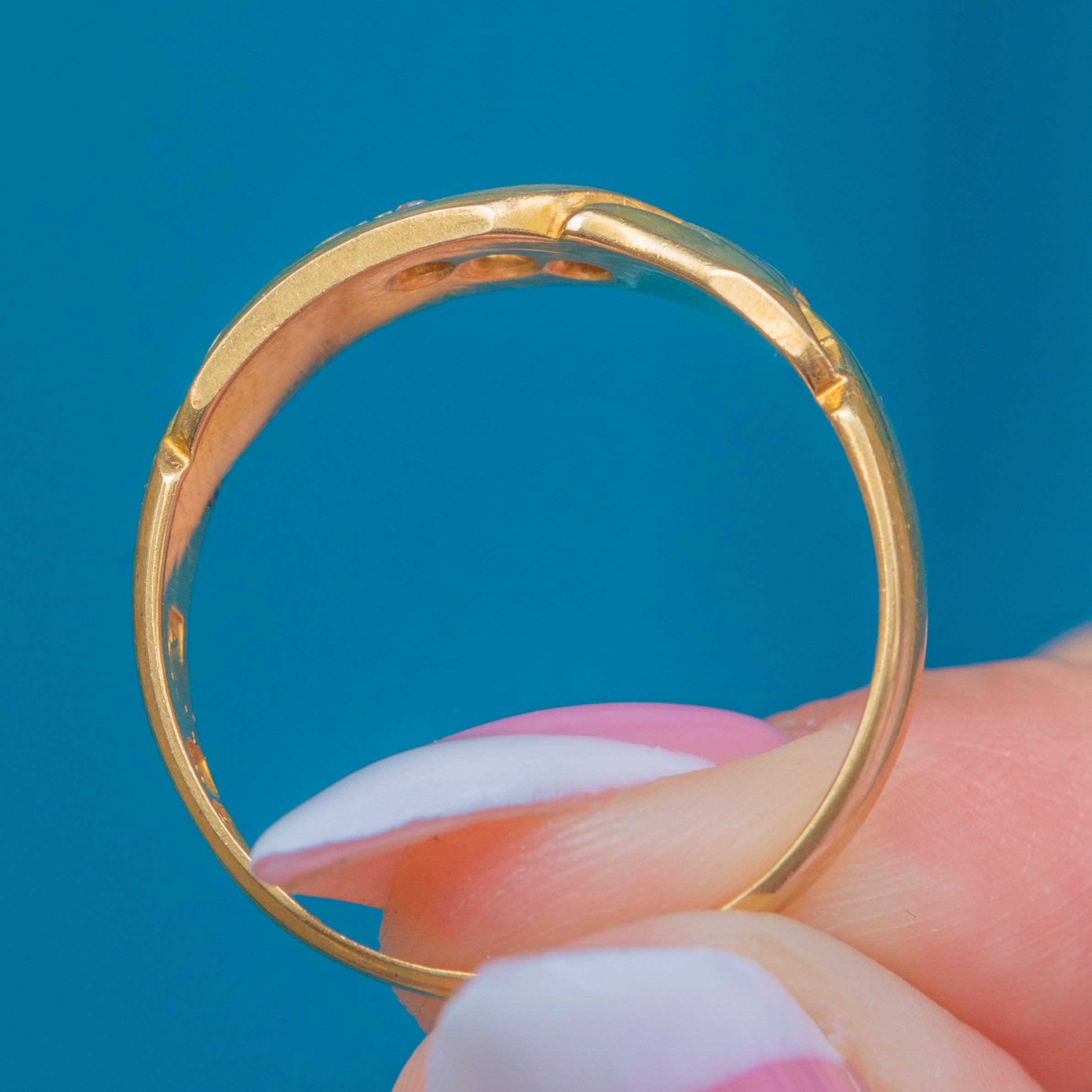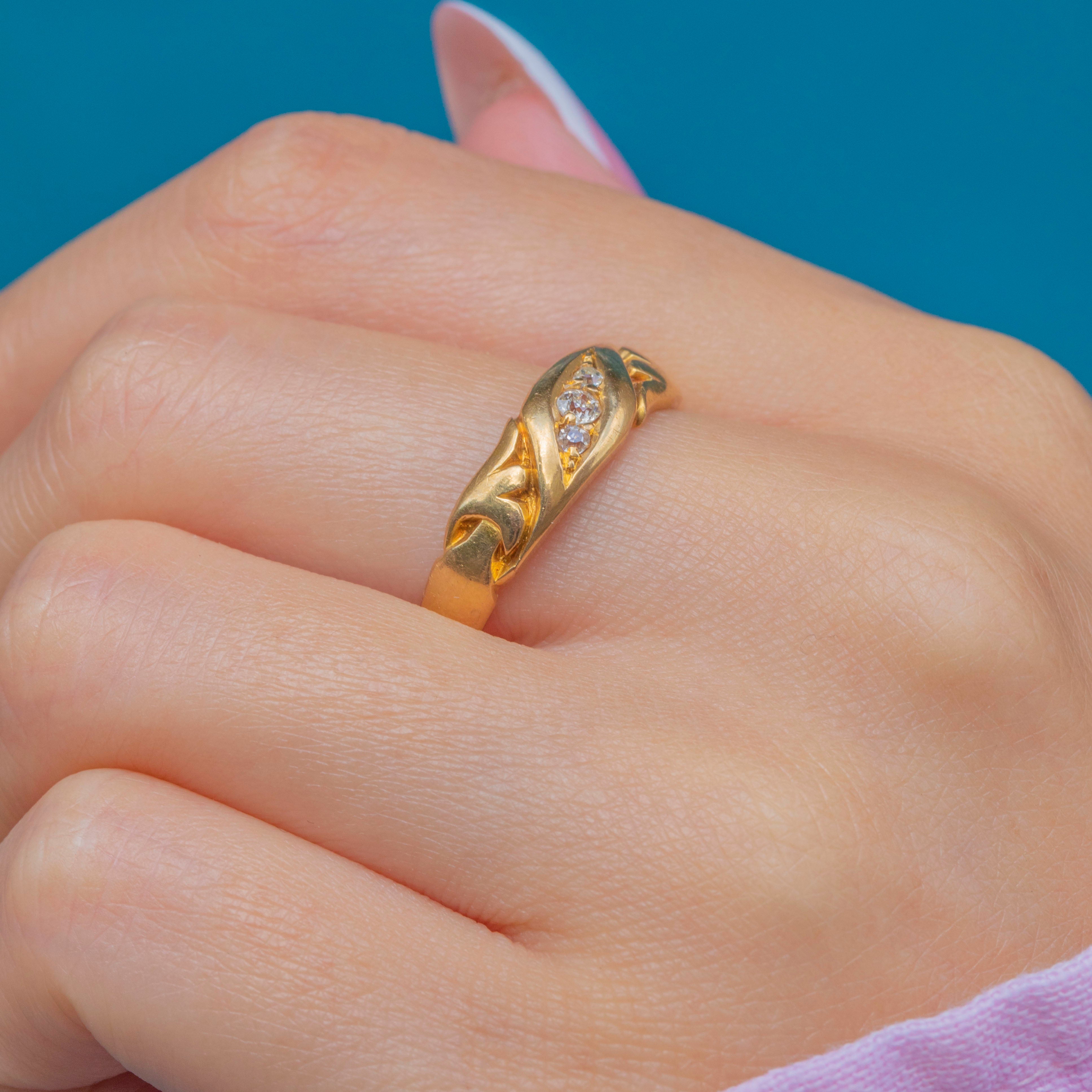 Crafted from bright and buttery 18ct Gold, this antique gypsy ring radiates Edwardian charm throughout. In its centre sit three graduating Diamonds nestled within ornate settings, creating an elegant design in true Edwardian style.