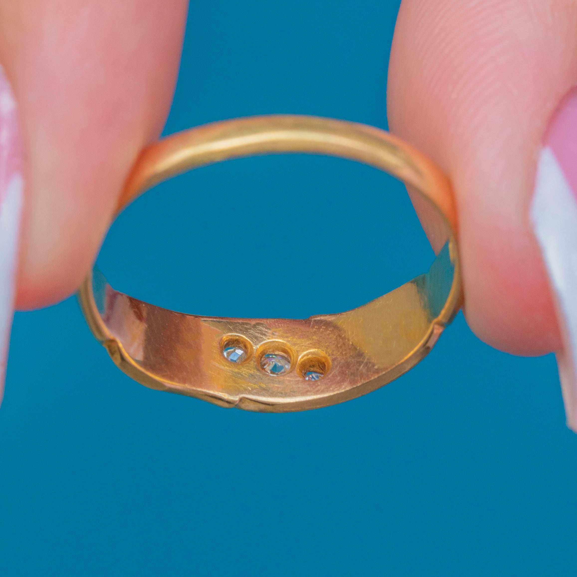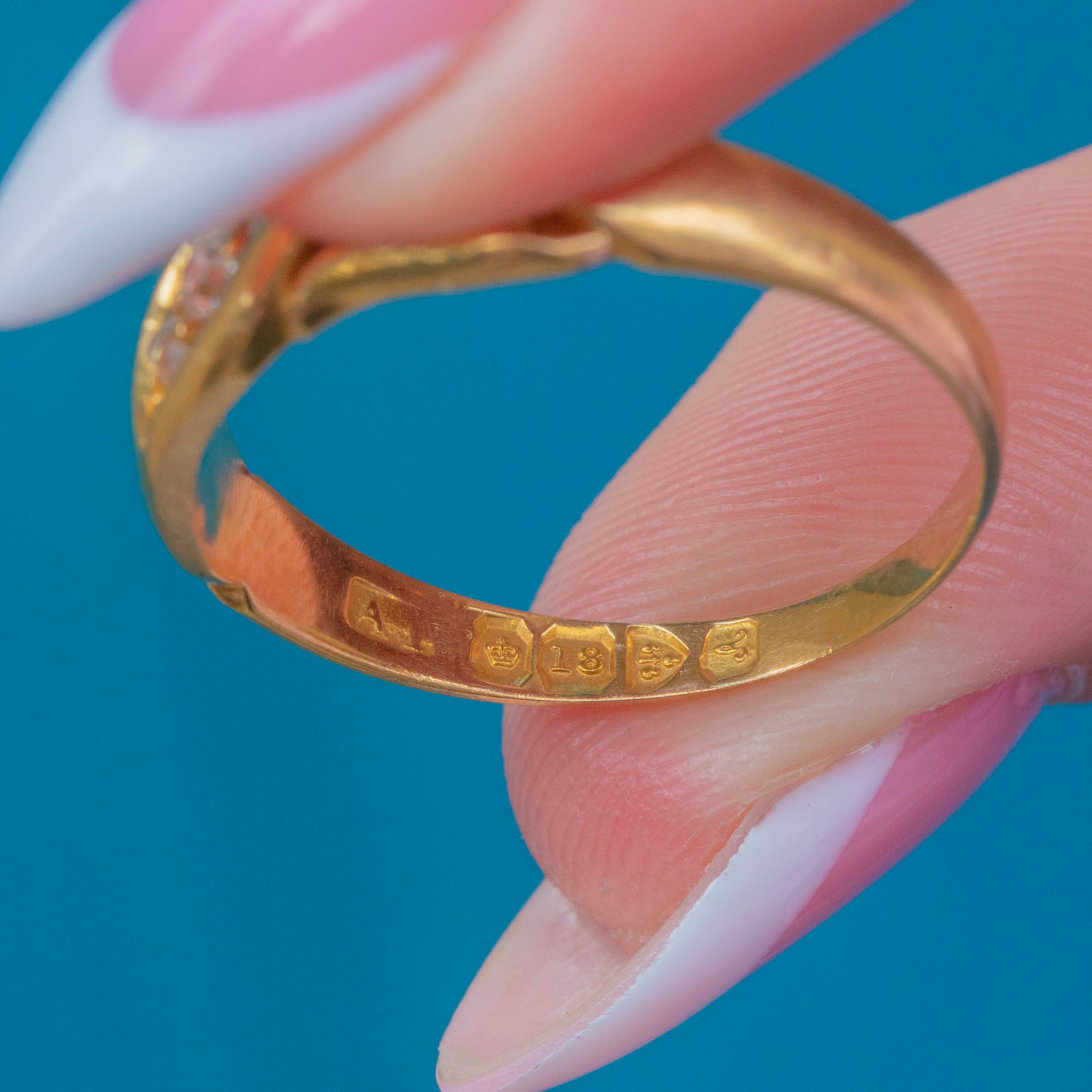 EXCELLENT: The Gold is bright and buttery, with the glossy band providing a comfortable wear. Each Diamond is radiant and securely set. Complete with a full set of hallmarks, including the rare Chester Assay, this Edwardian gypsy ring is a must-have!