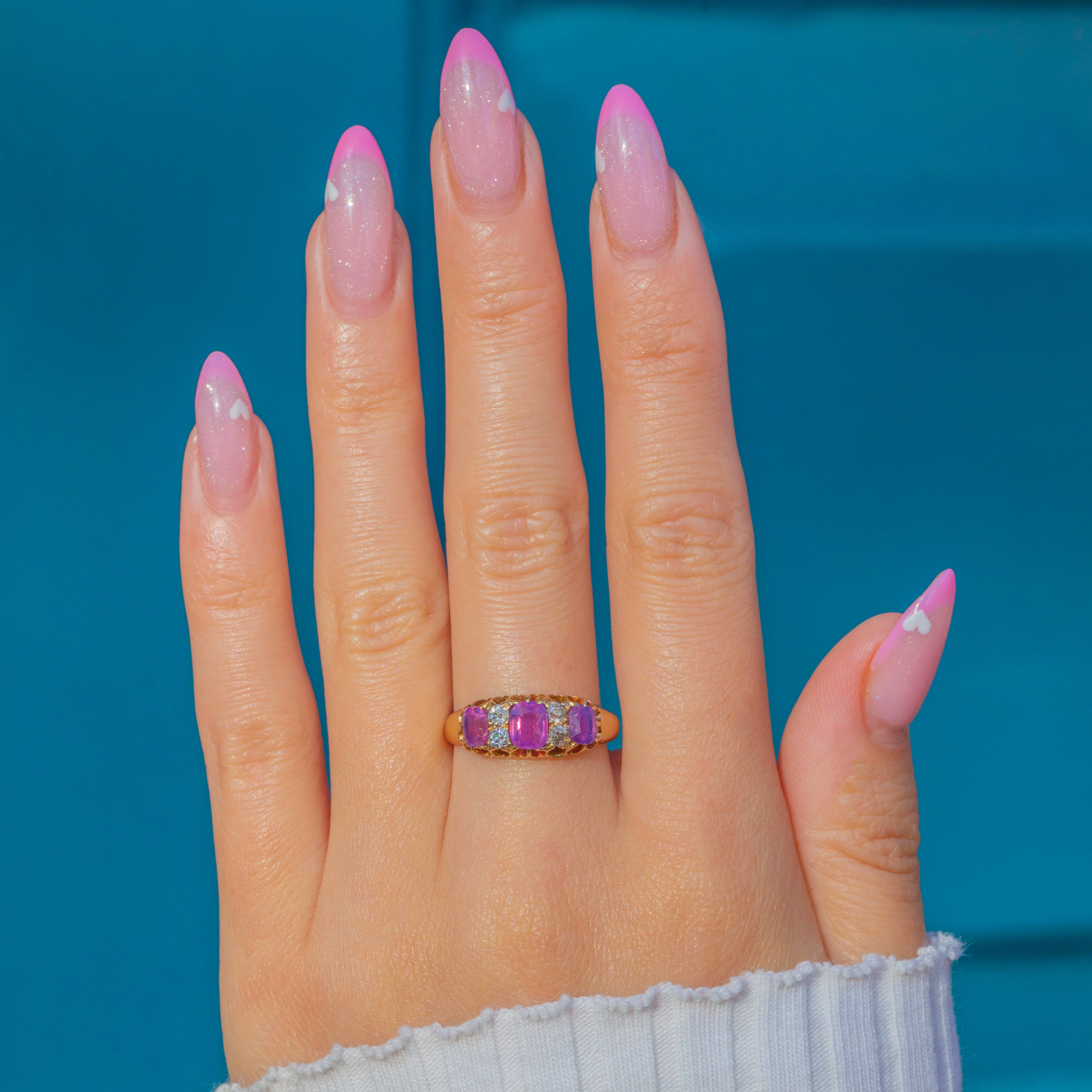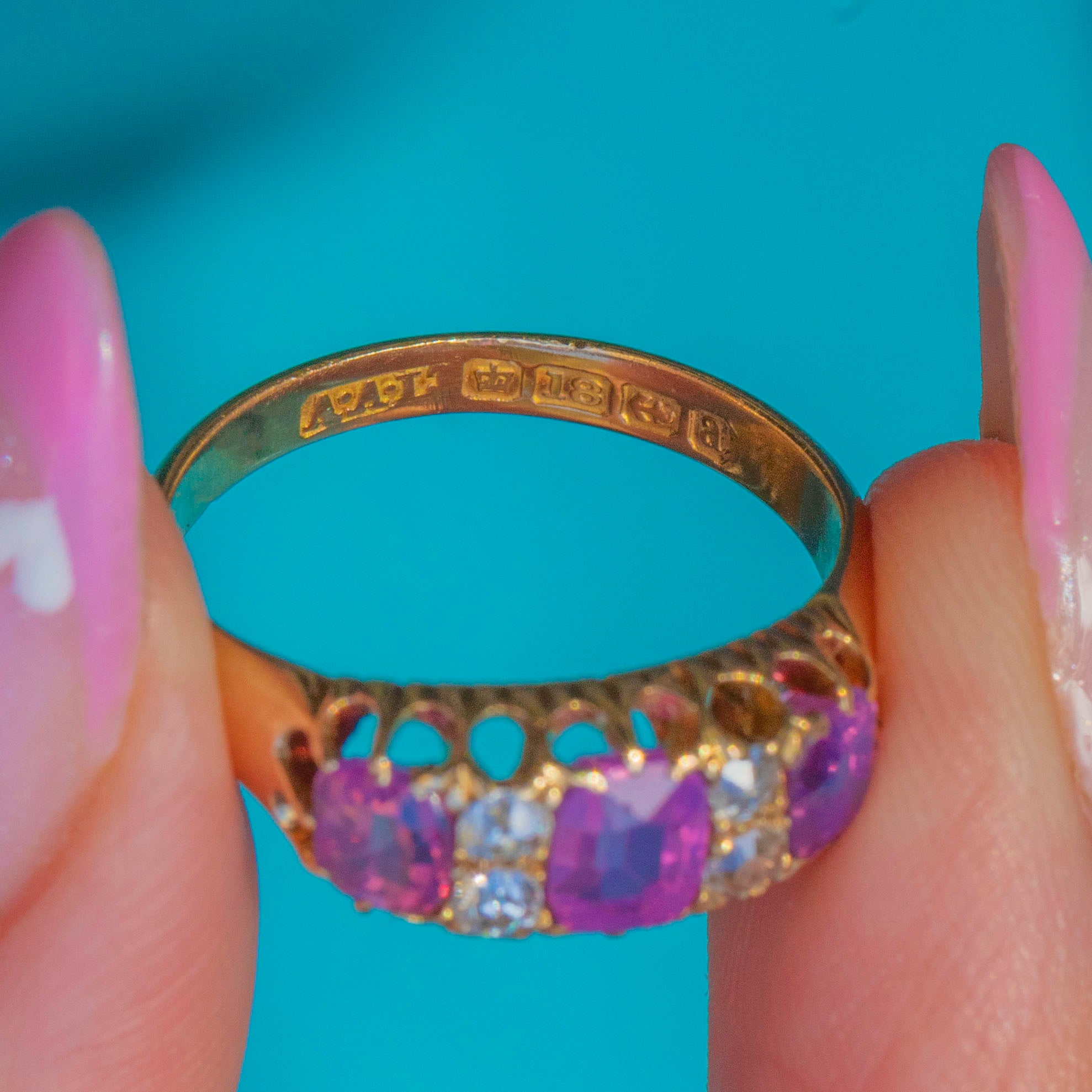 A stunning Edwardian seven-stone ring crafted in 18ct Gold, set with a beautiful row of vibrant fuchsia Rubies adding up to 1.45ct interspersed with twinkling old-cut Diamonds. The combination of vivid colour and sparkle makes this piece both eye-catching and timeless.
