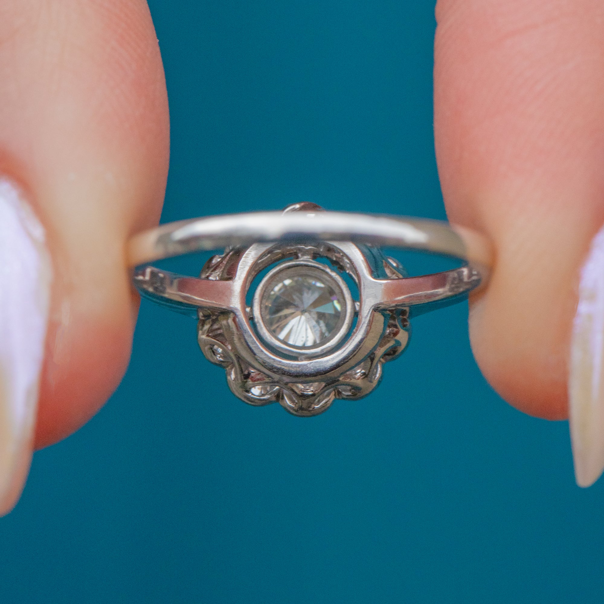 The central round brilliant Diamond is 0.25ct, surrounded by a halo of Diamonds that bring the total weight of this ring to 0.55ct! Sparkling impeccably, this striking ring is a classic early 20th-century design that is equally as loved now.