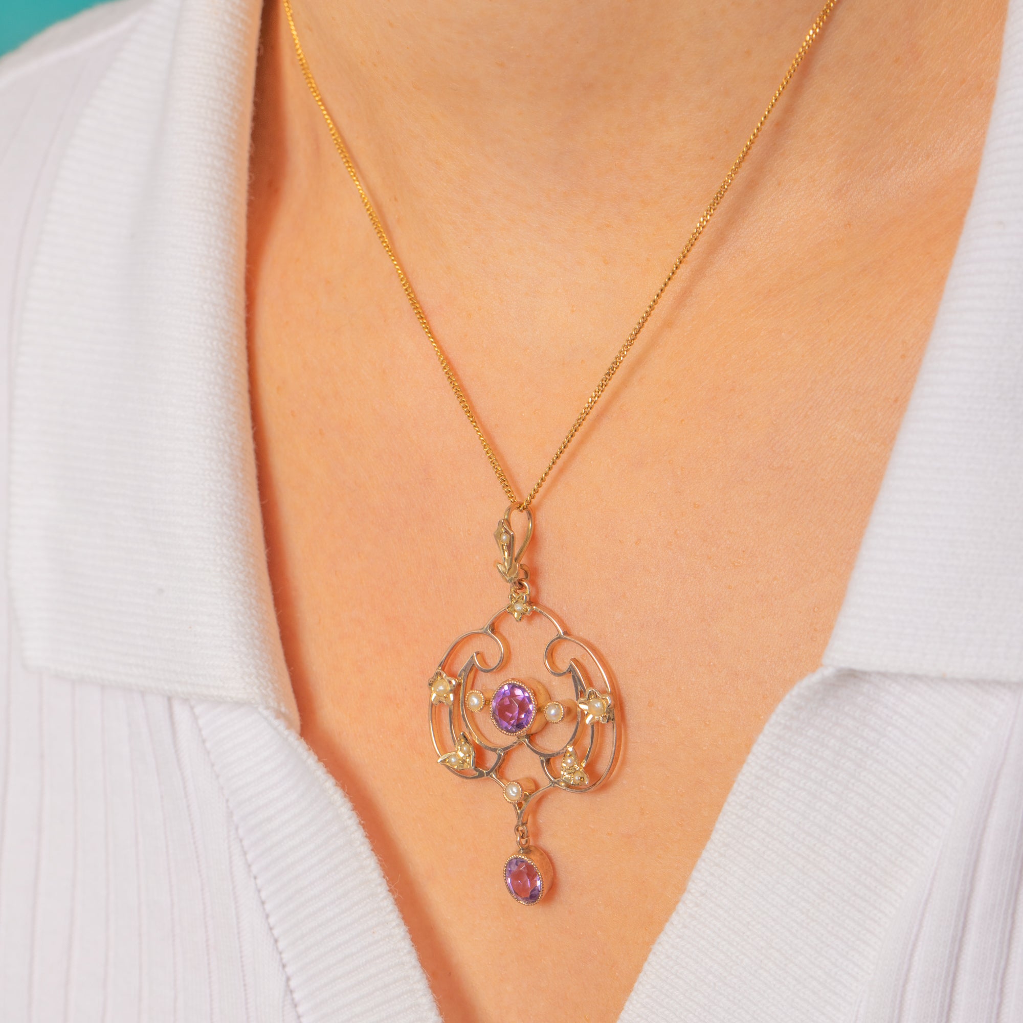 This exquisite Edwardian lavalier pendant captures the delicate elegance of early 20th-century design. Crafted in 9ct Gold, it features two glowing Amethysts framed by creamy Seed Pearls in a graceful openwork design.