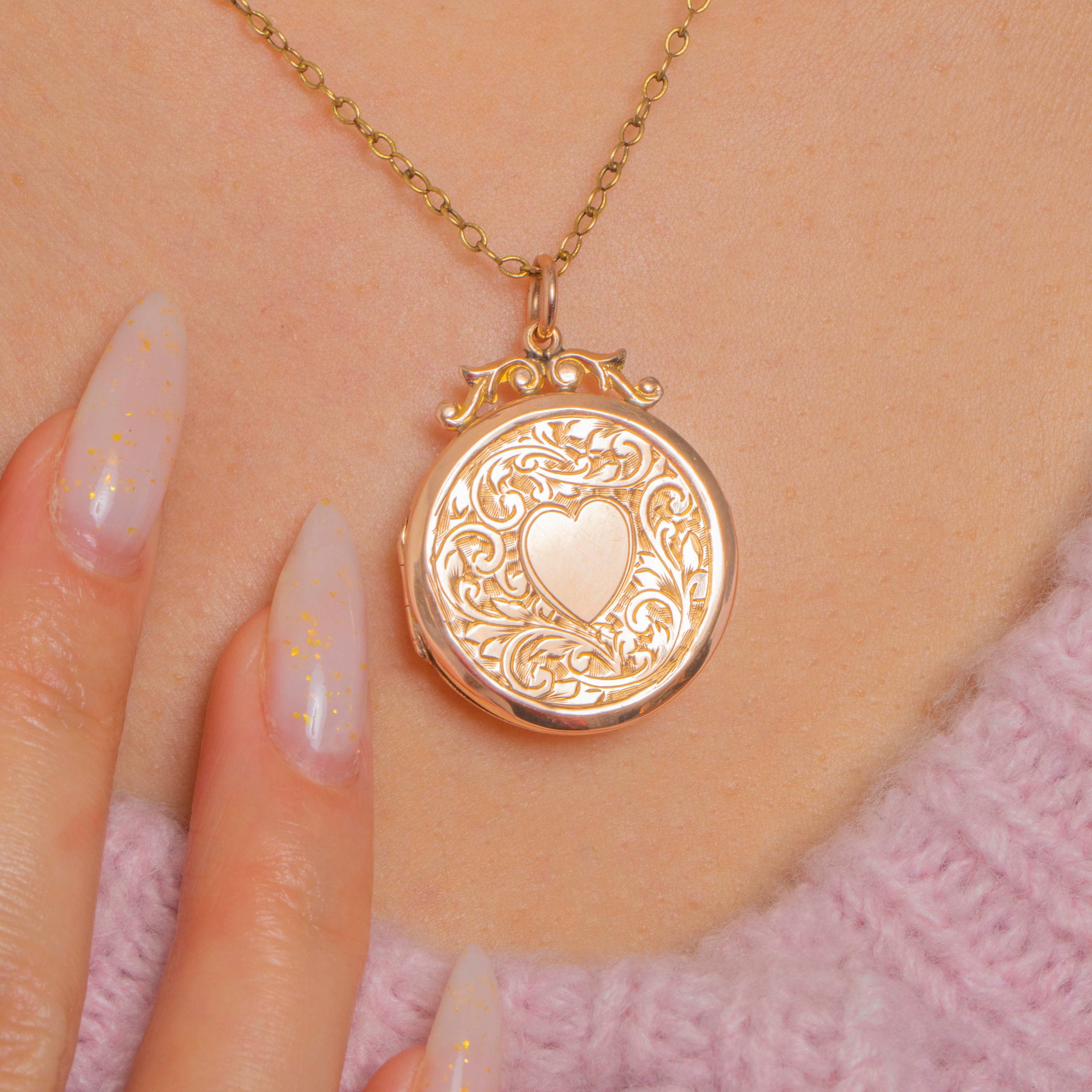 Romance in miniature, this Edwardian round locket is crafted in 9ct Gold Back & Front with a gentle rosy hue. Its face is richly adorned with scrolling foliate engraving over an engine-turned ground, framing a polished heart cartouche ready for a personal touch. An ornate pierced scroll bale completes the elegant, sentimental feel.