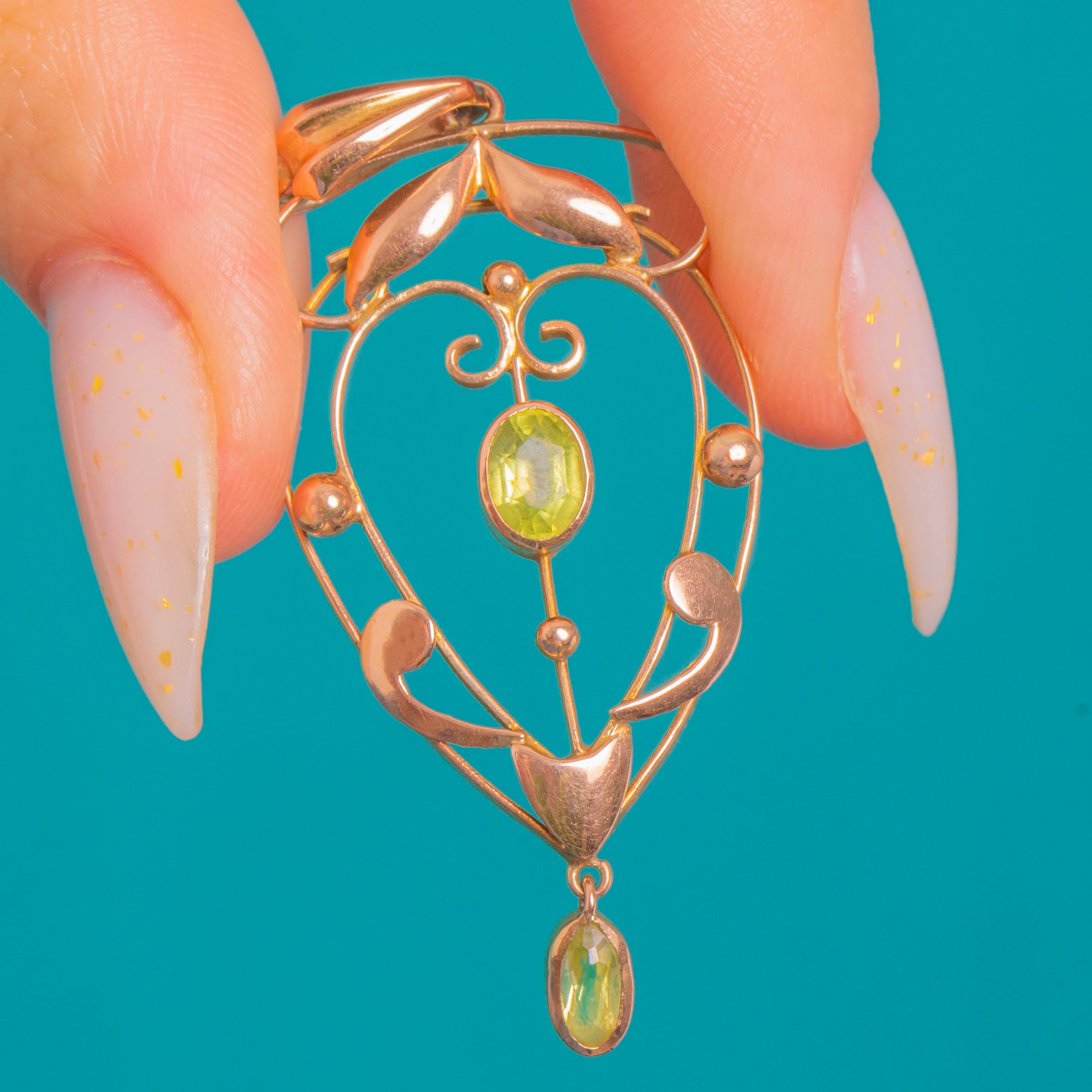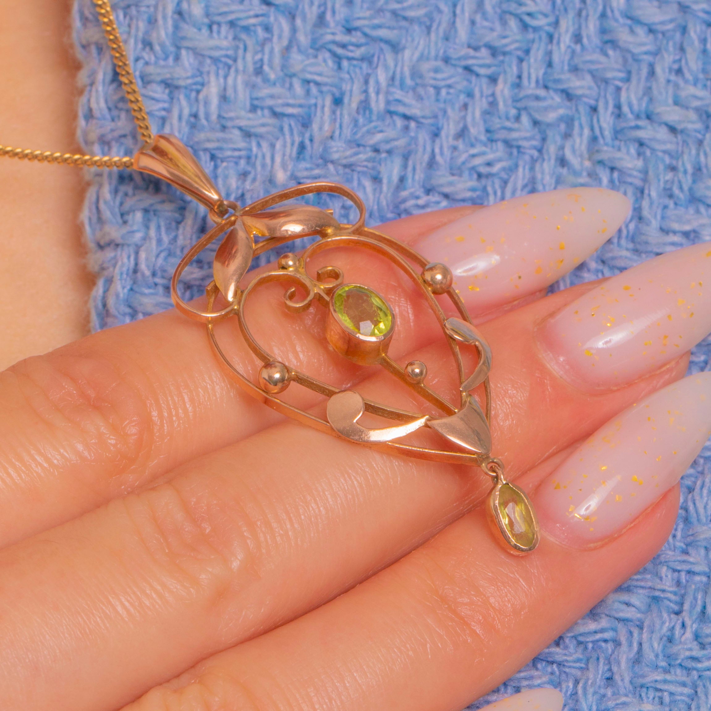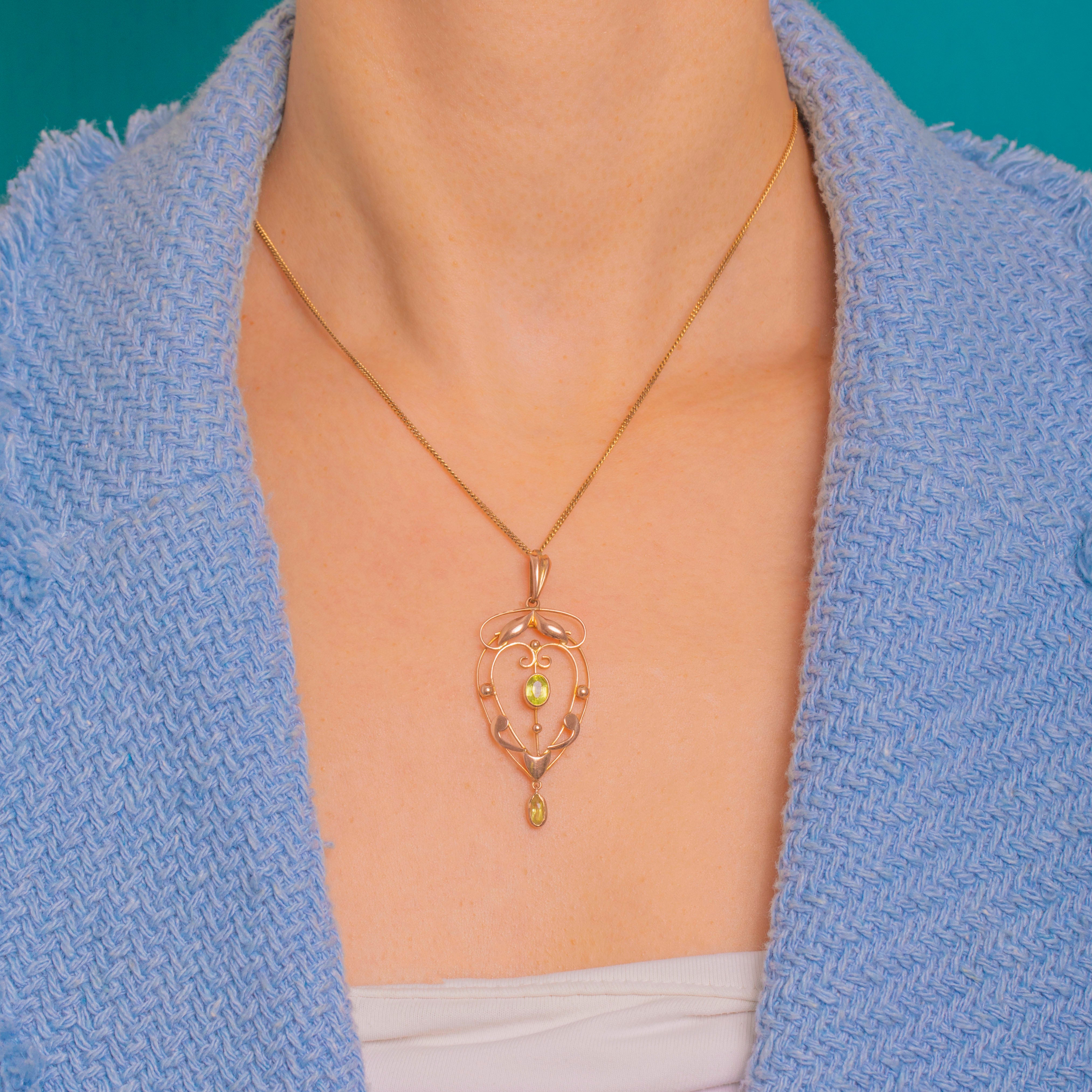 A romantic Edwardian lavalier pendant crafted in 9ct Gold, this piece traces graceful whiplash curves into a delicate openwork heart. Tiny foliate and bead accents add texture and movement, while a lively apple-green Peridot glows at the centre.