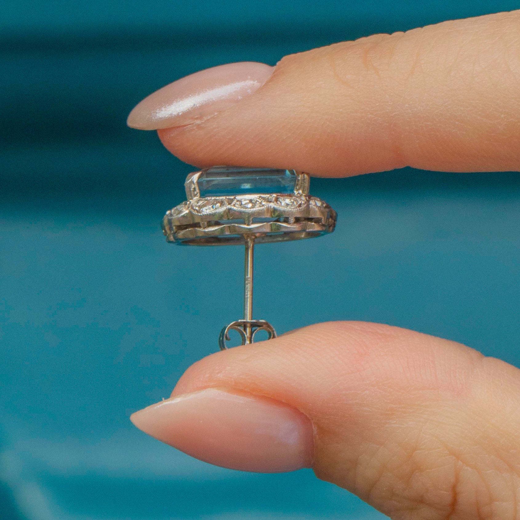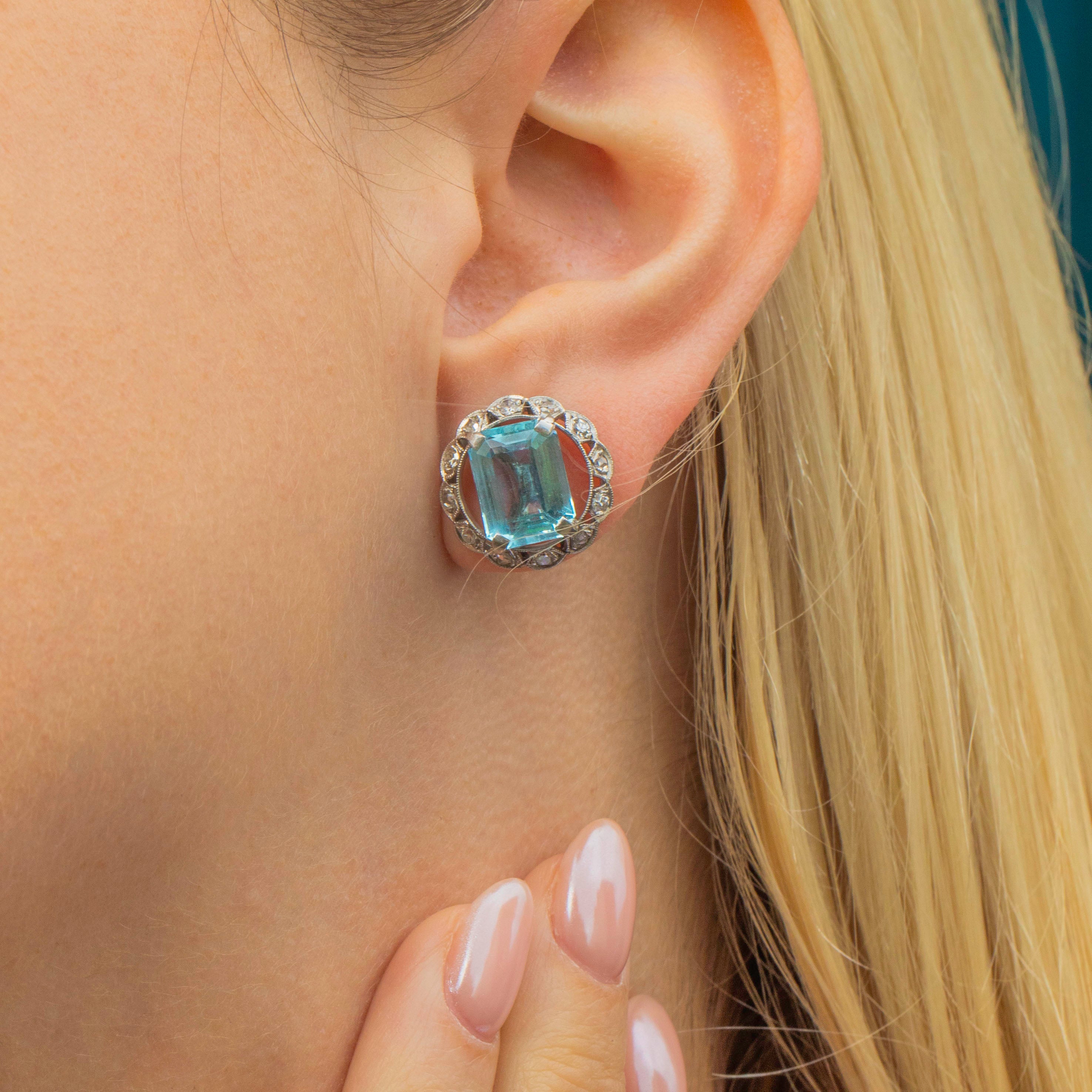 MATERIALS: Tests as Platinum earring face & butterfly backs, 9ct white Gold ear posts, Aquamarine (9.20ct), Diamonds (0.35ct).