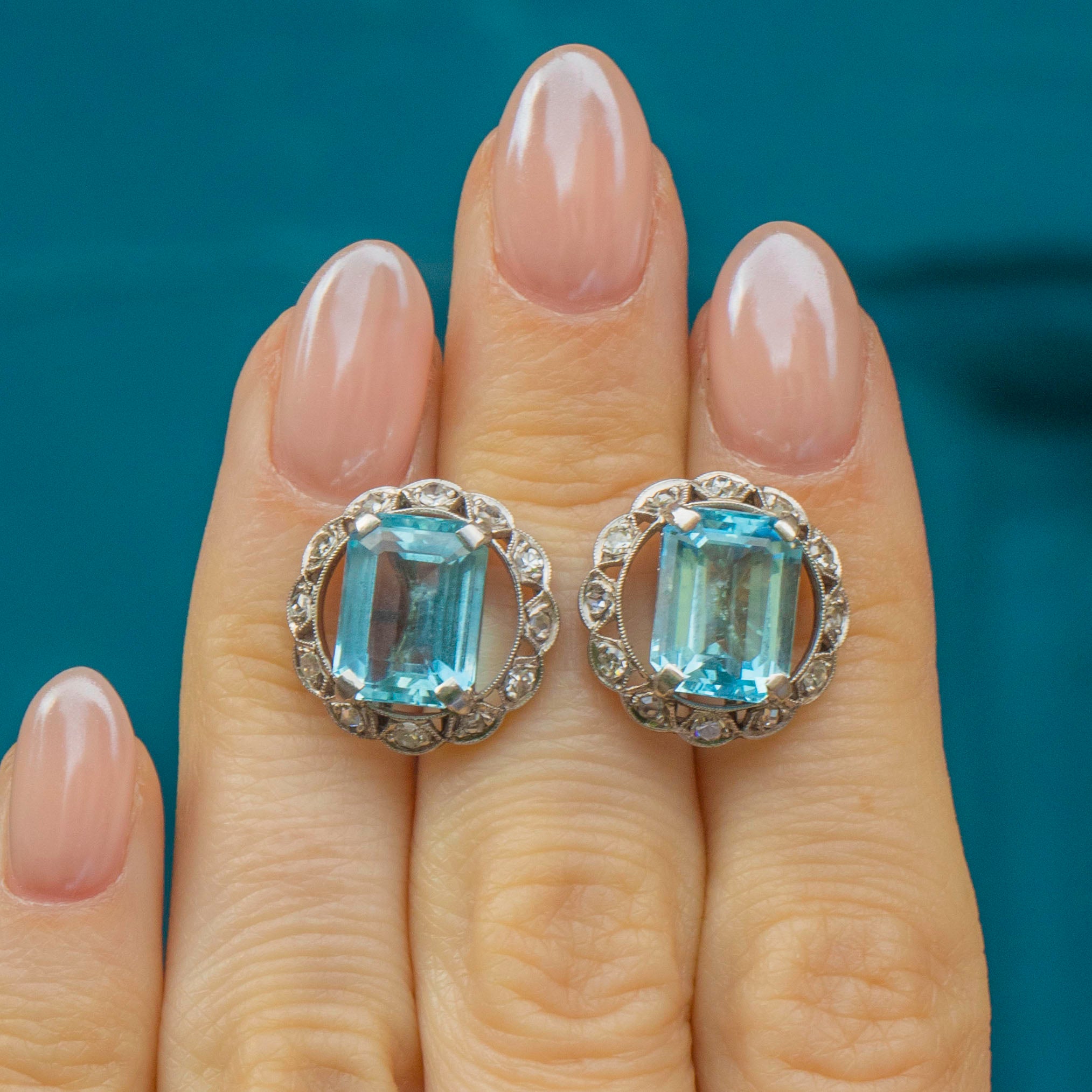 We can see these Edwardian Aquamarine Diamond cluster earrings adorning the ear of any ice princess! Centred by Emerald cut Aquamarine, with a combined carat weight of 9.20ct, their glacial hues glisten from top to bottom.