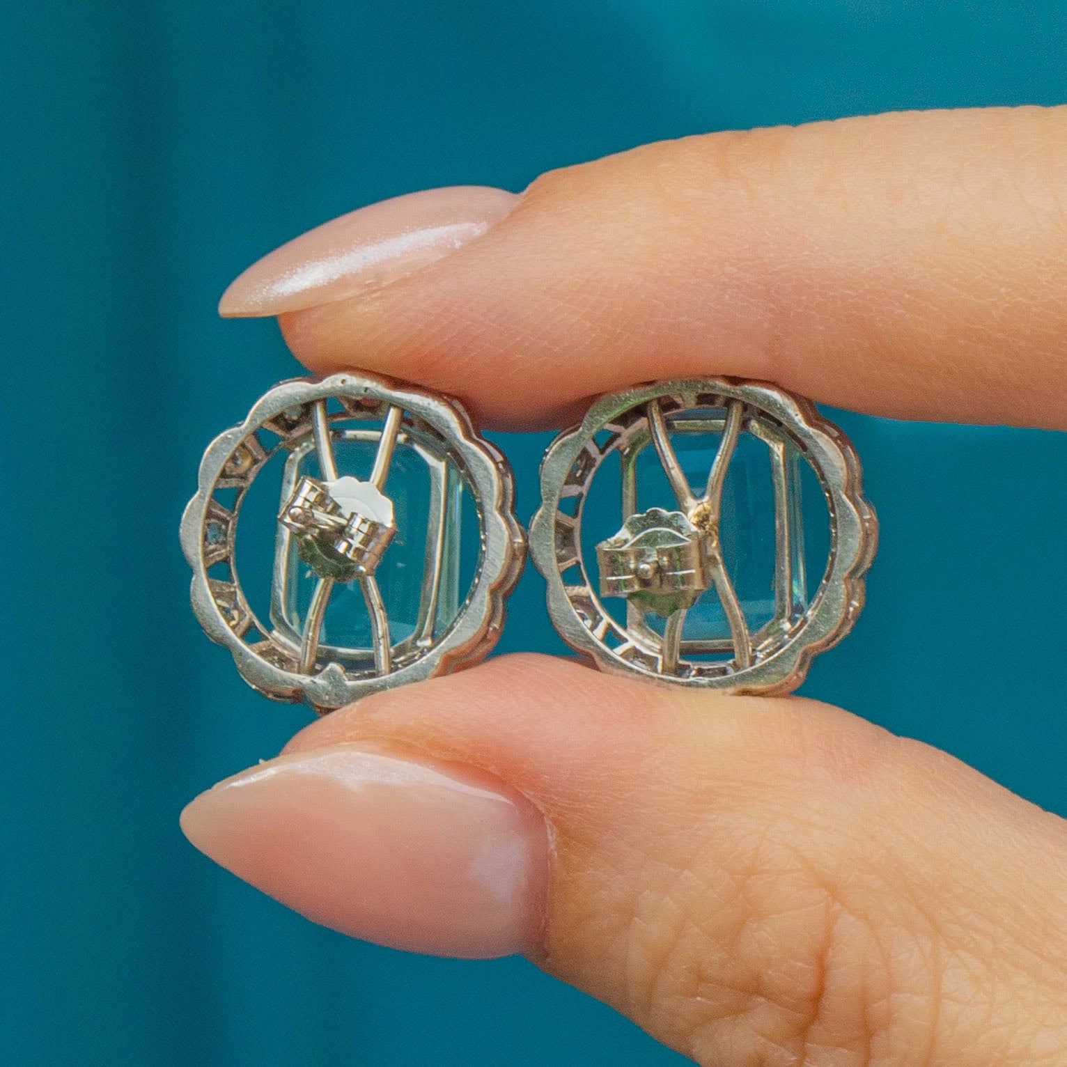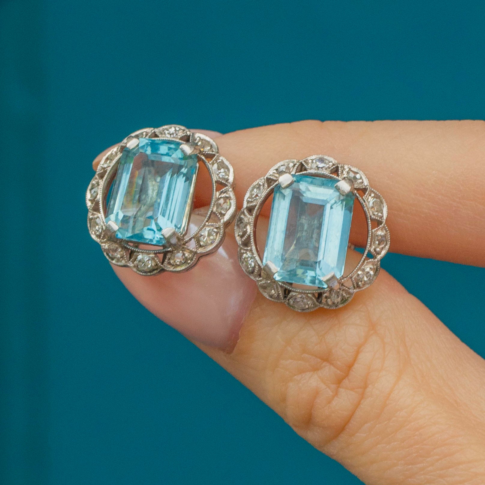 EXCELLENT. We are pleased to present these Edwardian Aquamarine Diamond cluster earrings in excellent condition. The Aquamarine and surrounding Diamonds are secure in their setting, flaunting beautiful icy tones, with no damage to note. The structural integrity of these earrings has stood the test of time, remaining robust, and sit comfortably in the lobe. With securely soldered ear posts and tightly fitting butterfly backs, you can wear these antique Aquamarine studs with confidence!