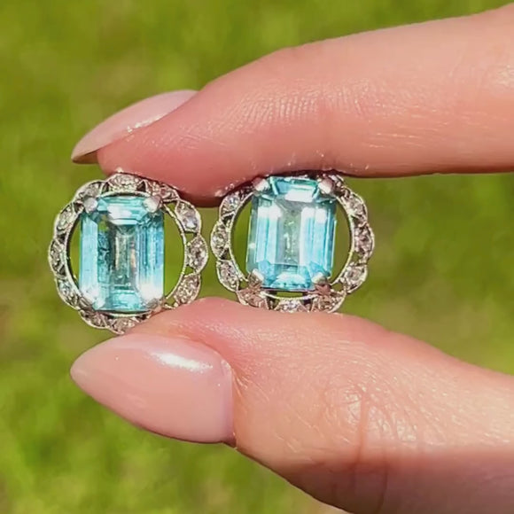 Edwardian Aquamarine Diamond Cluster Earrings, 9.20ct Aquamarine