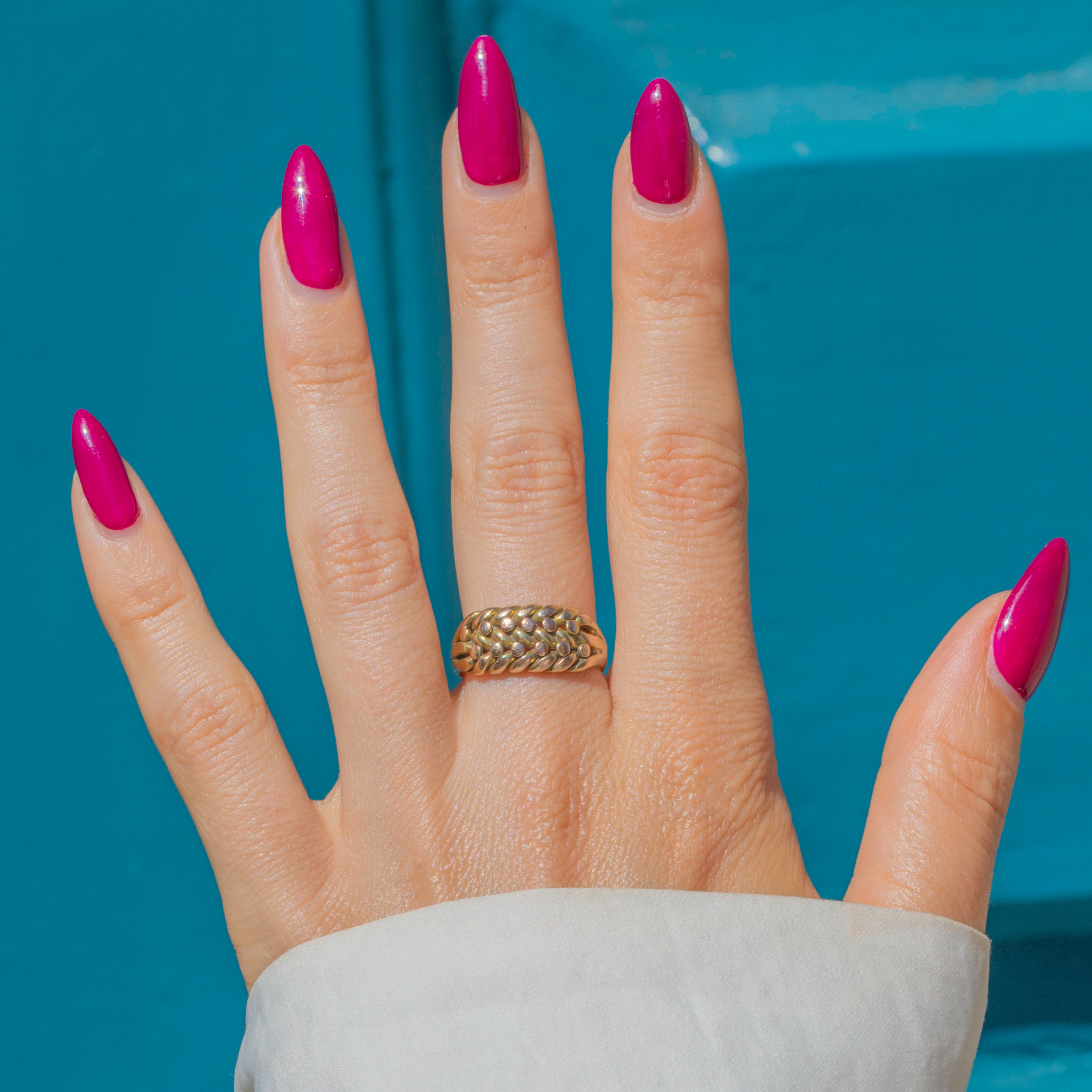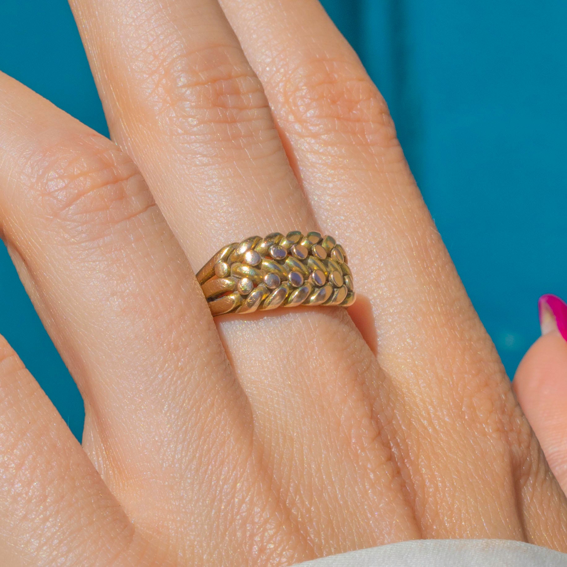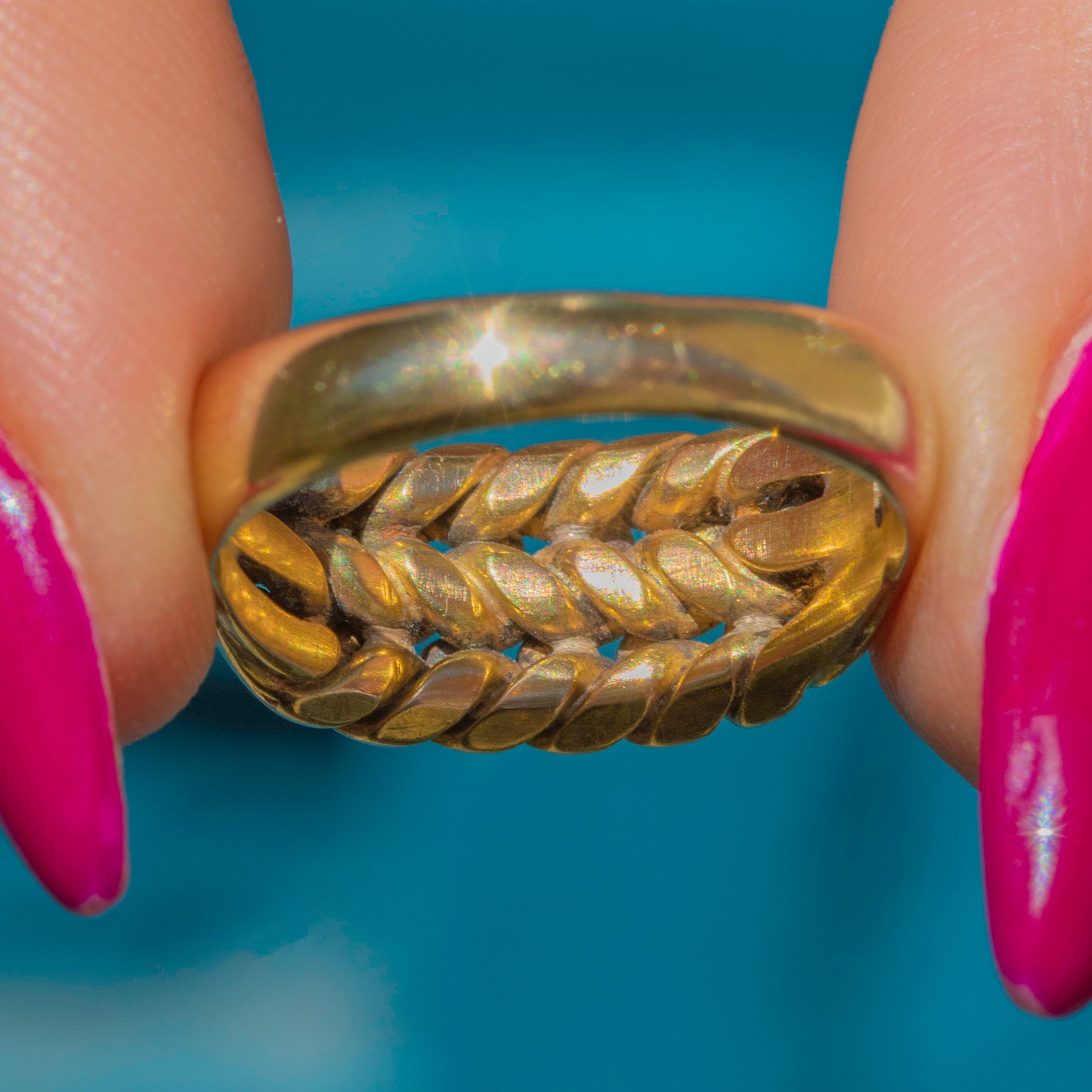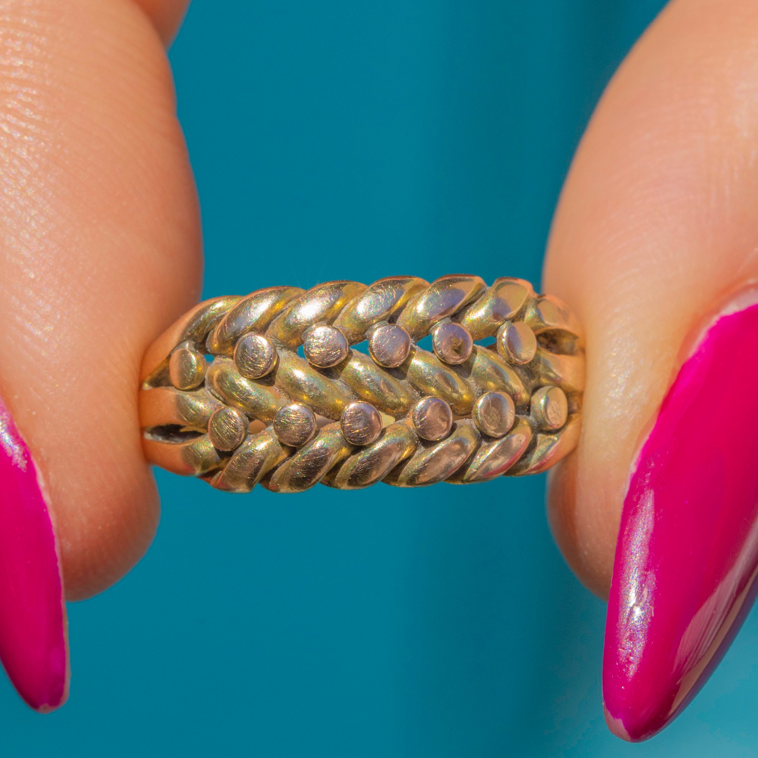 This genuine antique keeper ring was handcrafted in 1902 from bright and buttery 9ct Gold. Weighing a hefty 4.8g, this ring is a chunky delight and displays a typical woven or plaited design across its front.