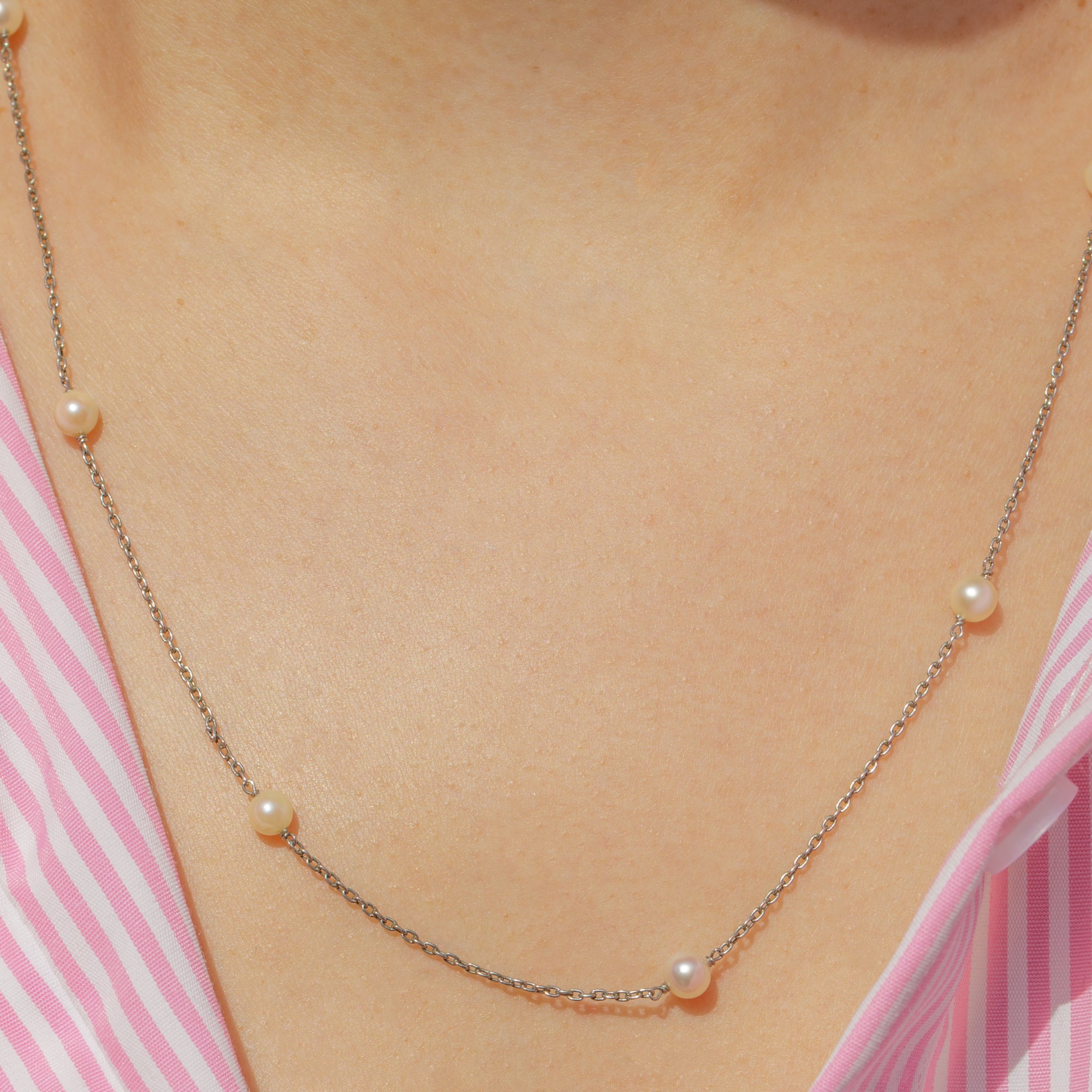 This Edwardian Platinum Pearl station necklace will bring undeniable elegance to your repertoire! The Platinum links are dainty and lustrous, giving the chain a delicate appeal, and are decorated with Pearl "stations" adding an iridescent shimmer.