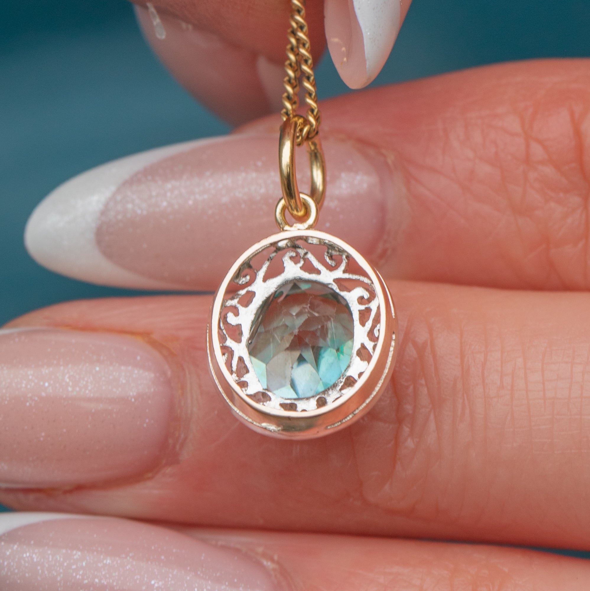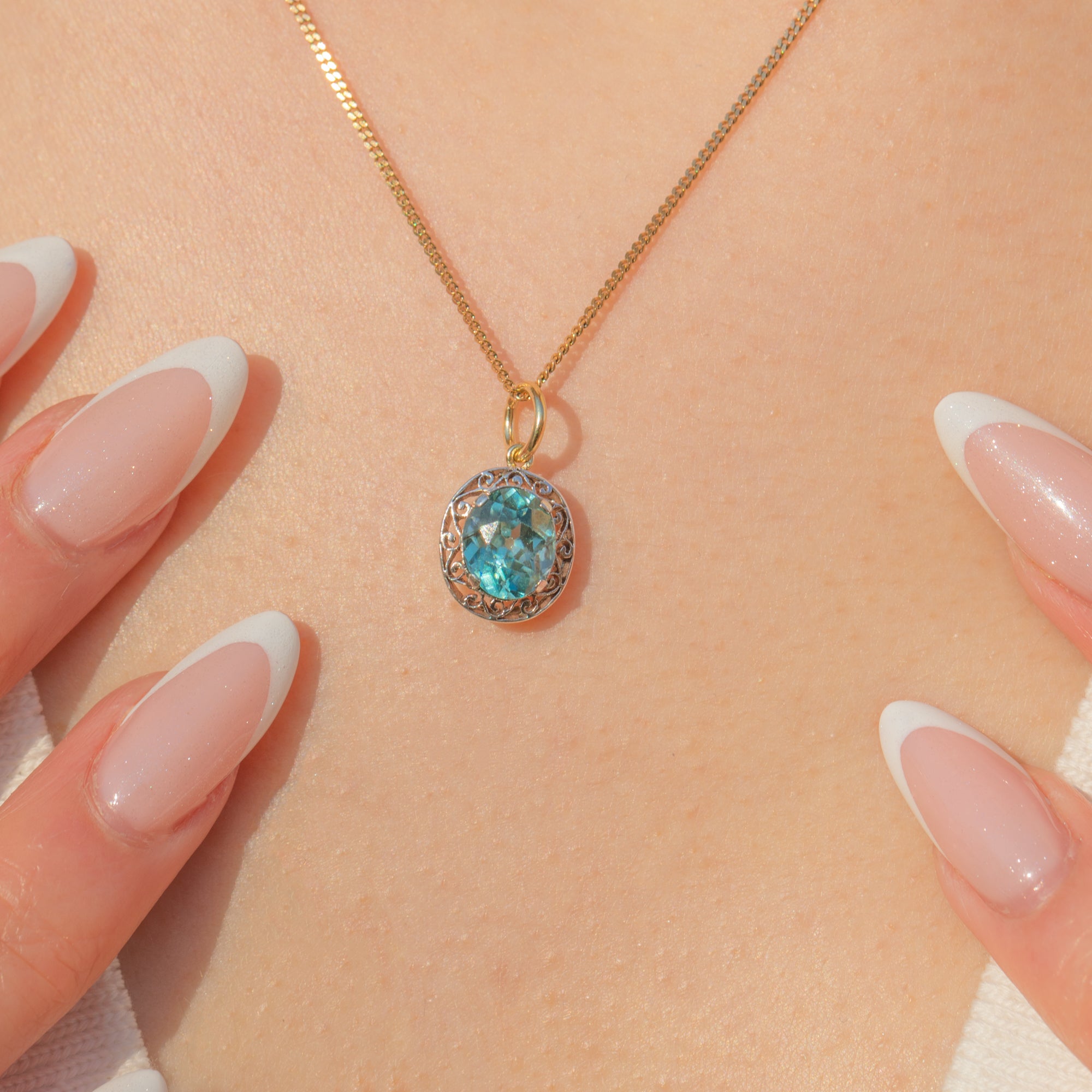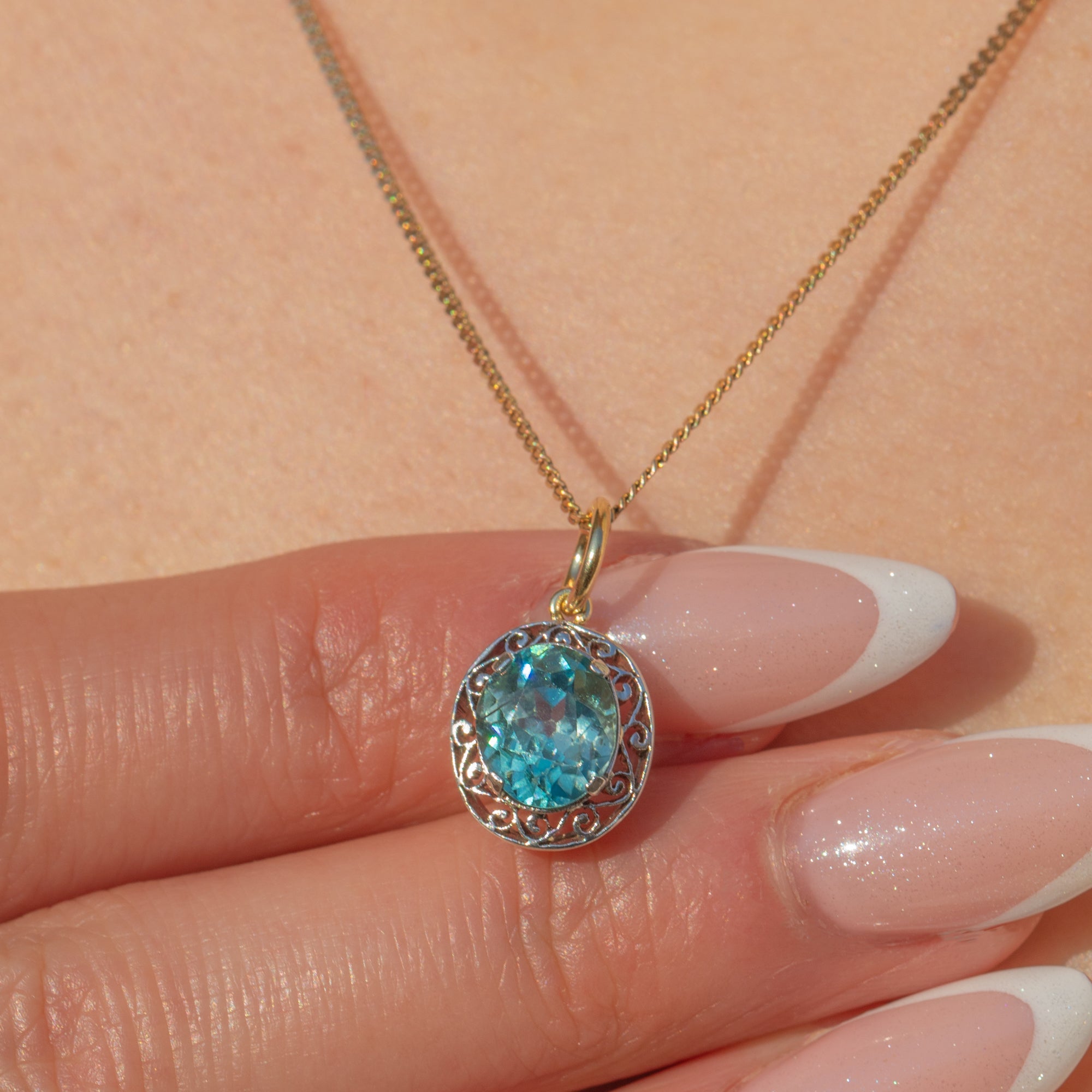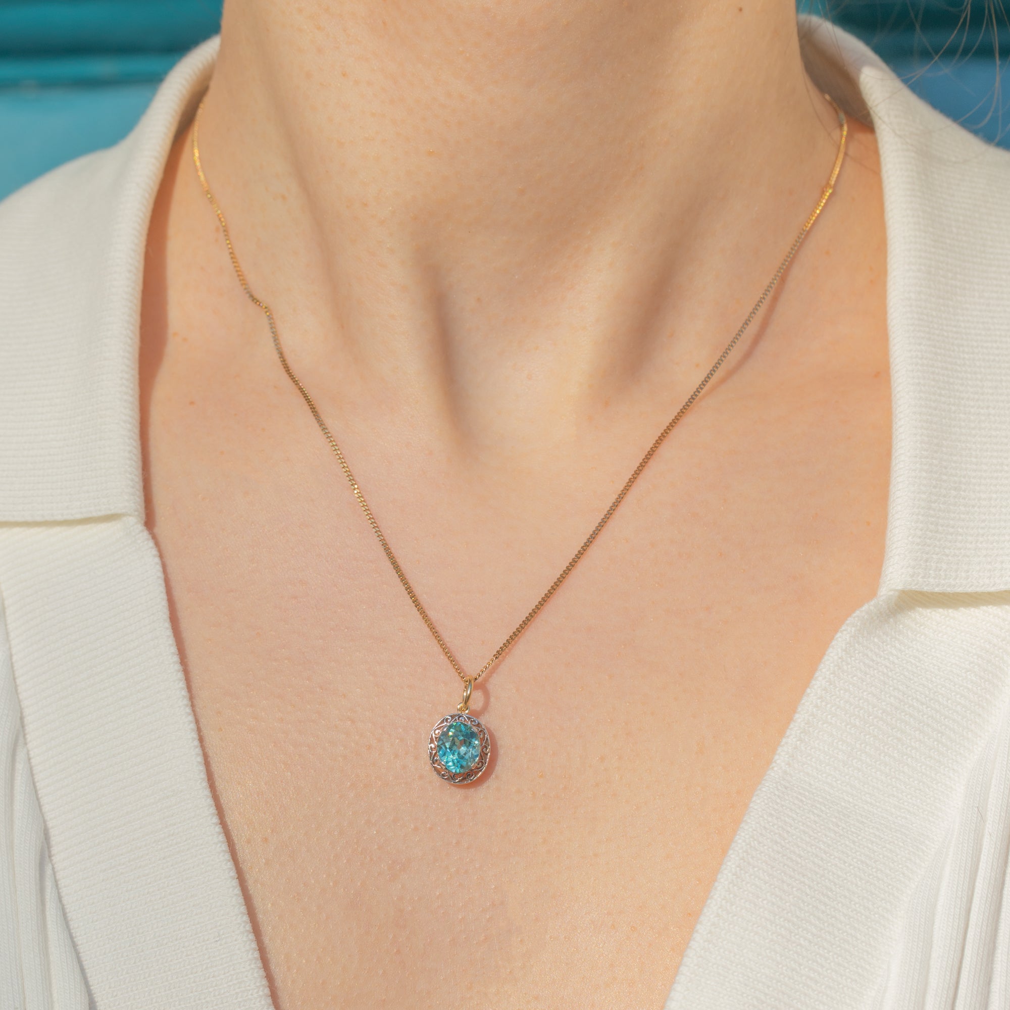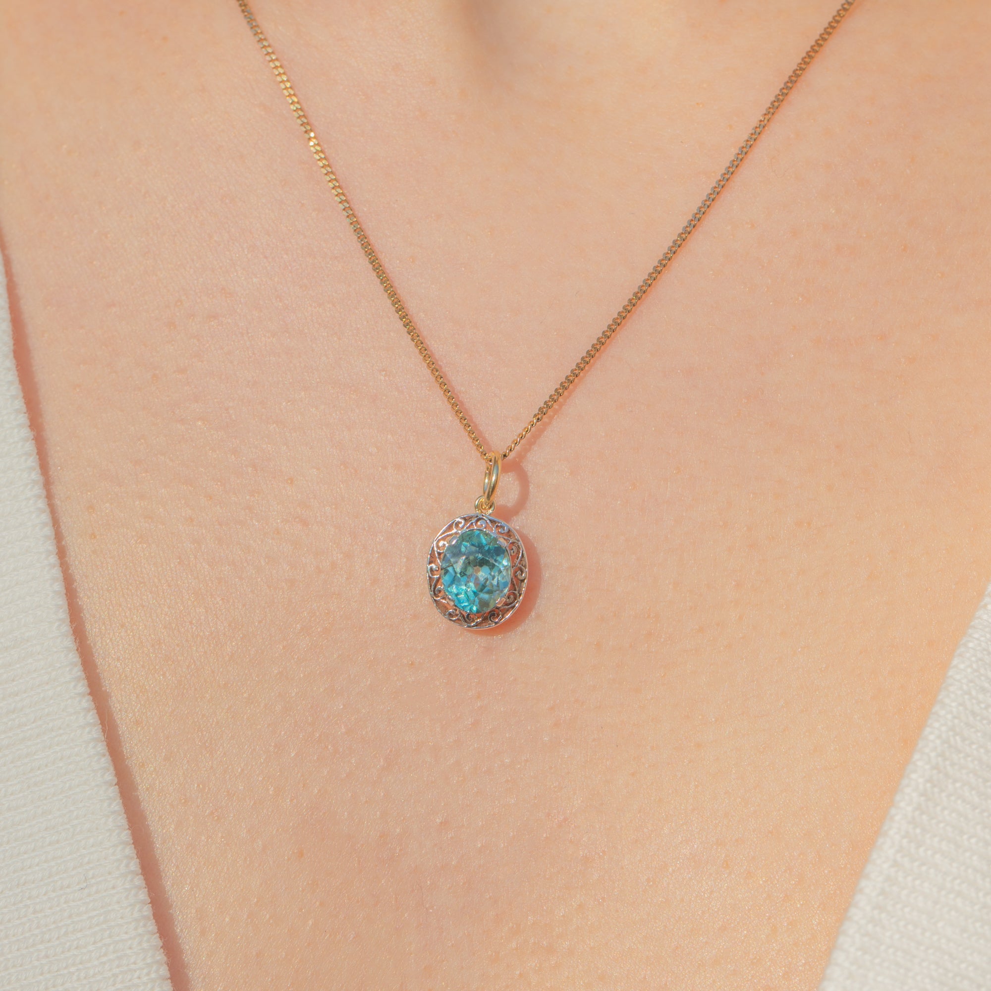 Add a glimmering accent to your décolletage with this striking Edwardian Silver & 9ct Gold Blue Zircon charm! The 1.70ct Zircon boasts crisp facets that dance in the light, beaming with icy blue hues, and is haloed by a decorative Silver filigree border.