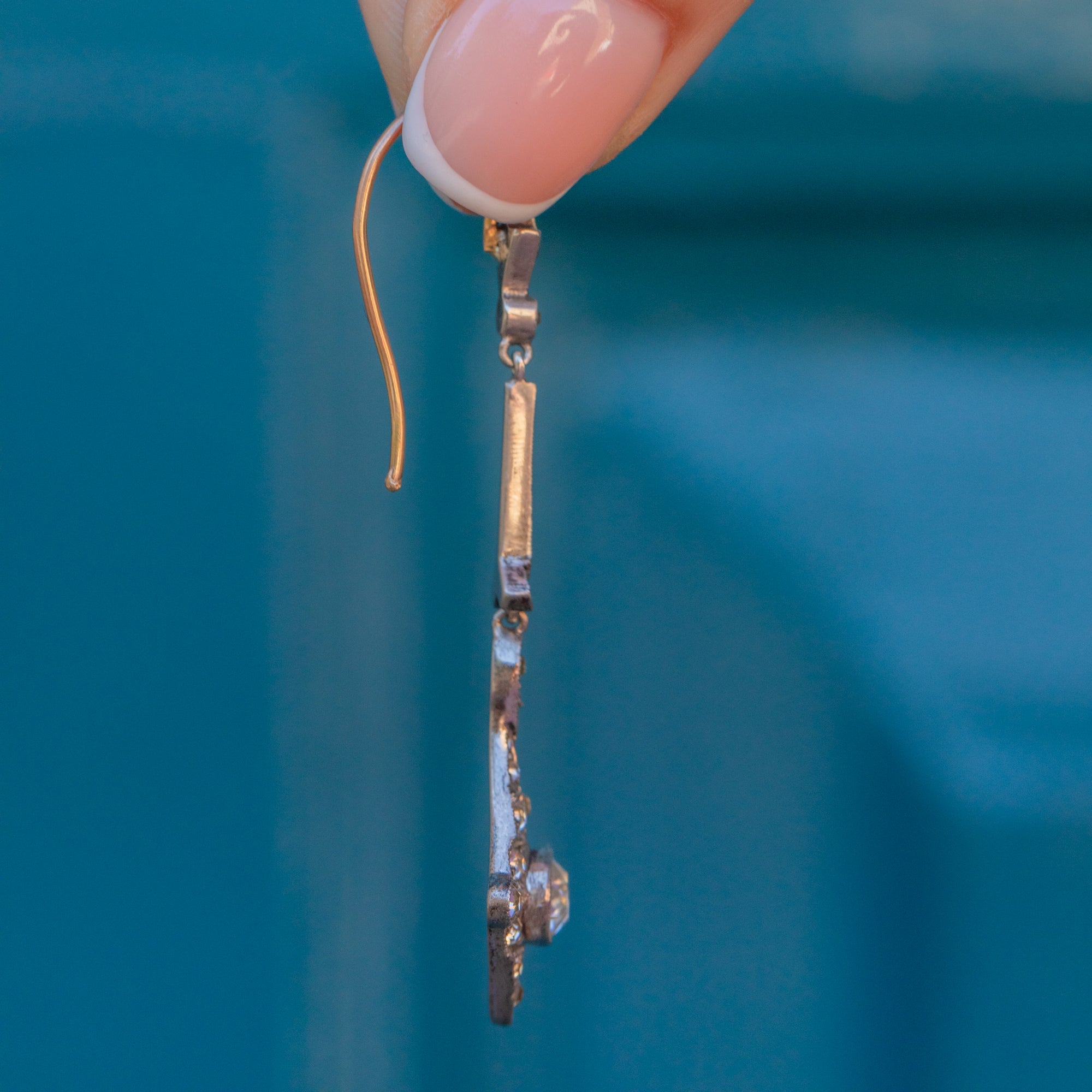 VERY GOOD-EXCELLENT. These Art Deco Paste drop earrings are in very good to excellent condition. The paste are all present and secure, with a mesmerising sparkle throughout. The Silver is sturdy and only showcases some subtle wear to the back, which cannot be seen when worn. The 9ct Gold hooks are securely soldered nd sit comfortably in the ear. You won't want to take these Vintage earrings off once they are in your possession!