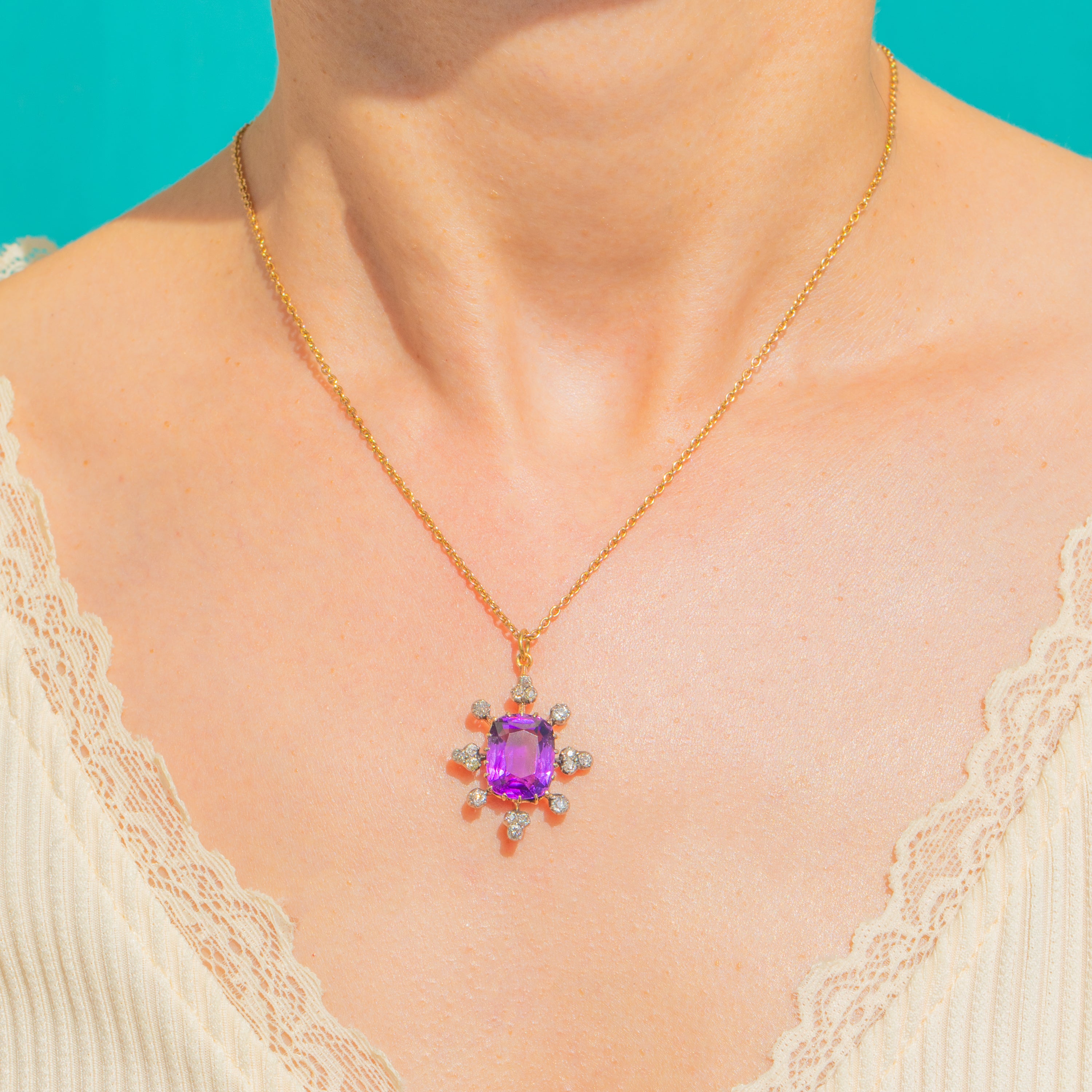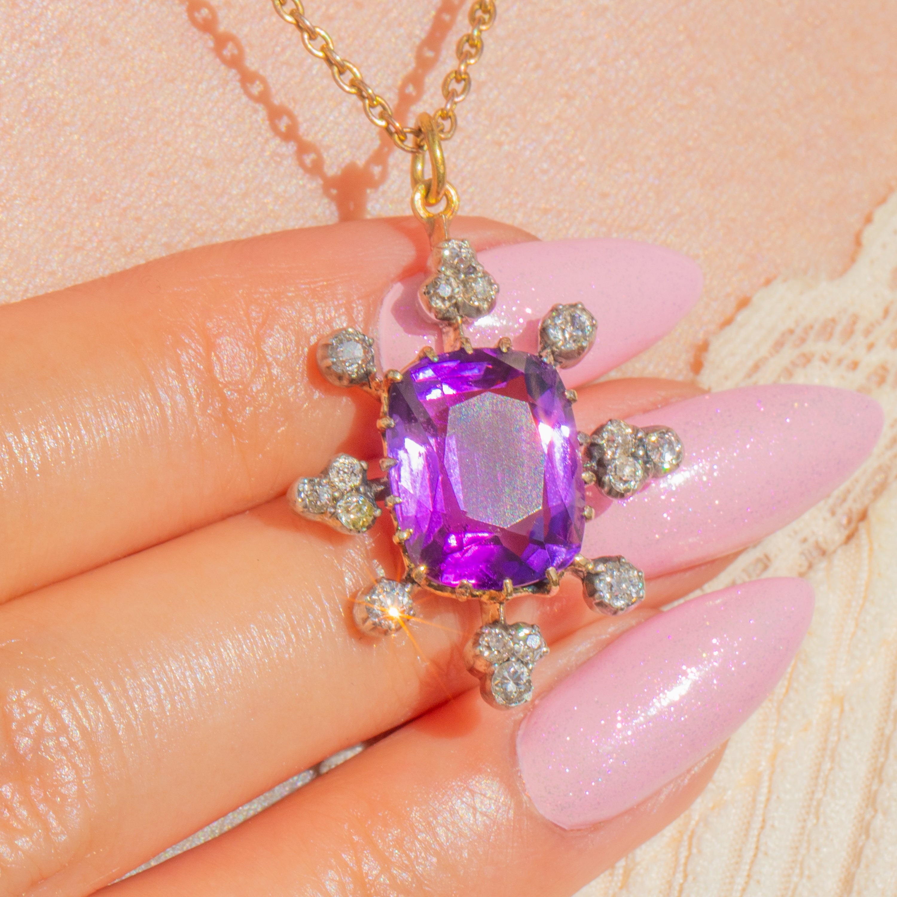 Celestial and opulent, this Late Victorian “Star” pendant centres on a sumptuous cushion-cut Amethyst of approximately 5.50 carats, its rich purple hue glowing against a radiating surround of sixteen sparkling Diamonds. Crafted in 15ct Gold, the starburst silhouette is refined with delicate trefoil terminals and Silver collets that amplify the Diamonds’ scintillation for a magical, light‑filled finish.